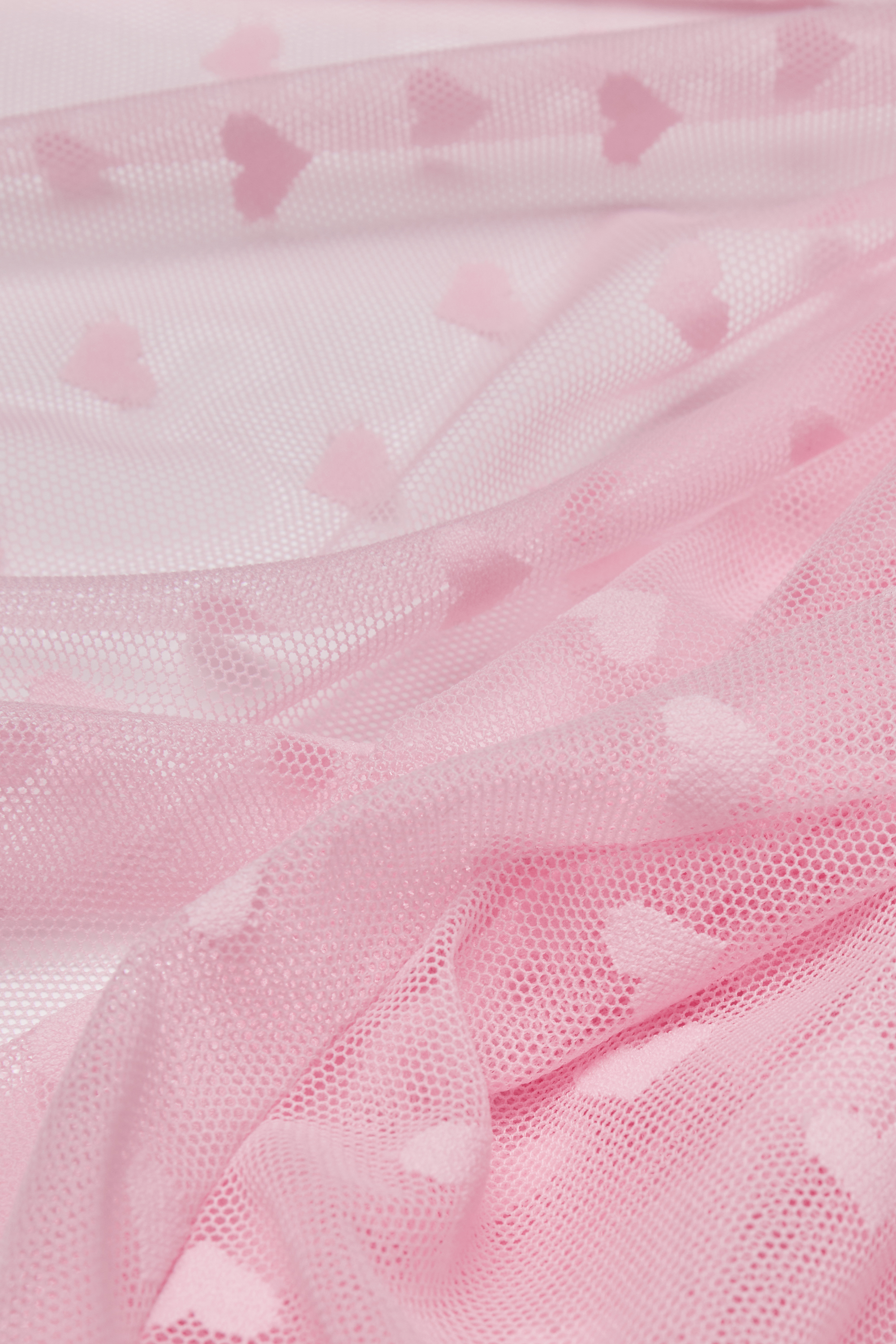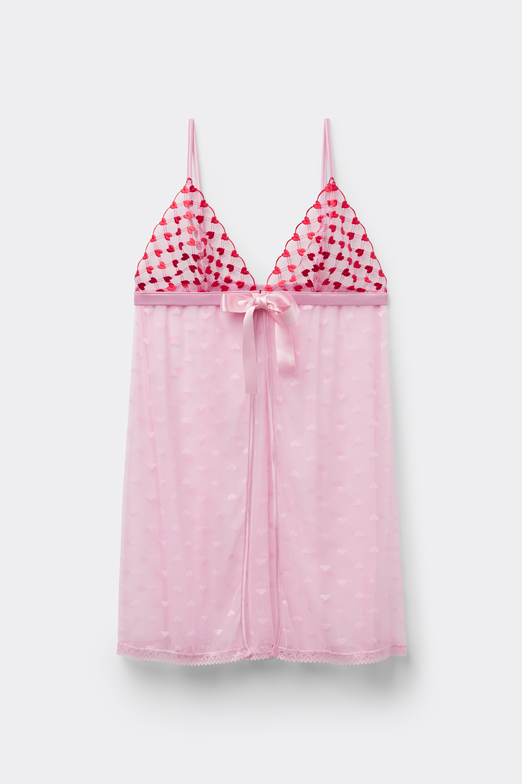 Интригующий бэби-долл из тюля с романтичным мотивом «сердечко». Изящная атласная отделка и тюль с вышивкой в виде сердечек придают модели чувственность. Съемную ленту из атласа можно использовать как кокетливый чокер или аксессуар для волос.