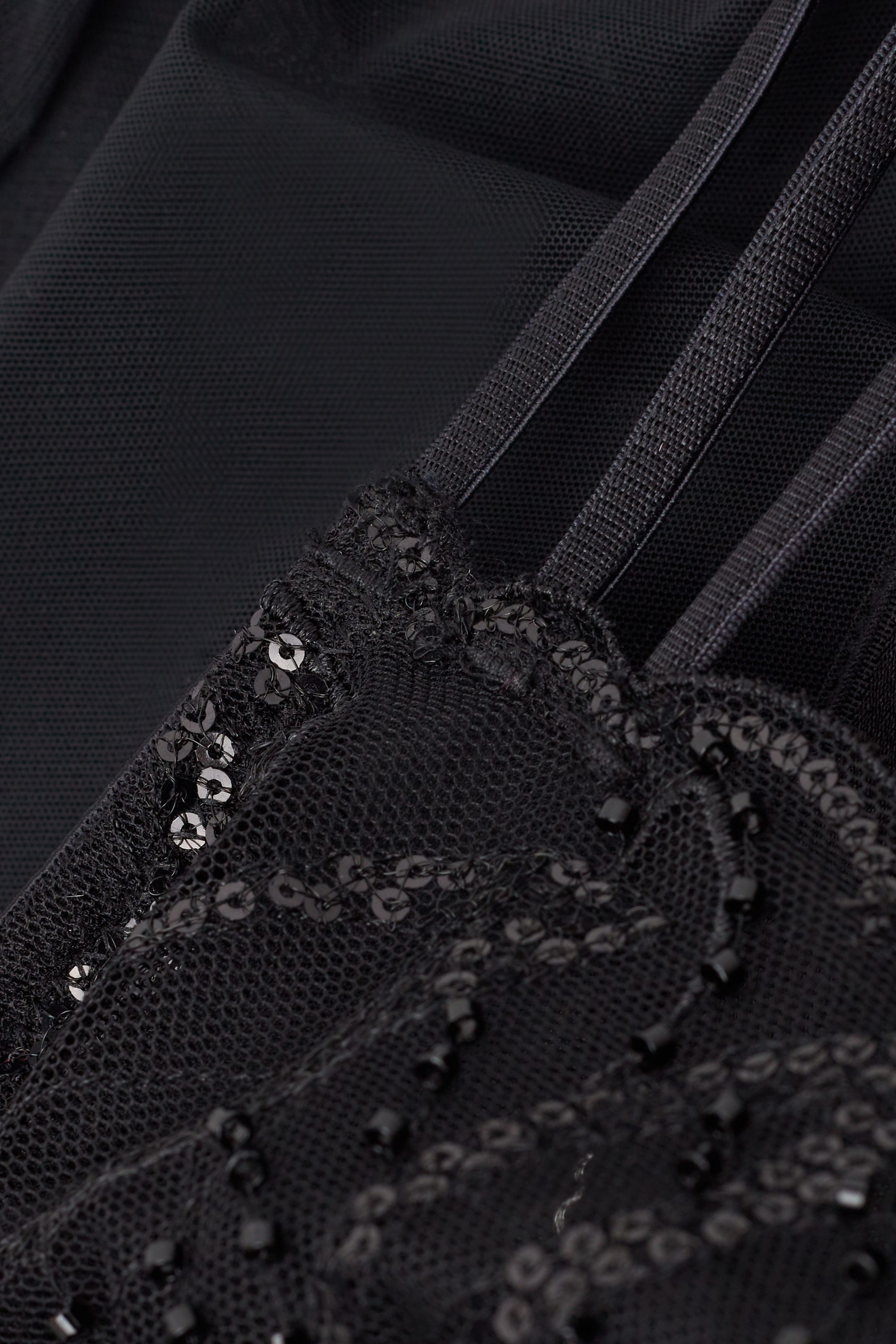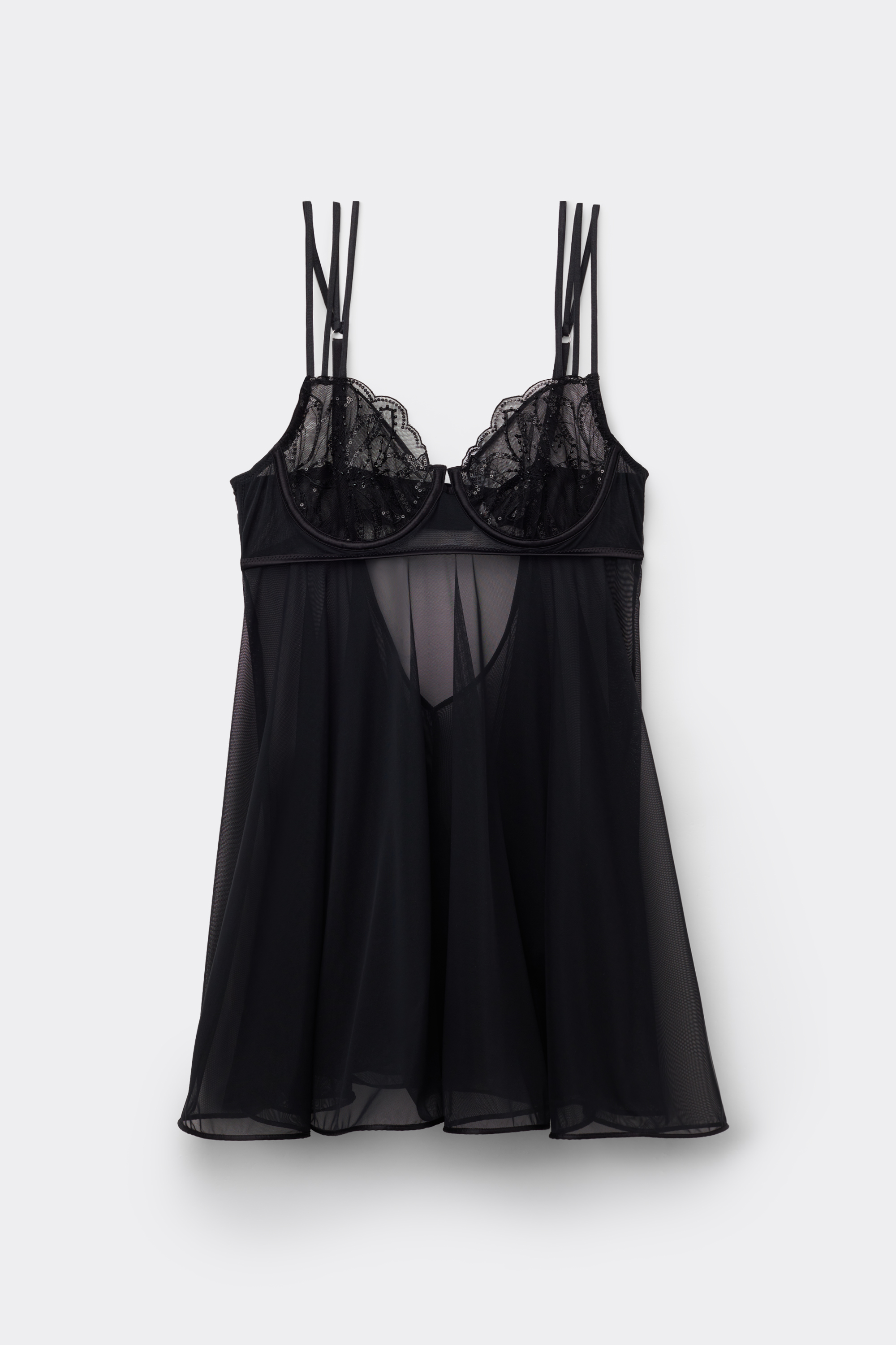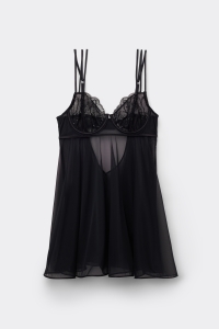 Чувственный бэби-долл из тюля с элегантной атласной отделкой и чашками, украшенными пайетками и бисером. Деталь: глубокий вырез на спине с застежкой на крючки.