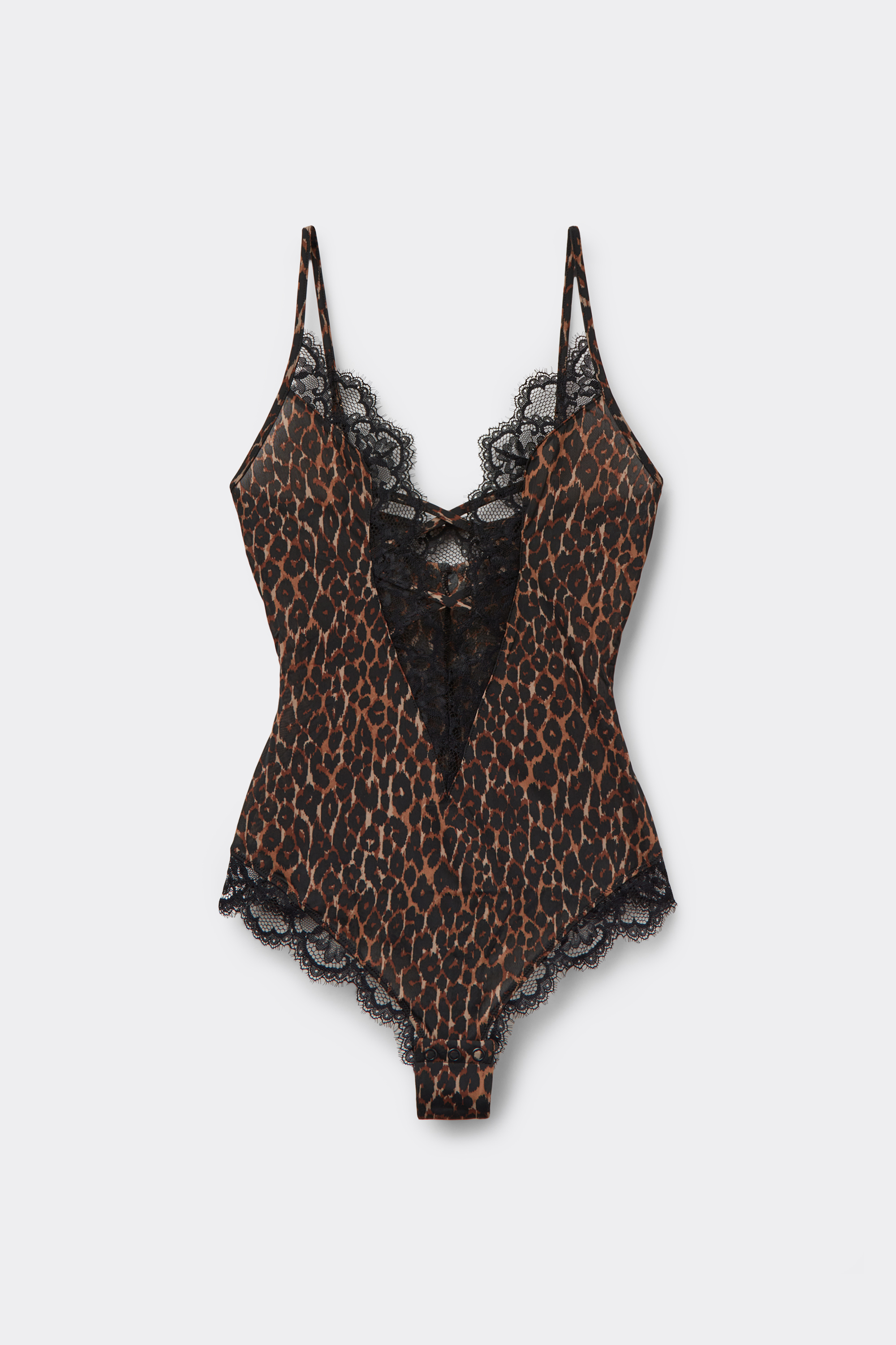 Боди из мягкой и легкой микрофибры с анималистическим принтом. Отделка и вставки из кружева. Глубокий вырез с перекрестными деталями в области декольте подчеркивает чувственность образа.