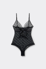 Боди с чашками с оборчатой отделкой и вышивкой в виде сердечек. На лифе из мягкого тюля повторяется тот же мотив. Небольшой каплевидный вырез и два атласных бантика придают модели игриво-романтичный характер.