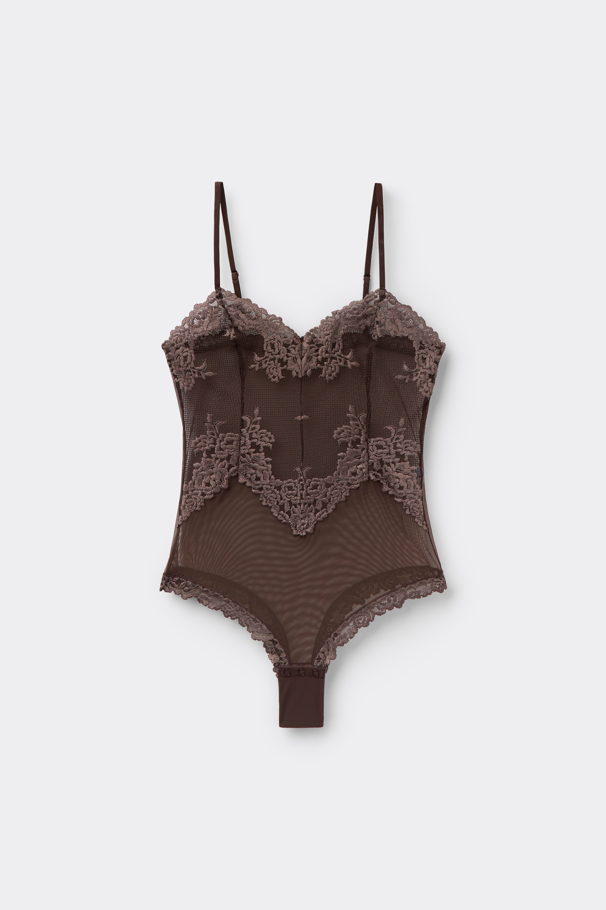 Чувственное боди с V-образным вырезом, выполненное из кружева и тюля. В различных вариантах расцветки кружево может быть контрастным или тон в тон. Регулируемые бретели из эластичной тесьмы. Снизу: кнопочная застежка. Ластовица: 100% хлопок.