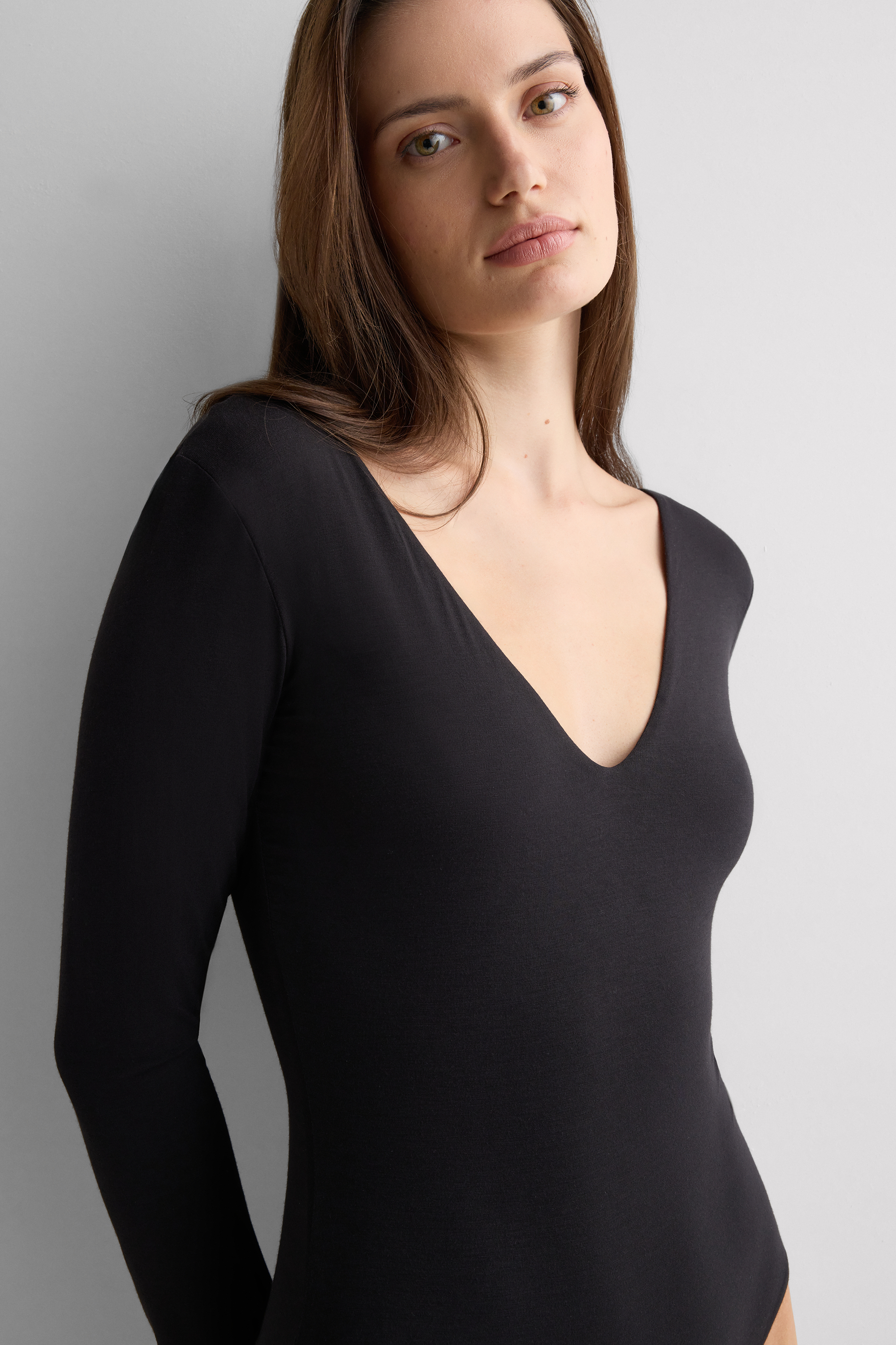Боди с Длинными Рукавами и Глубоким V-образным Вырезом из Легкой Бамбуковой Ткани