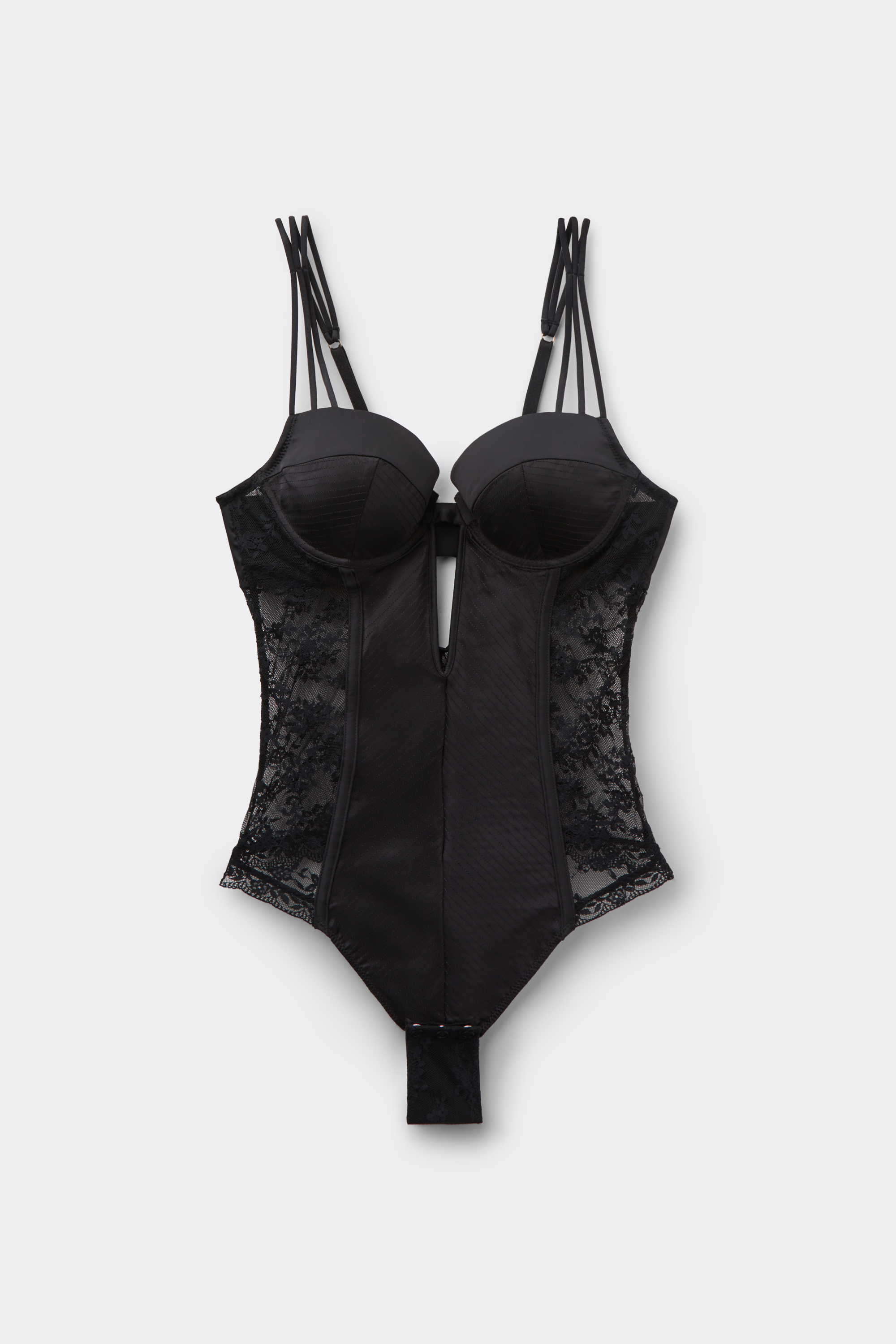 Кружевное боди с атласной отделкой и элегантной отстрочкой в стиле ретро. V-образная косточка по центру подчеркивает глубокий вырез. Вертикальные швы создают эффект бюстье. Модель можно носить как отдельно, так и с жакетом.