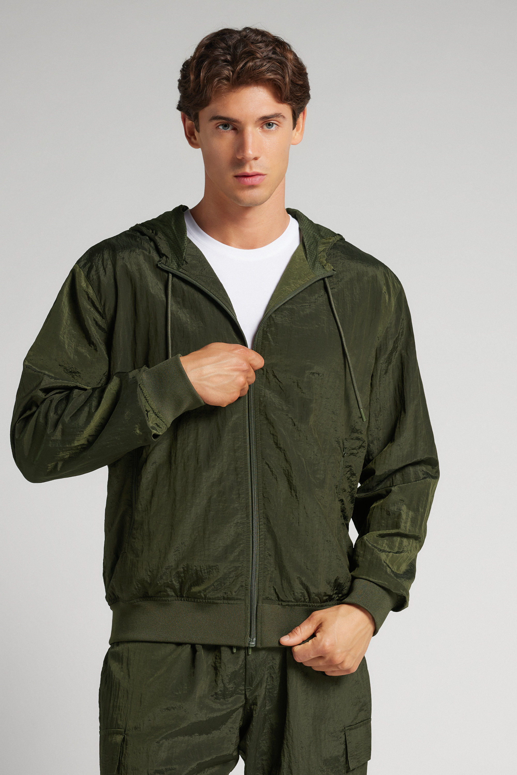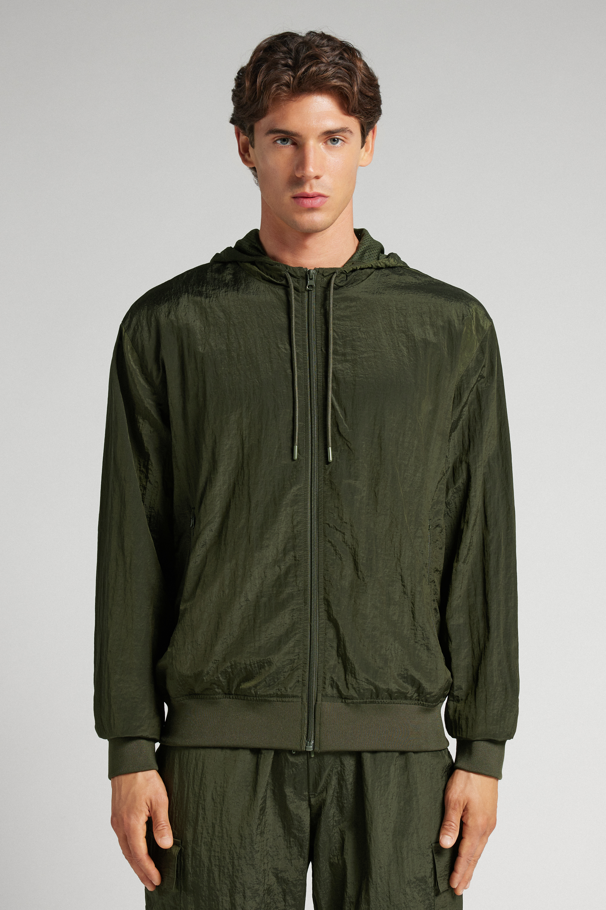 Бомбер с центральной молнией из технологичной ткани с переливающейся и глянцевой поверхностью. Идеально подходит для занятий спортом и досуга.