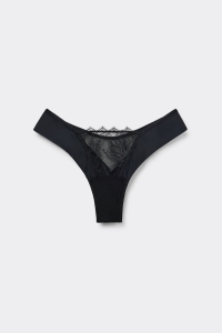 Бразильяно из кружева и мягкой микрофибры. Бесшовная двухслойная деталь из микрофибры обеспечивает ощущение комфорта и делает белье незаметным под облегающей одеждой. Сзади — мягкий сетчатый тюль.