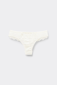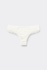 Бразильяно с каймой из ресничного кружева и вставками из тюля. Отделка из мягкой микрофибры. Пикантная деталь сзади.