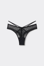 Бразильяно из эластичного кружева и тюля с точечной вышивкой. Мягкие эластичные тесемки с золотистыми заклепками можно поднимать высоко на талии.