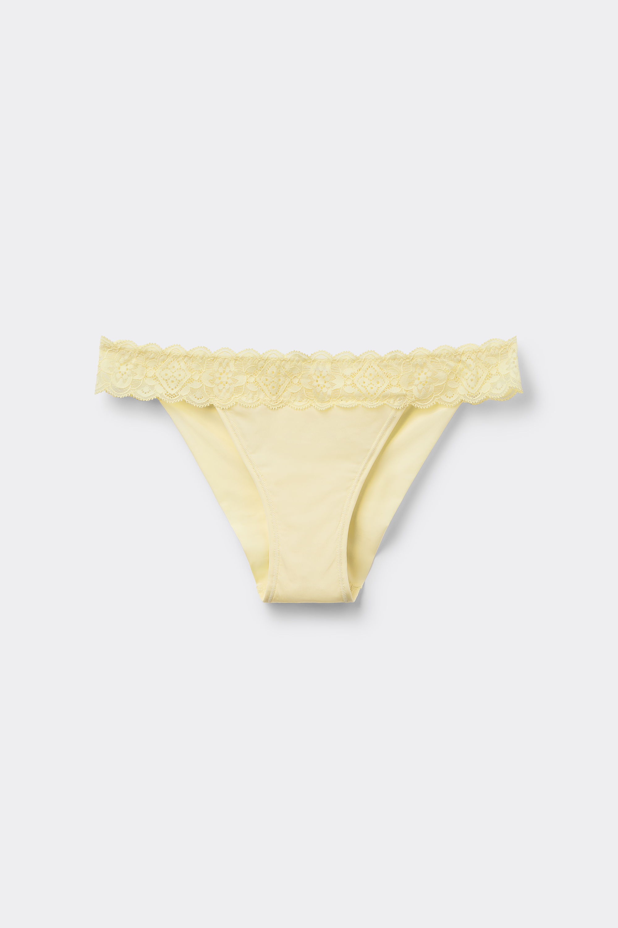 Бразильяно из мягкой микрофибры с кружевным поясом. Крой сзади более закрытый, чем в обычных трусах бразильяно.