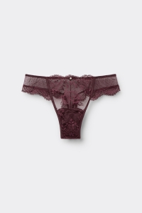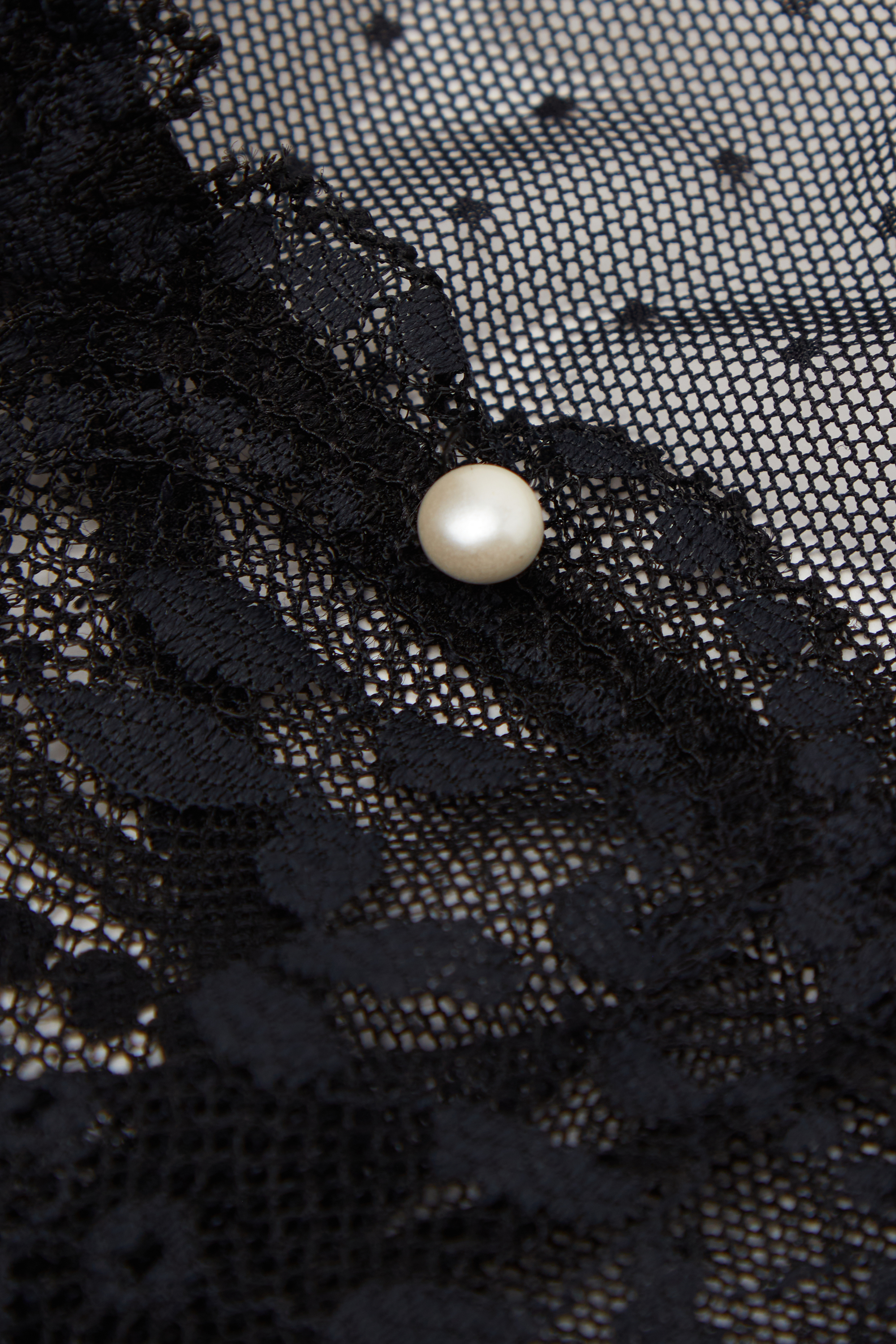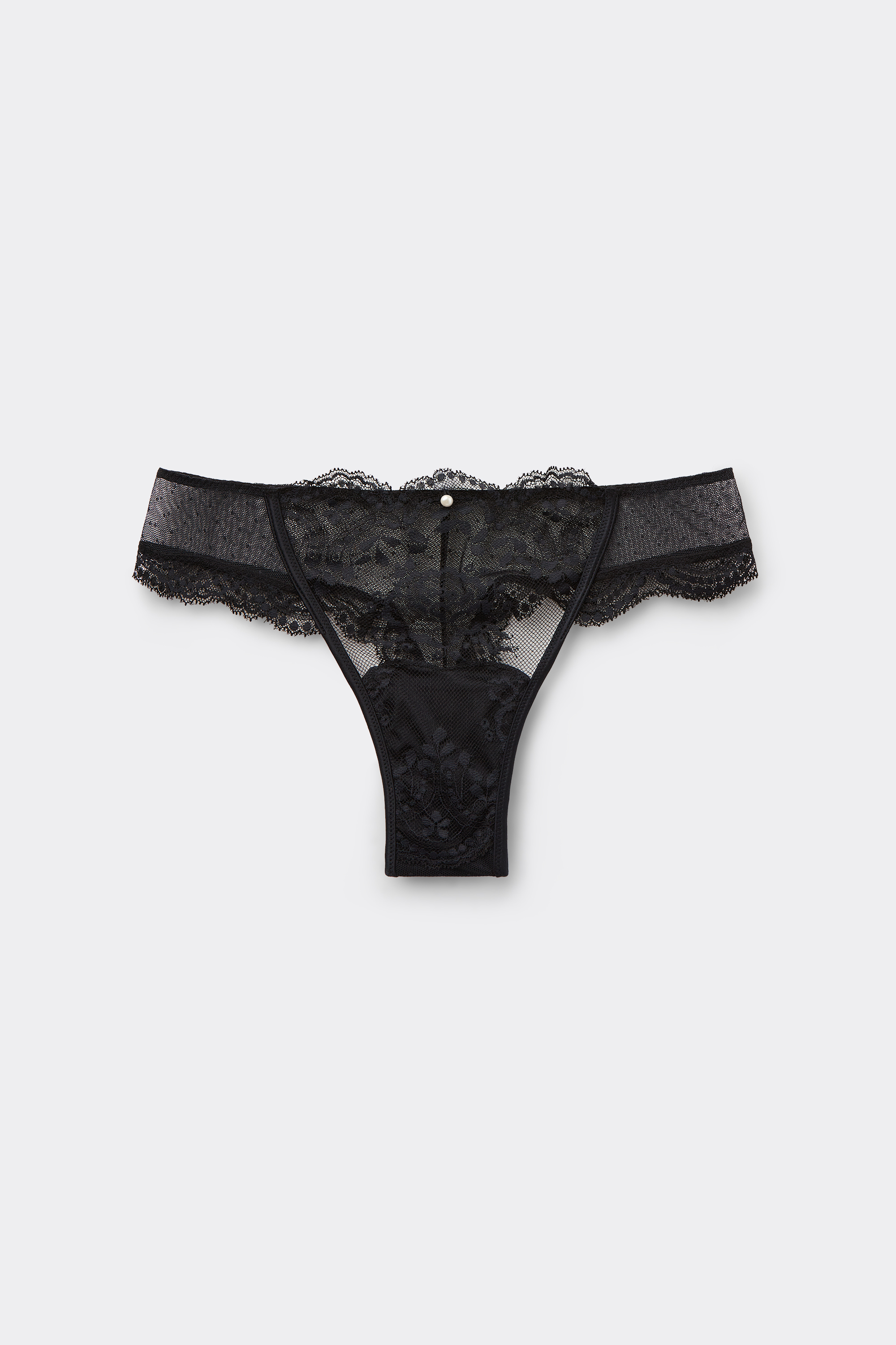 Бразильяно из кружева и тюля с точечной вышивкой. Элегантная отделка из блестящей микрофибры с атласной фактурой. Небольшая пуговица с эффектом жемчуга на поясе придает модели романтические нотки.