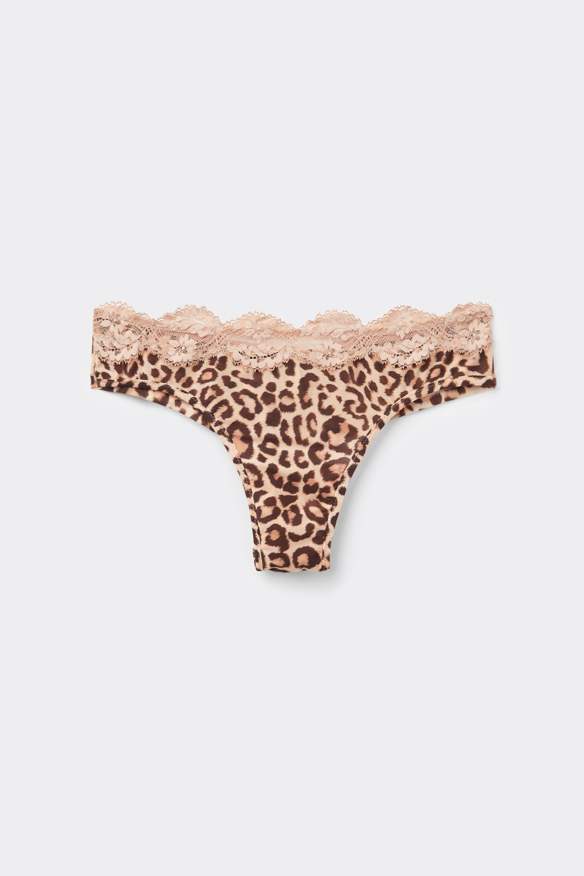 Бразильяно из мягкой и легкой микрофибры с анималистическим принтом в теплых и романтических тонах на розовой основе, отделанные кружевной каймой с цветочным мотивом телесного цвета.