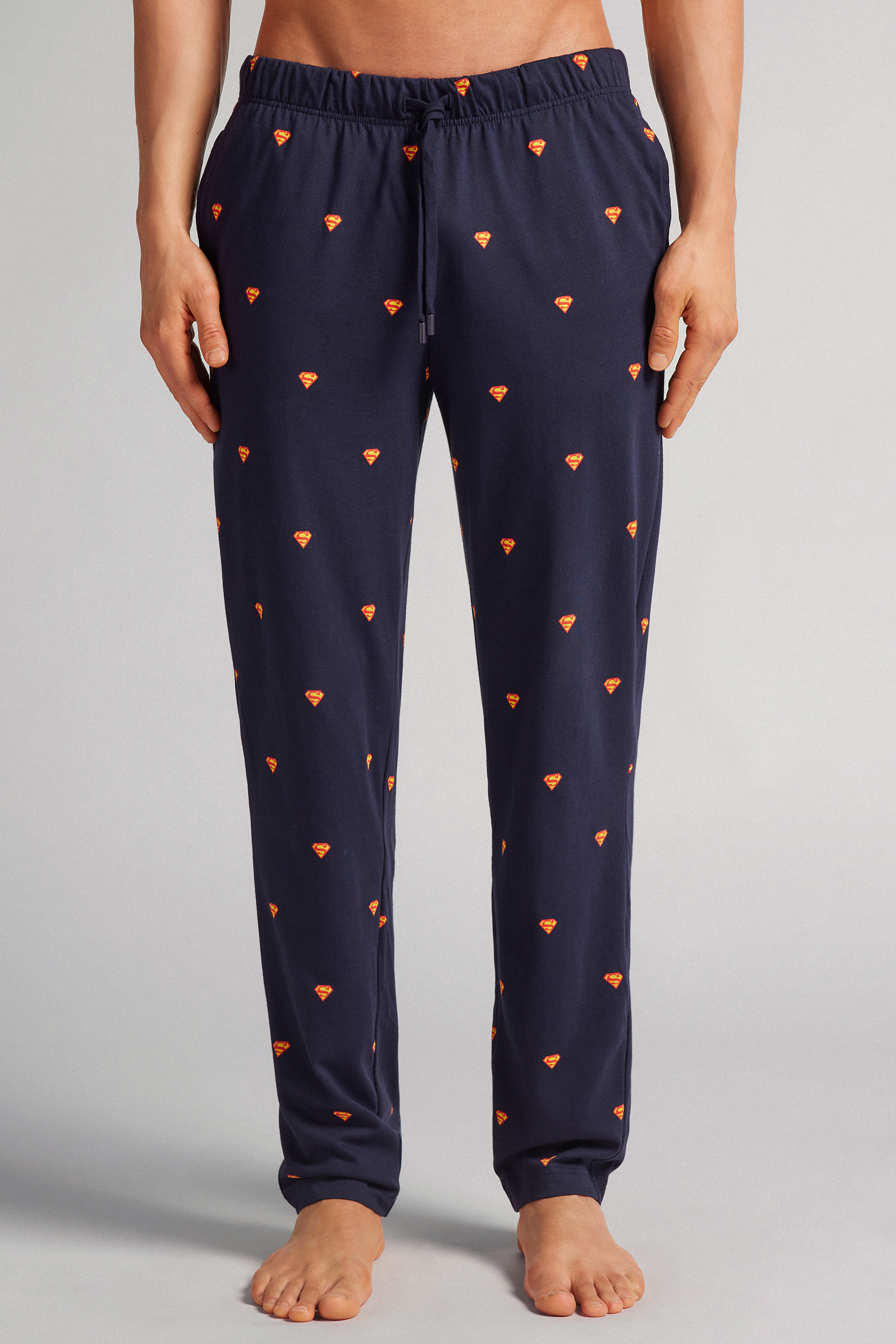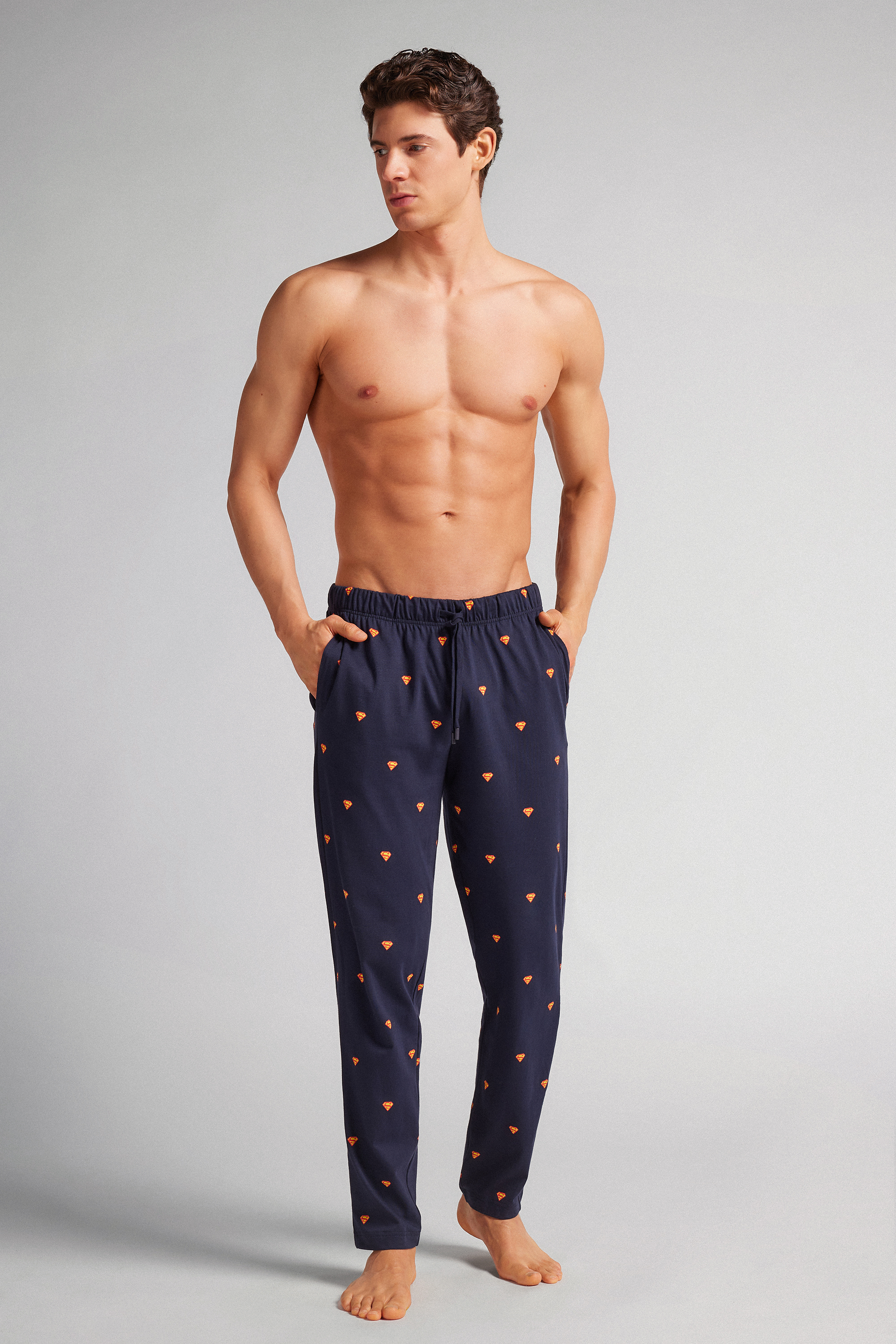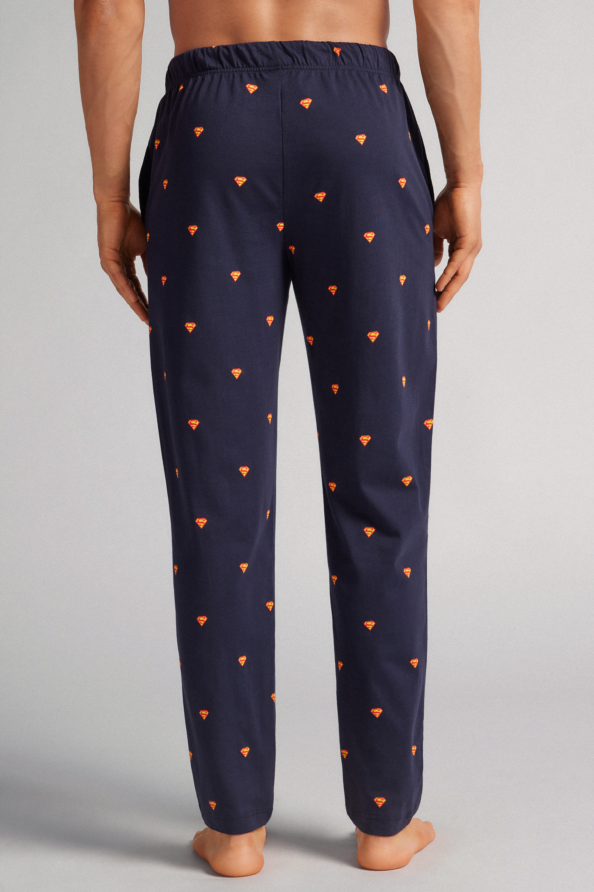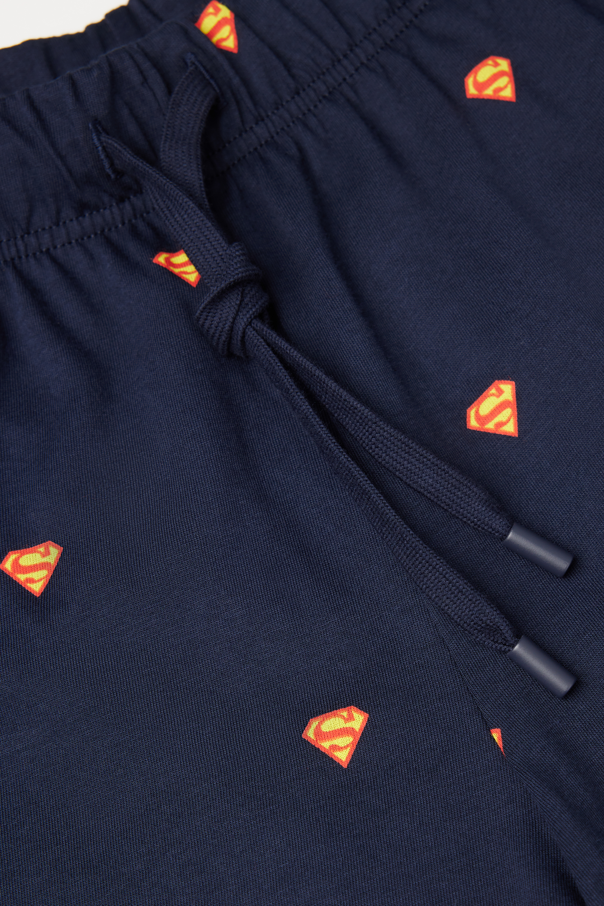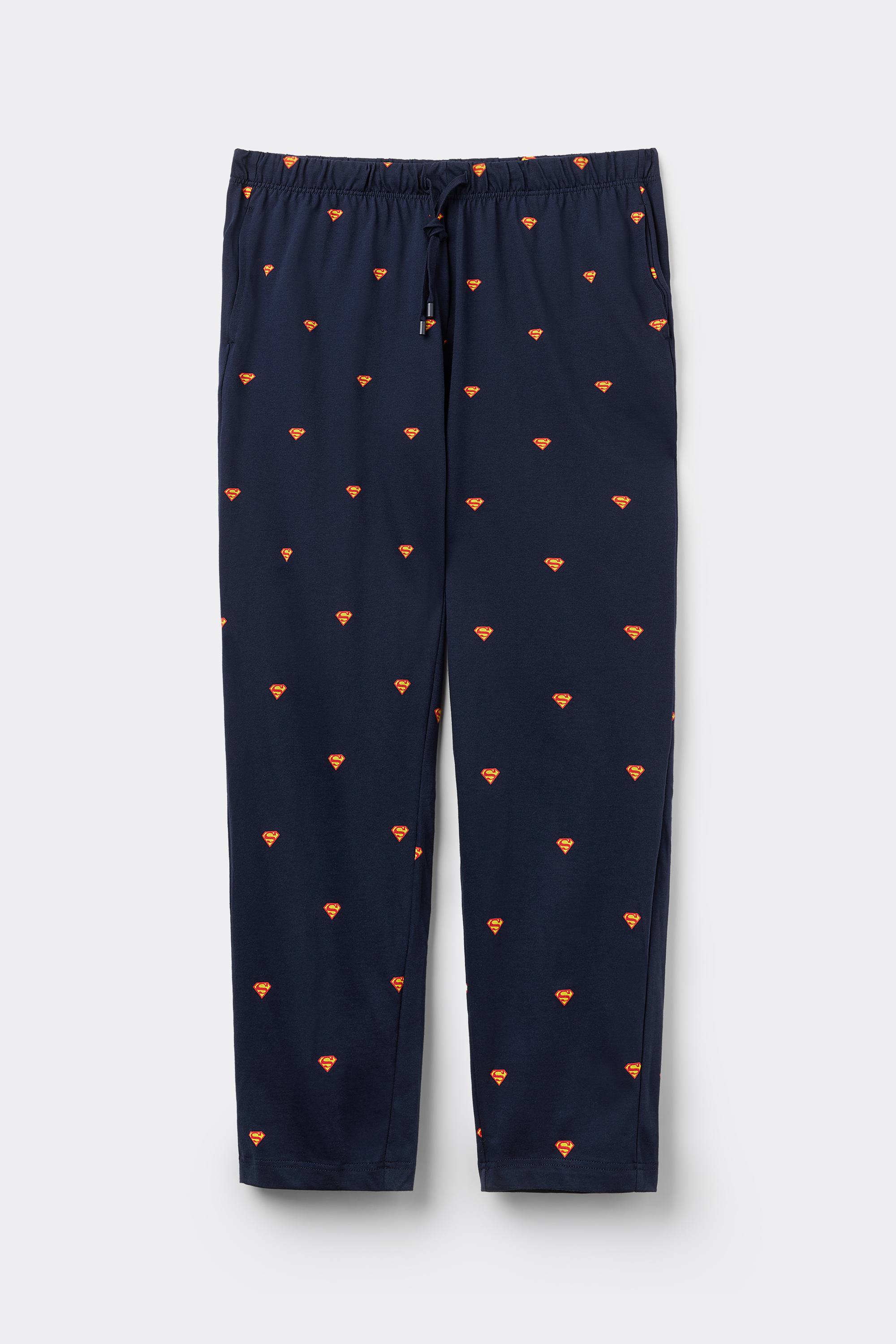 Брюки из хлопкового трикотажа интерлок с принтом в виде логотипа Супермена по всему изделию.