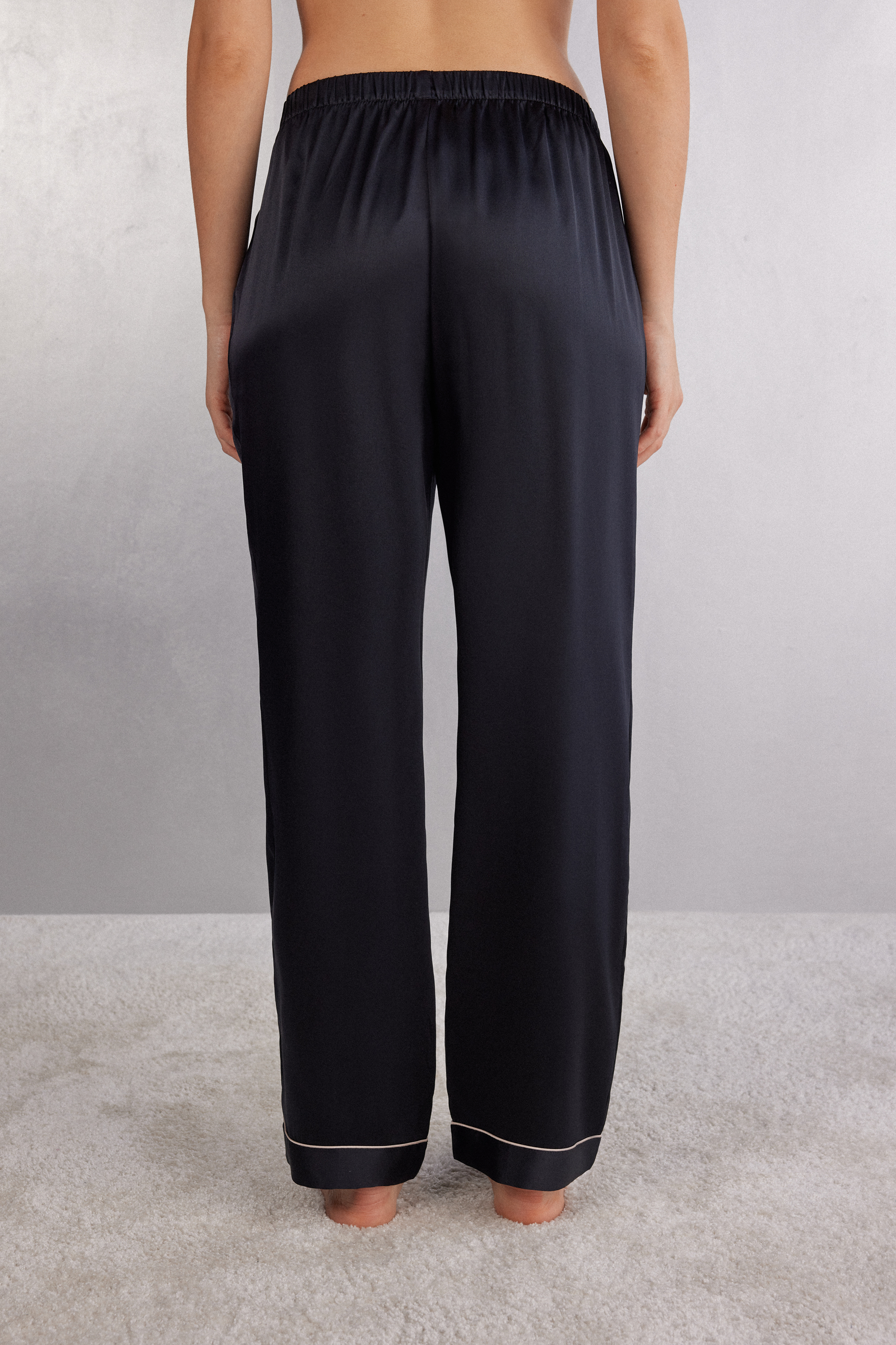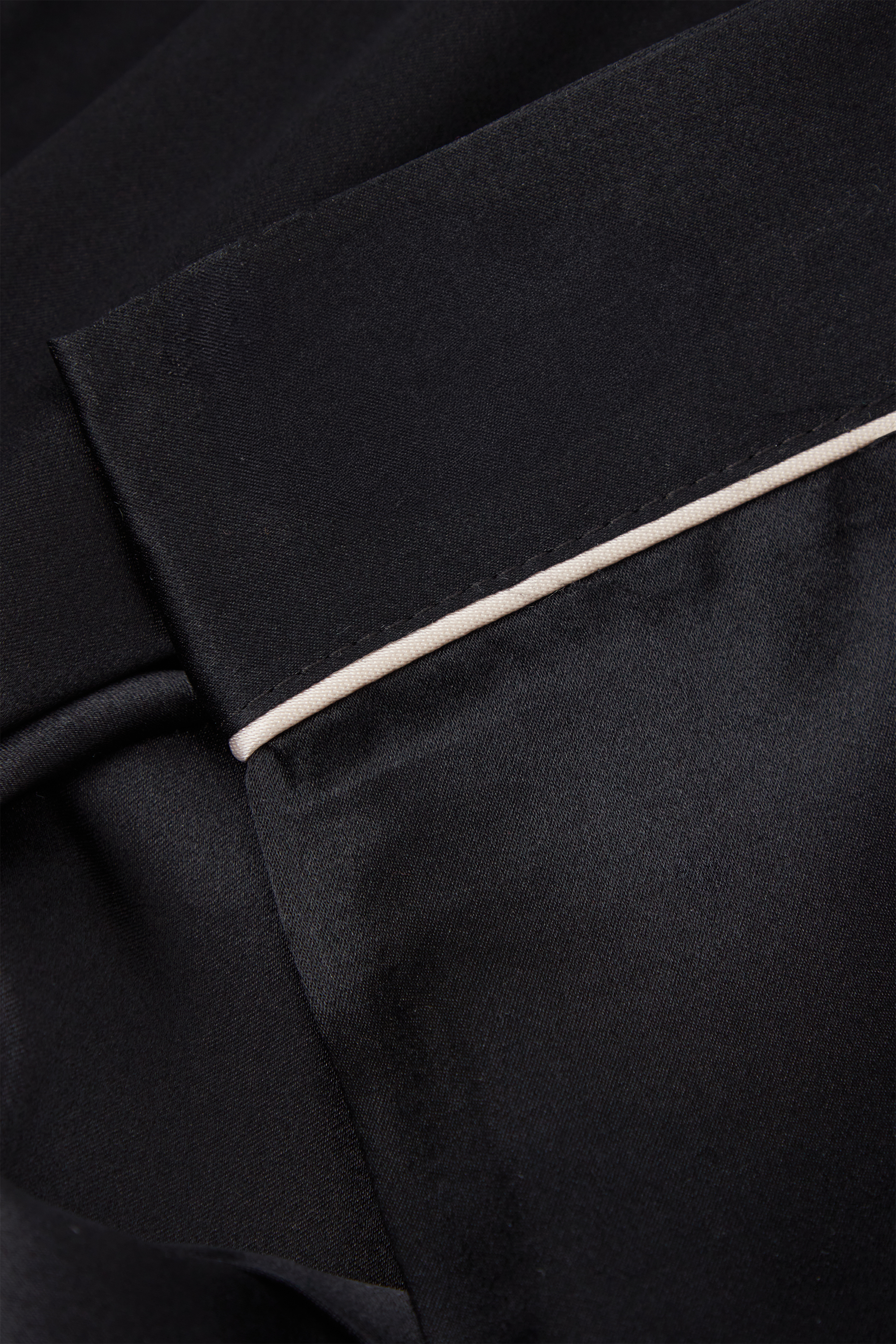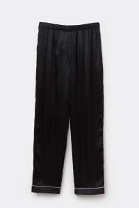 Длинные широкие брюки «палаццо» из шелкового атласа с закрытой резинкой на талии и окантовкой контрастного цвета. Рост модели — 179 см.