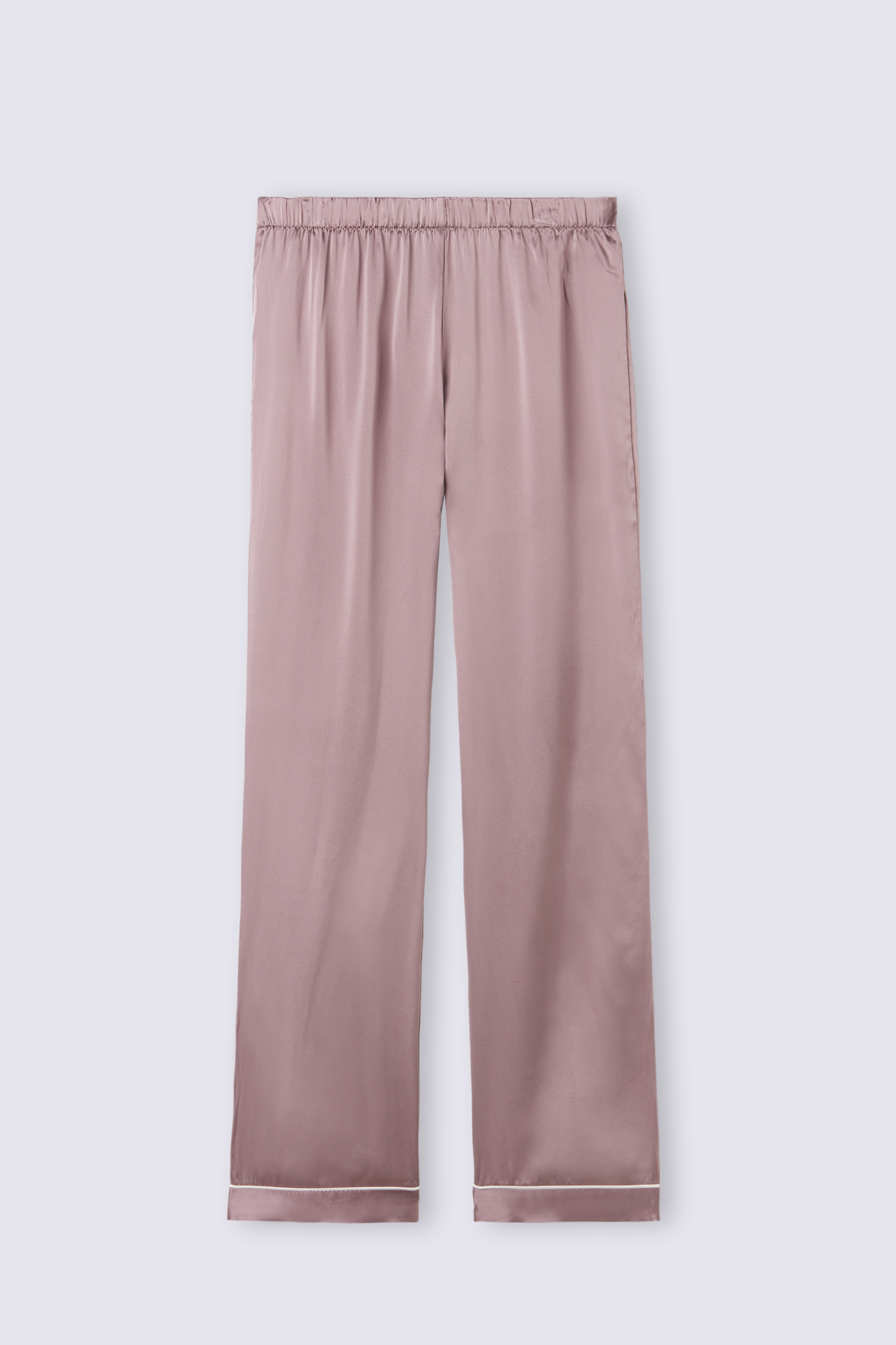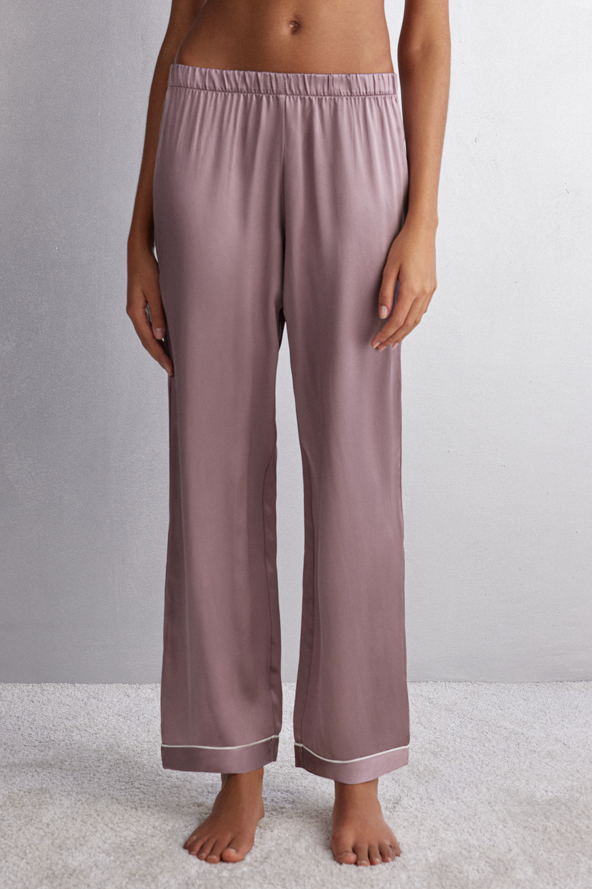 Длинные широкие брюки «палаццо» из шелкового атласа с закрытой резинкой на талии и окантовкой контрастного цвета. Рост модели — 179 см.