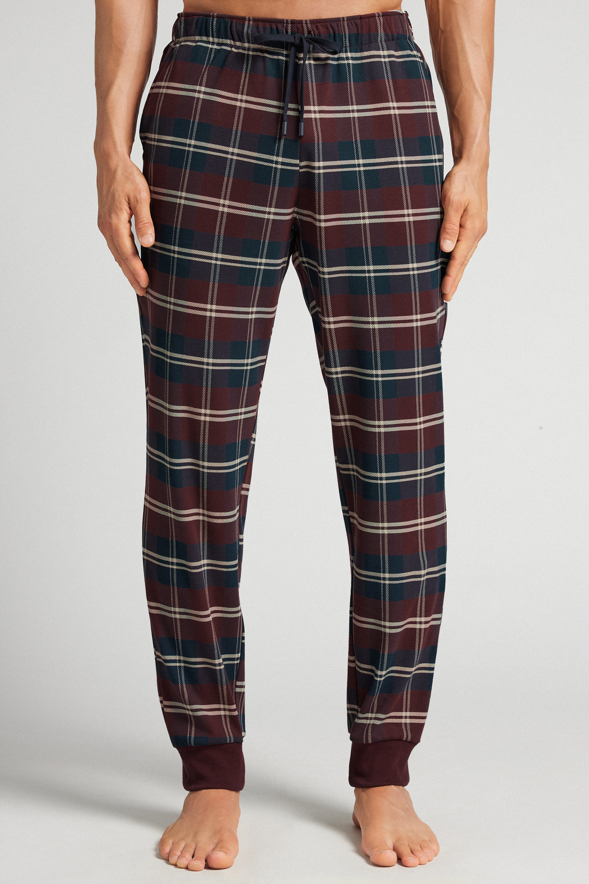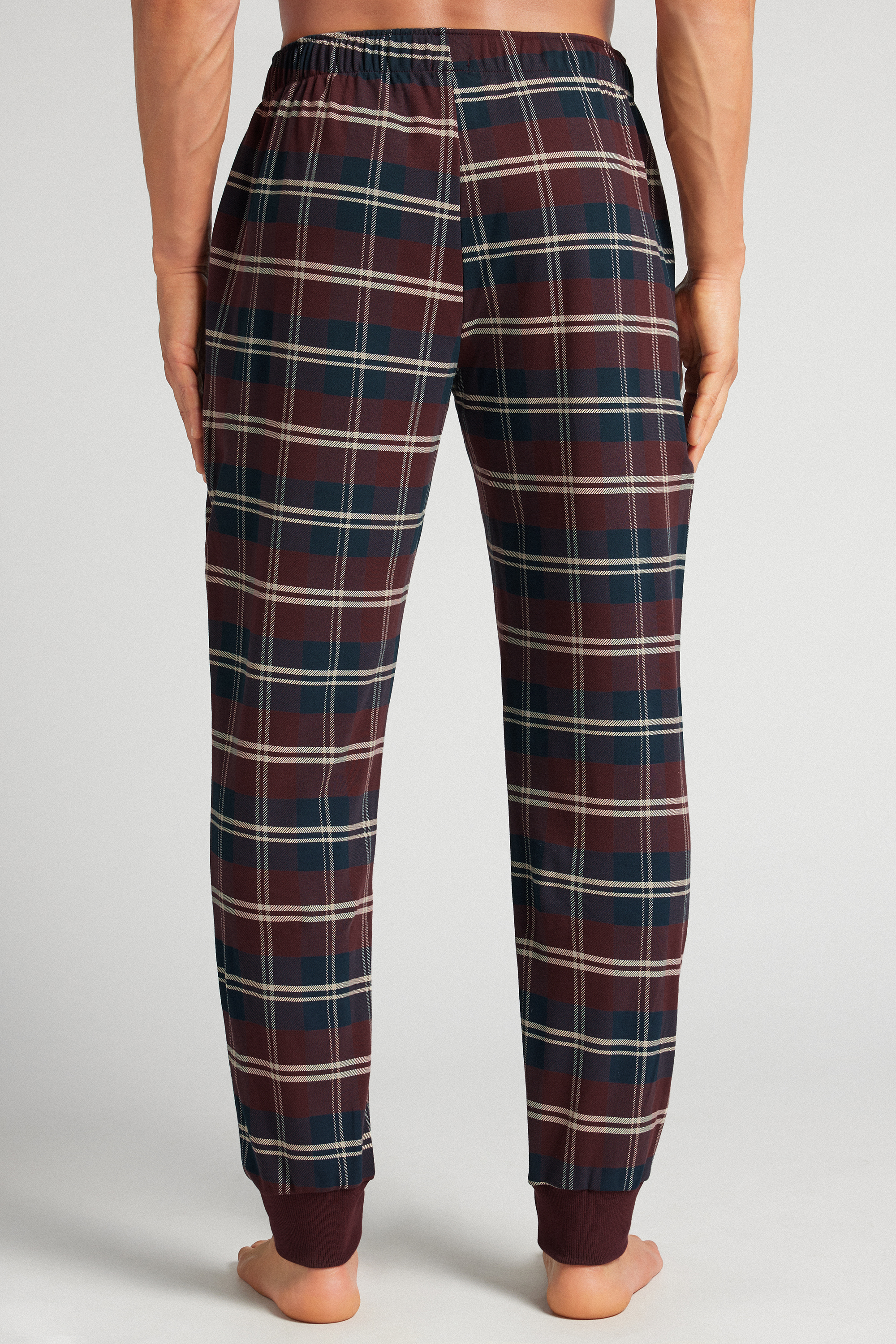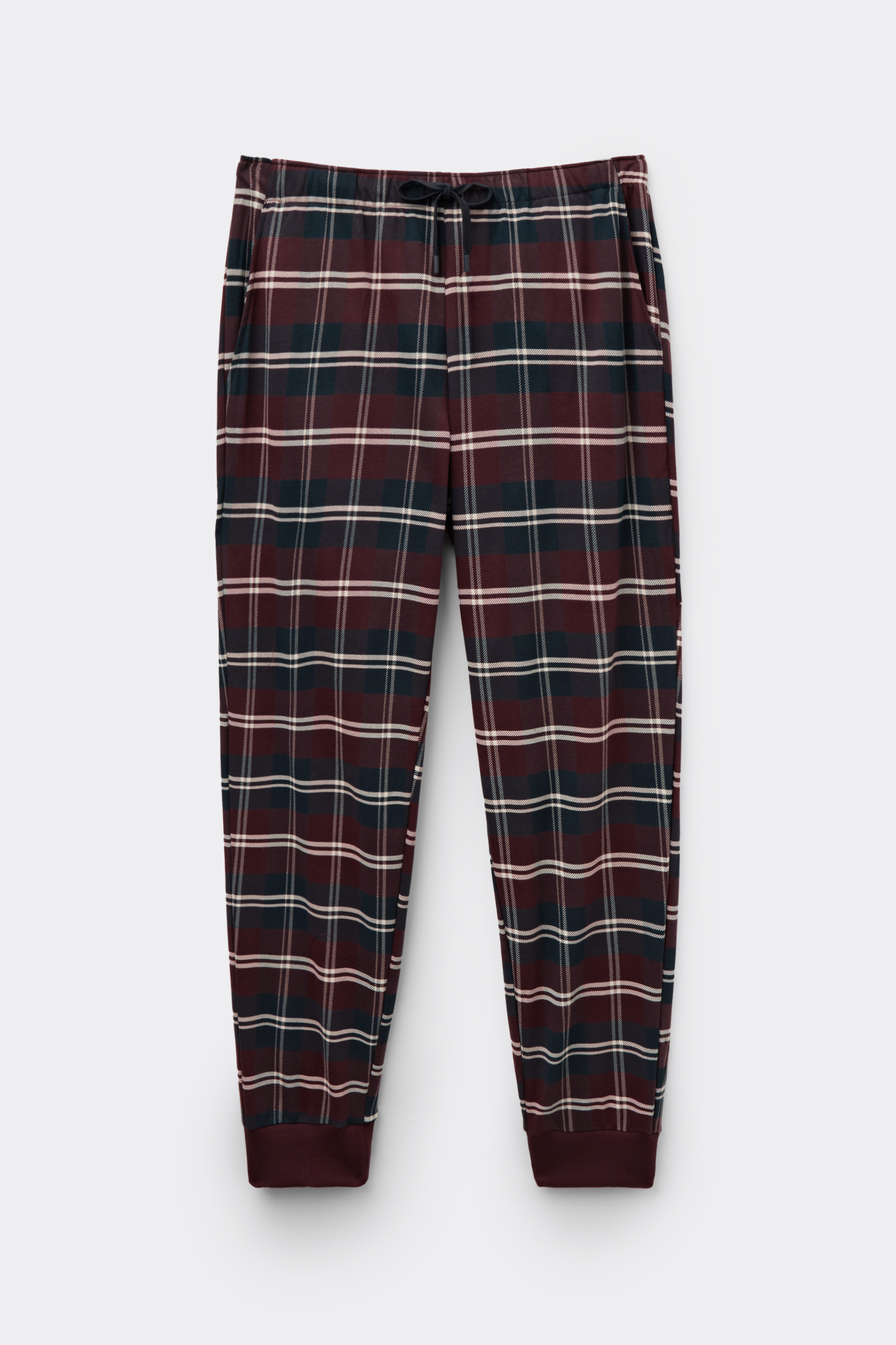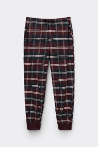 Брюки из хлопкового трикотажа интерлок в клетку тартан синих и красных оттенков. Эта модель подходит как для сна, так и для отдыха дома.