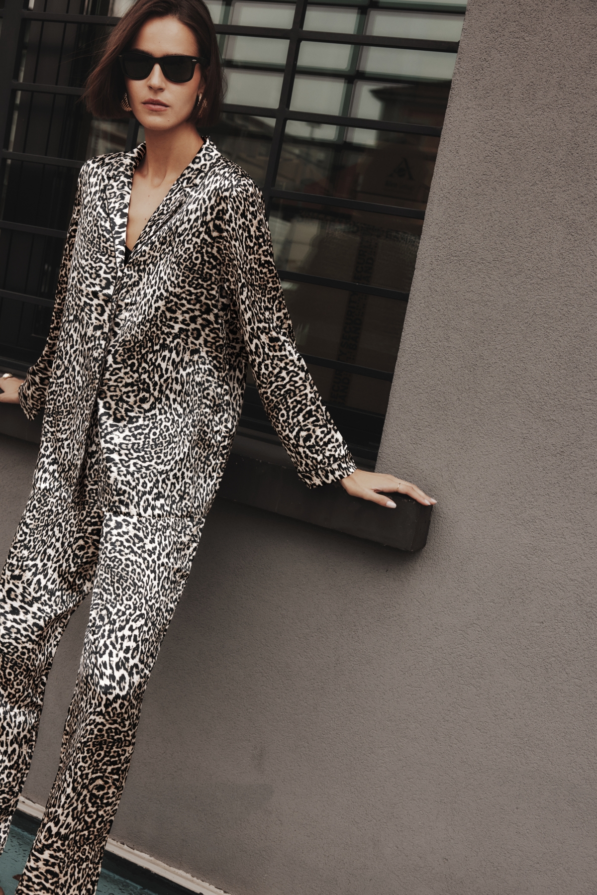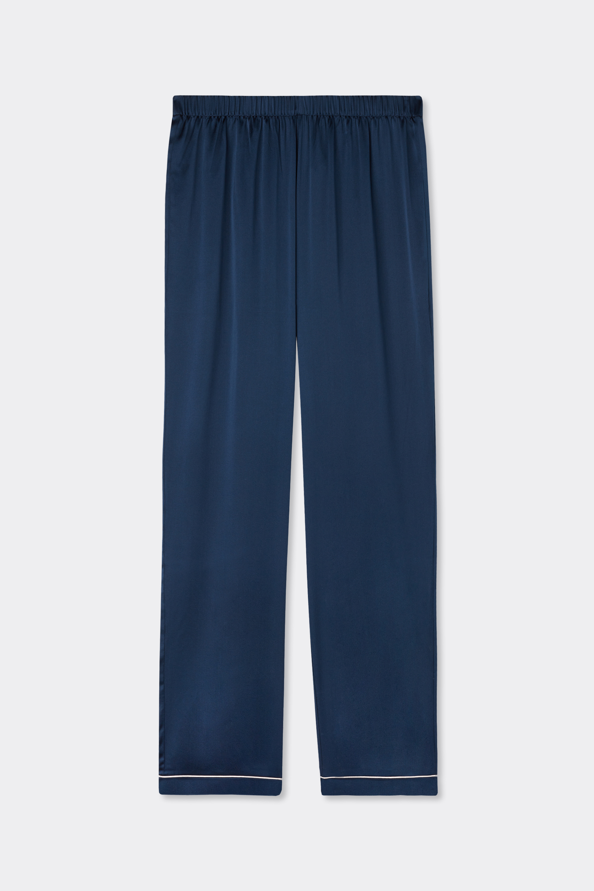 Брюки из слегка эластичного шелкового атласа. Внизу отделка контрастным кантом в нескольких вариантах цвета. Это удобное и элегантное изделие можно использовать в качестве пижамы или изысканной домашней одежды.