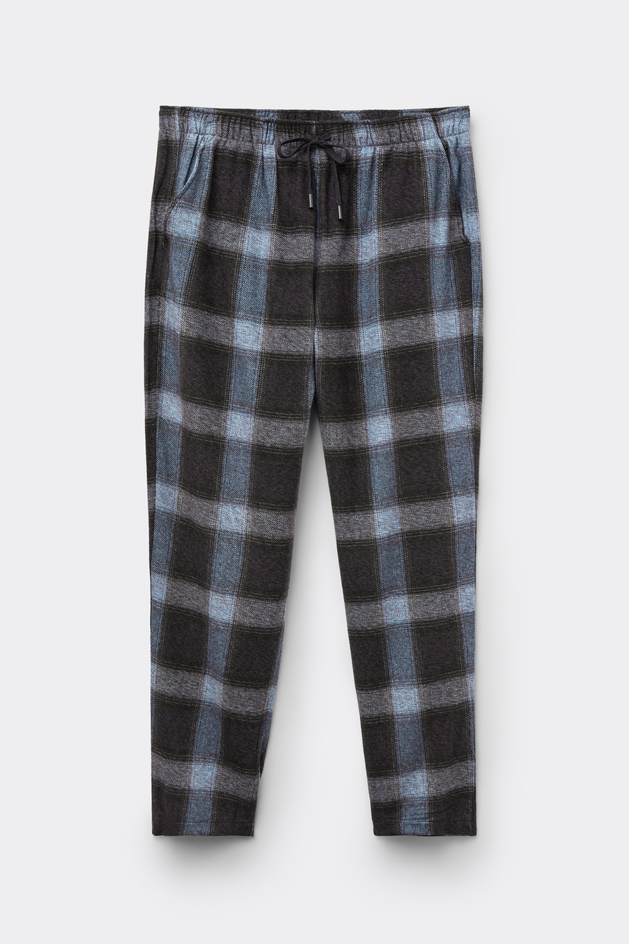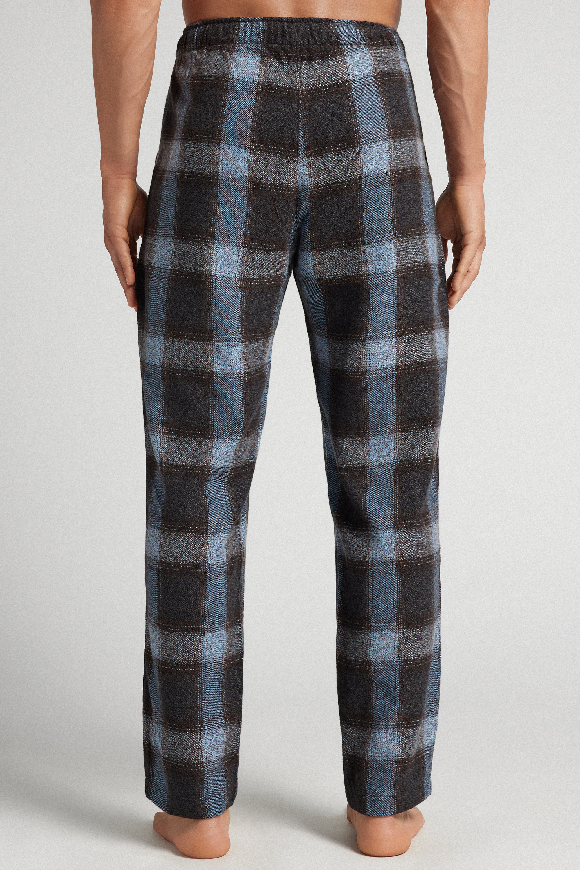 Брюки из трикотажной ткани в клетку синих оттенков. Эта модель подходит как для сна, так и для отдыха дома.