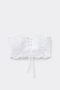 Очаровательное бюстье с уплотненными чашками и эффектом корсета: шнуровка по центру груди придает модели особую чувственность. Это женственное изделие в романтическом стиле можно носить отдельно или под расстегнутой рубашкой.