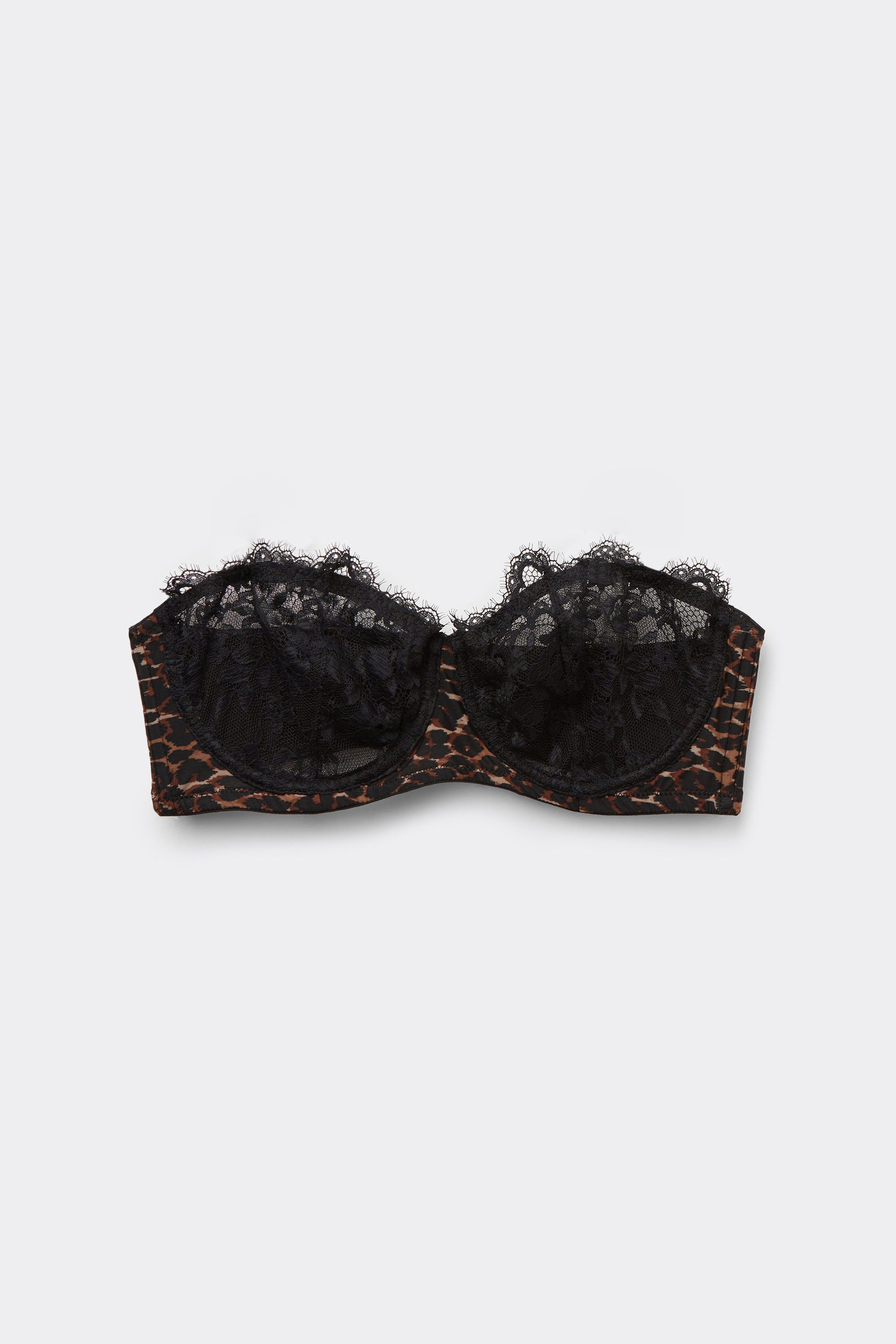 Чувственный бюстгальтер бандо с чашками «балконет» из элегантного кружева. Пояс под грудью выполнен из очень мягкой микрофибры с анималистическим принтом. Идеальная модель женственного бюстгальтера бандо с интригующими нотками.