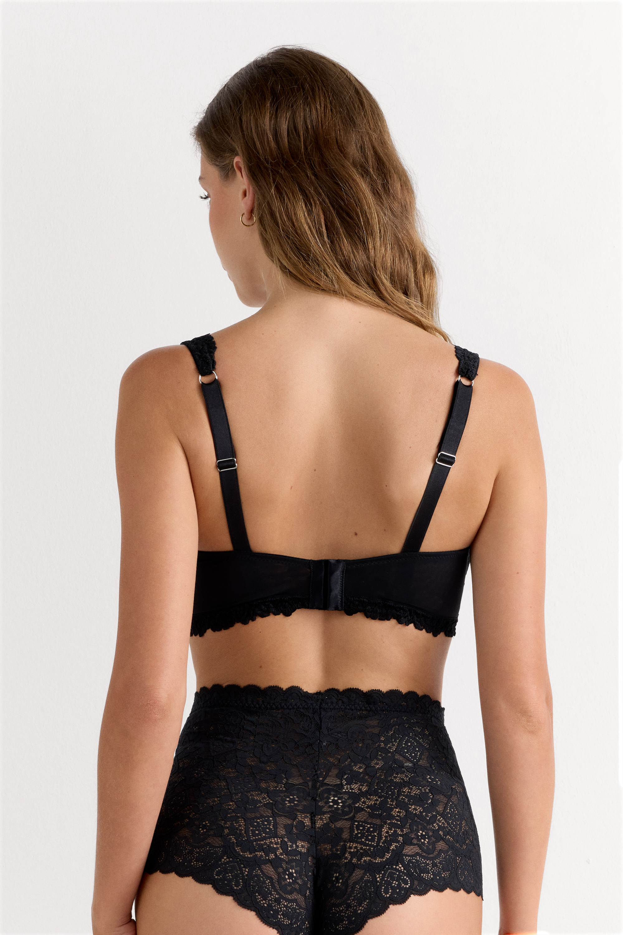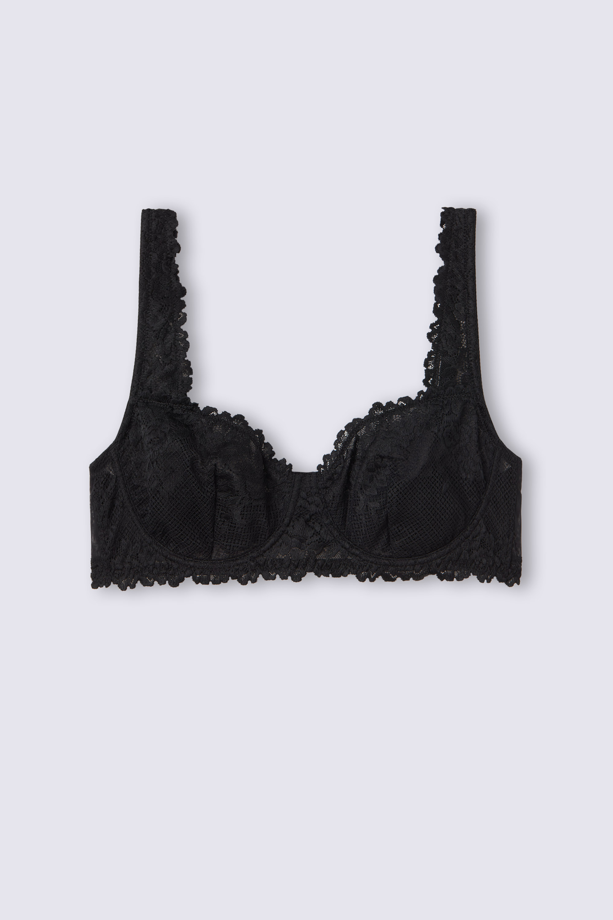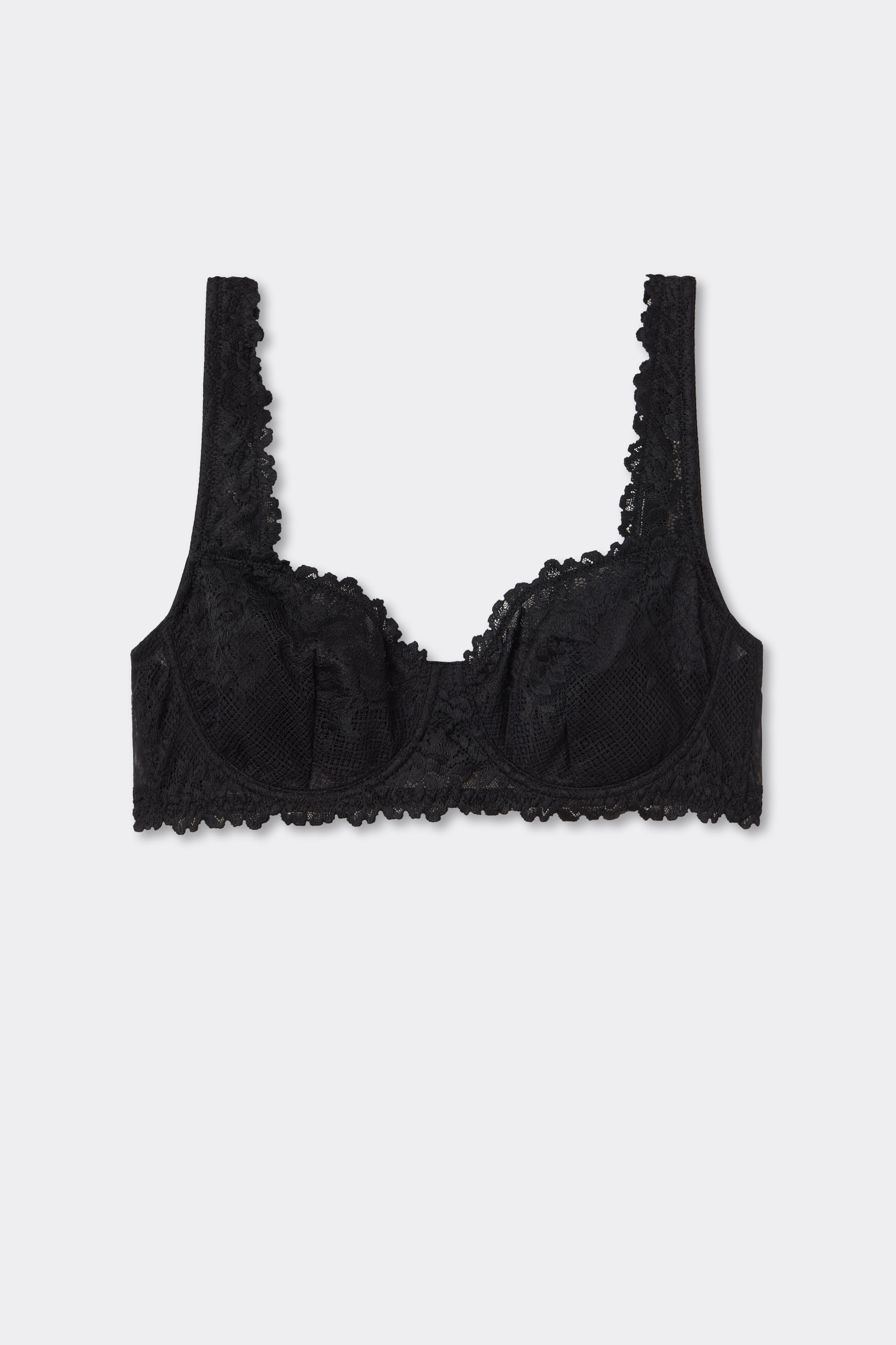 Бюстгальтер балконет Daniela из эластичного кружева. Чашки на косточках, без уплотнения. В различных вариантах расцветки кружево может быть контрастным или тон в тон. Большие размеры отличаются более широкими бретелями и поясом для комфортной посадки. Бретели регулируются на спинке.