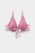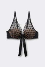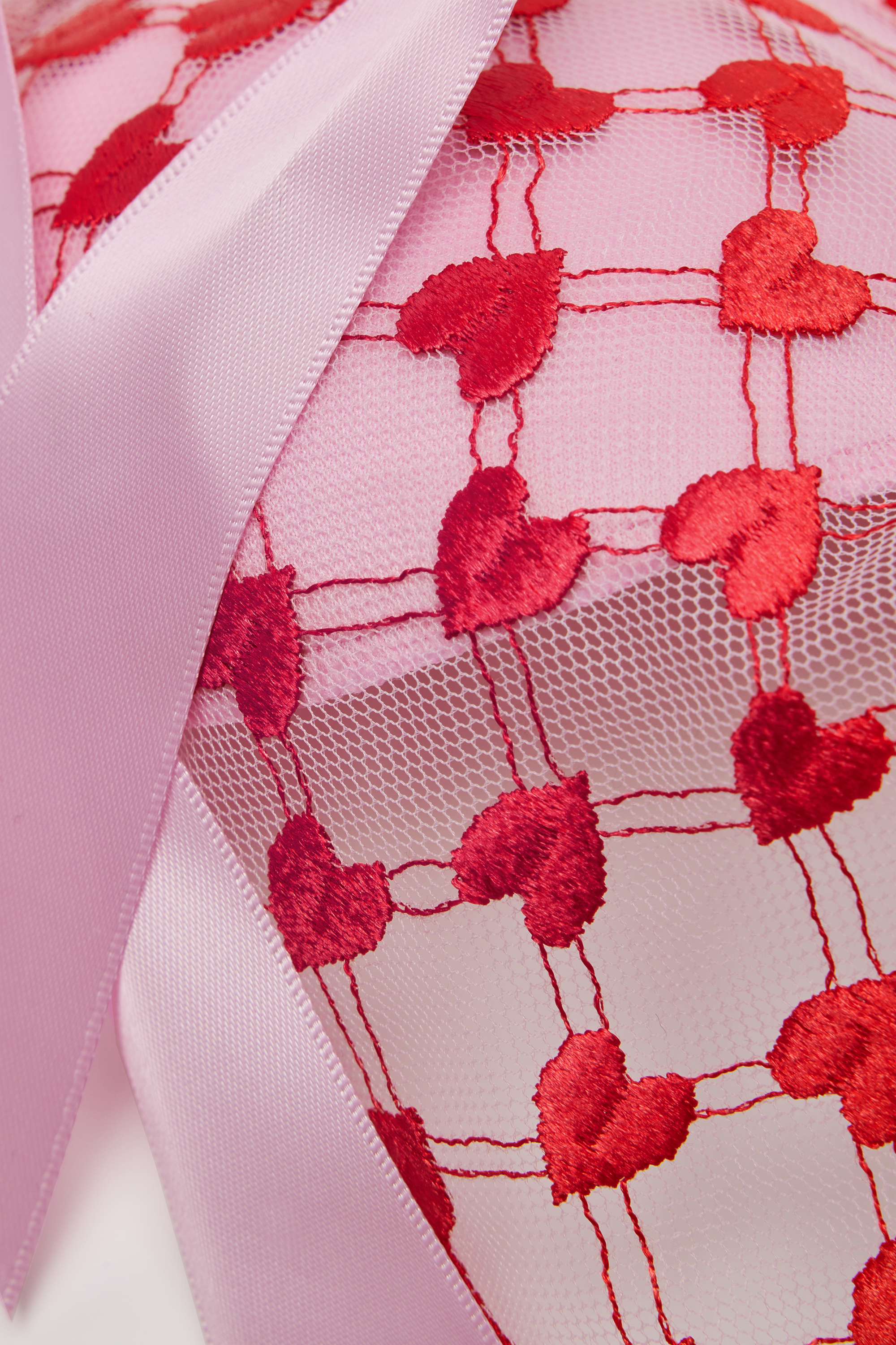 Бюстгальтер балконет Elena из тюля с романтичной вышивкой в сердечко и изящной атласной отделкой. Съемную атласную ленту можно завязать бантом и прикрепить по центру груди, на бретели или на спинке поверх застежки, либо носить как игривый чокер. Треугольные чашки с удлиненной верхней частью обеспечивают отличную поддержку.