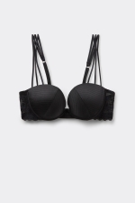 Бюстгальтер балконет Ilenia с чашками из отстроченного атласа. Пояс под грудью, выполненный из цветочного кружева, придает модели женственное очарование стиля ретро. Чувственность изделия подчеркивают бретели из трех эластичных тесемок, а глубокий вырез привлекает внимание к зоне декольте.