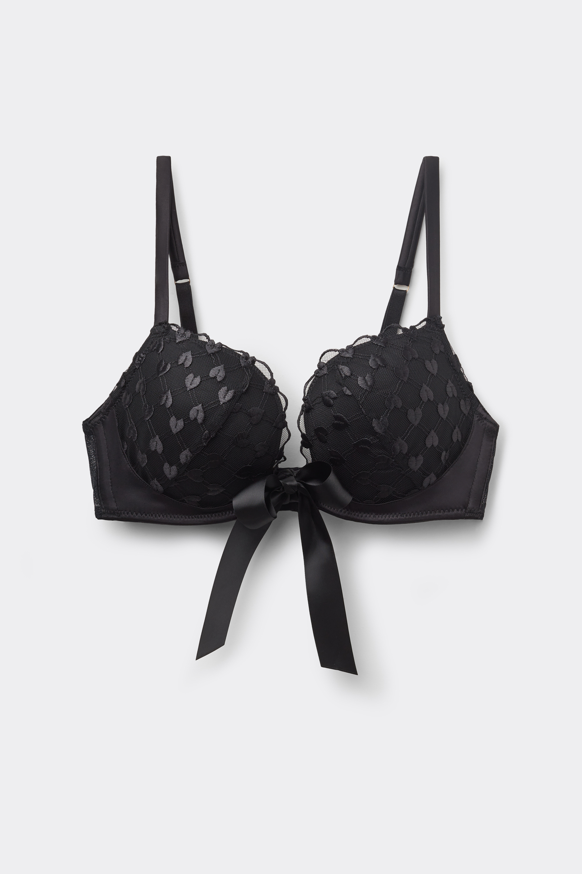 Бюстгальтер пуш-ап Monica из тюля с романтичной вышивкой сердечек и изящной атласной отделкой. Съемную атласную ленту можно завязать бантом и прикрепить по центру груди, на бретели или на спинке поверх застежки, либо носить как игривый чокер. Модель с глубоким вырезом горловины, выгодно подчеркивающая декольте.