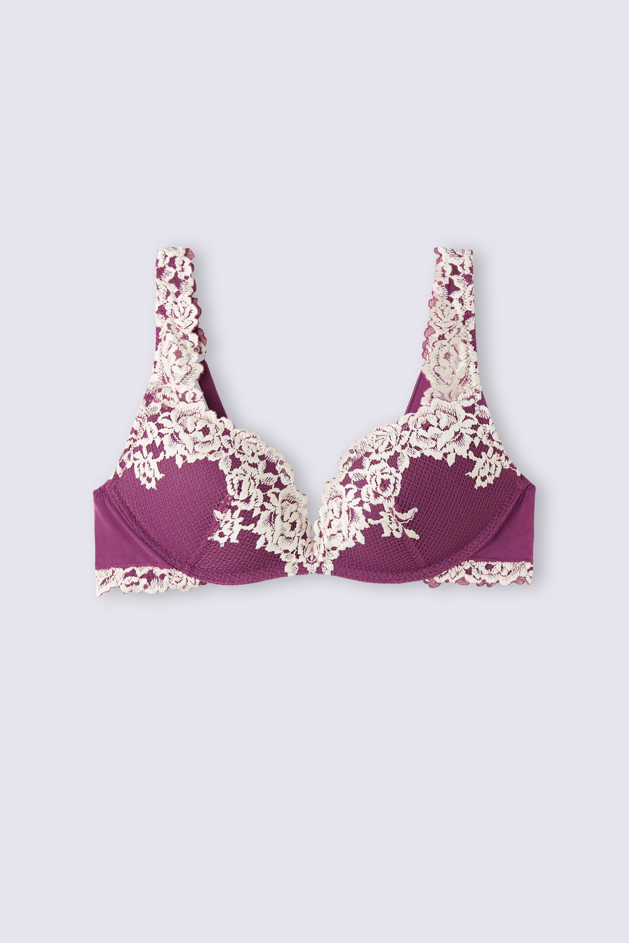 Бюстгальтер Gioia с эффектом супер пуш-ап. Формованные чашки с объемным градуированным уплотнением, без косточек. Эта изысканная модель выполнена из элегантного эластичного кружева с цветочной вышивкой тон в тон или контрастного цвета. Бретели, обтянутые кружевом, регулируются на спинке. Бюстгальтер позволяет создать потрясающий эффект, увеличивая объем груди на два размера.