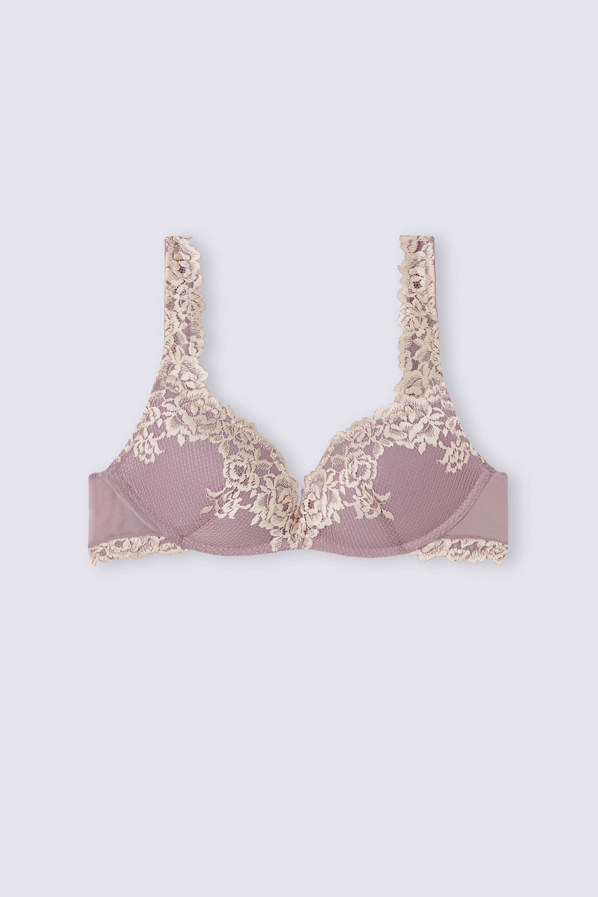 Бюстгальтер Gioia с эффектом супер пуш-ап. Формованные чашки с объемным градуированным уплотнением, без косточек. Эта изысканная модель выполнена из элегантного эластичного кружева с цветочной вышивкой тон в тон или контрастного цвета. Бретели, обтянутые кружевом, регулируются на спинке. Бюстгальтер позволяет создать потрясающий эффект, увеличивая объем груди на два размера.