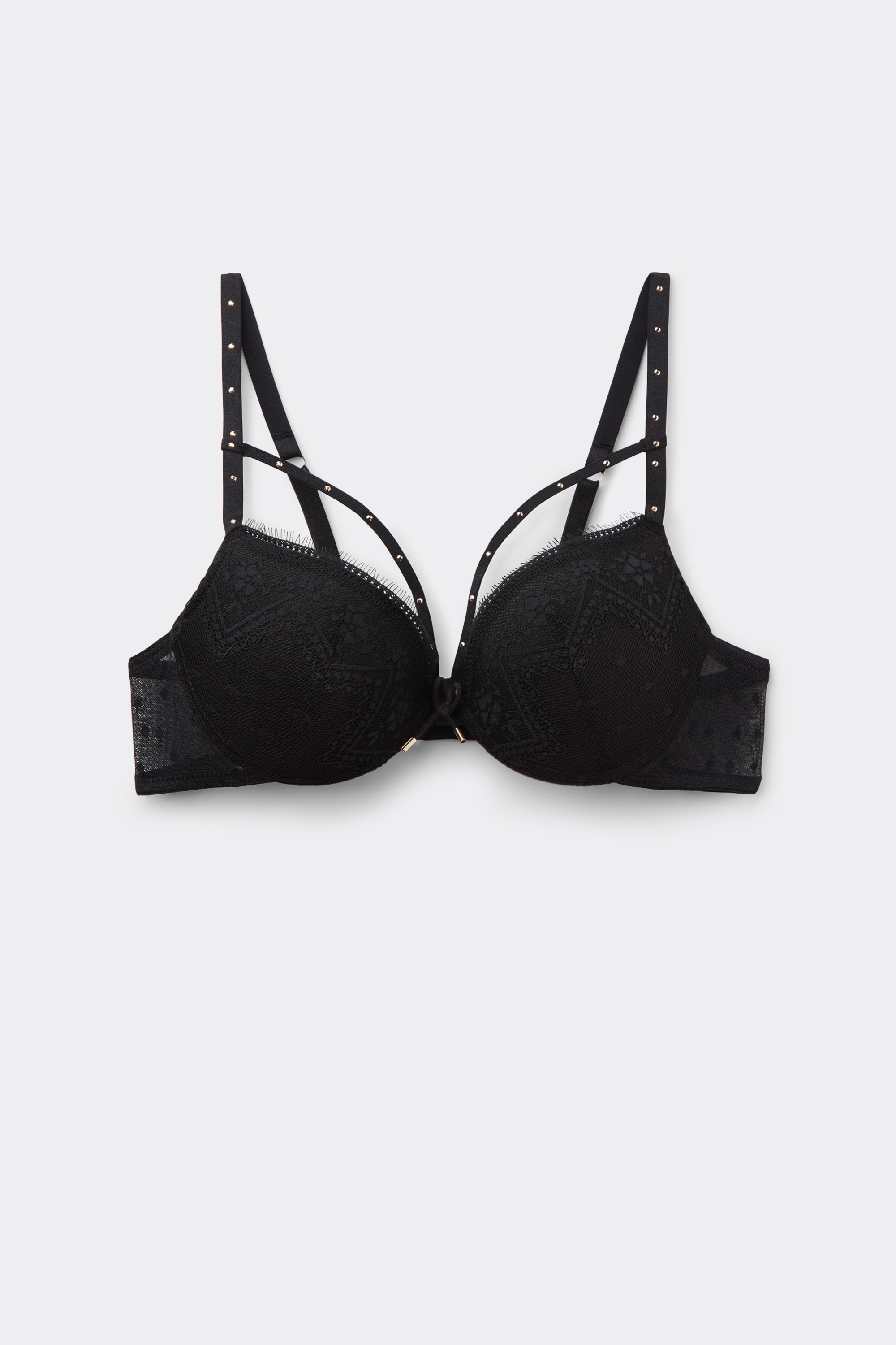 Бюстгальтер Simona с выраженным эффектом пуш-ап, выполненный из мягкого эластичного кружева с геометрическим узором и элегантного тюля с точечной вышивкой. Благодаря золотистым заклепкам чувственное переплетение эластичных тесемок в зоне декольте выглядит еще более интригующим. По центру груди изящный бантик с золотистым декором. Модель приподнимает грудь, создавая впечатляющий объем в зоне декольте.