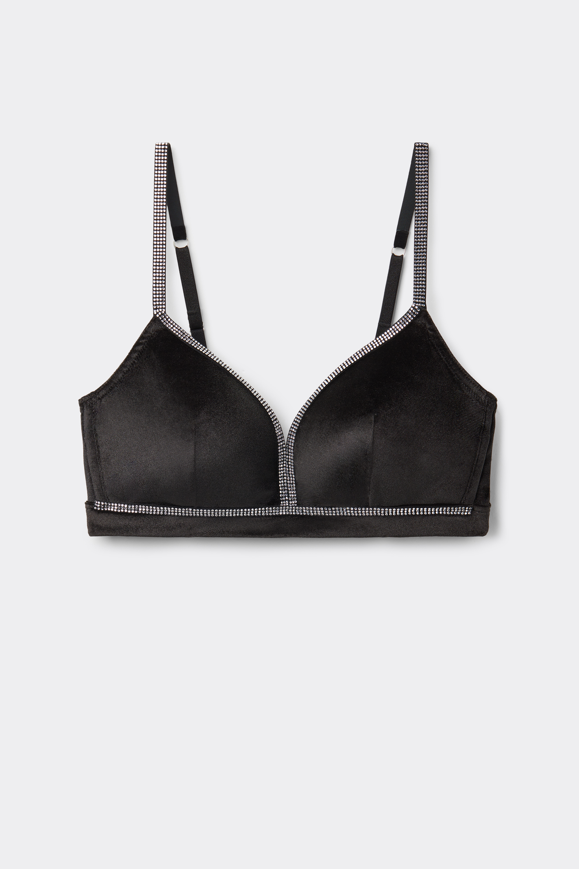 Бюстгальтер треугольник Tiziana из мягкого и элегантного бархата с отделкой стразами. Идеальный бюстгальтер с эффектом пуш-ап, придающий груди естественный и привлекательный вид. Его можно также носить на виду — под жакетом или прозрачным топом.