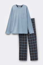 Длинная Пижама из Хлопка и Ткани в Клетку Голубого Цвета