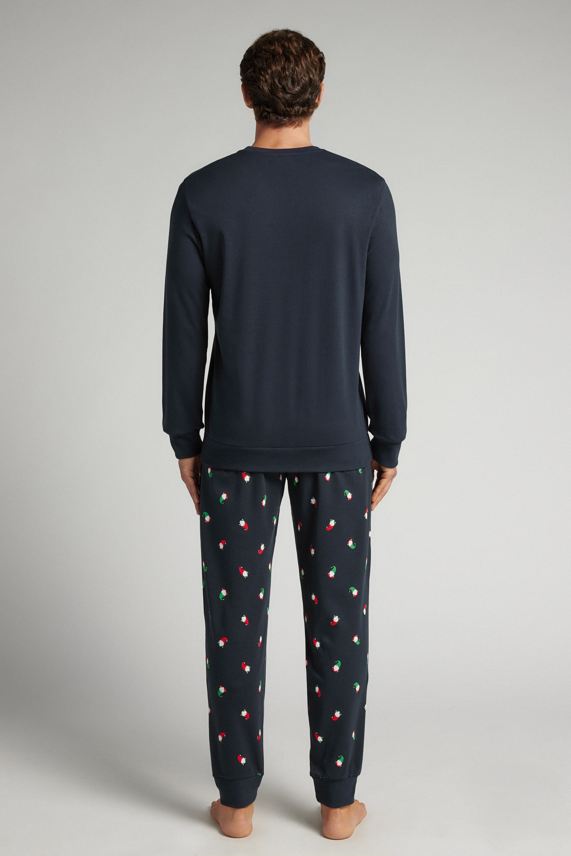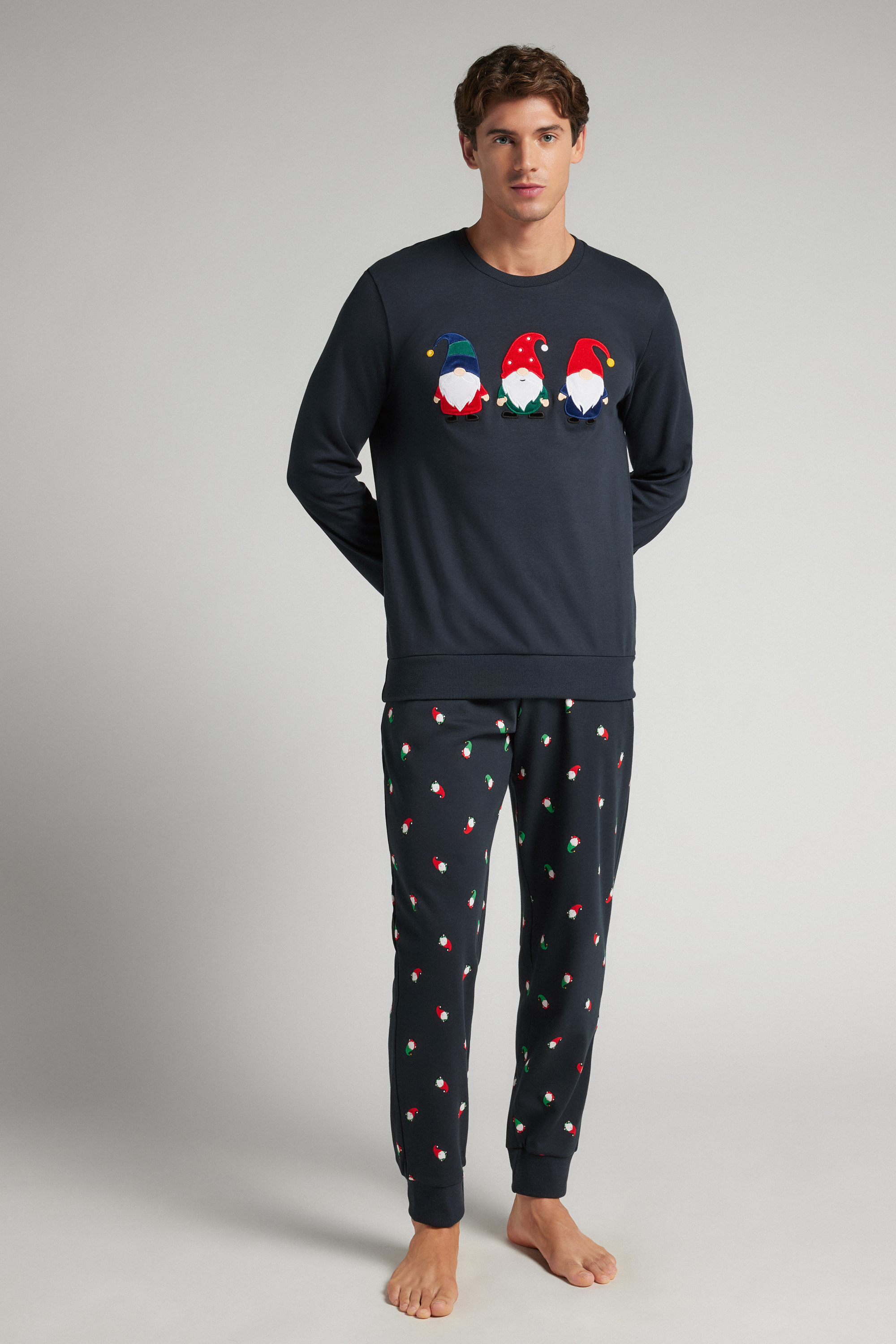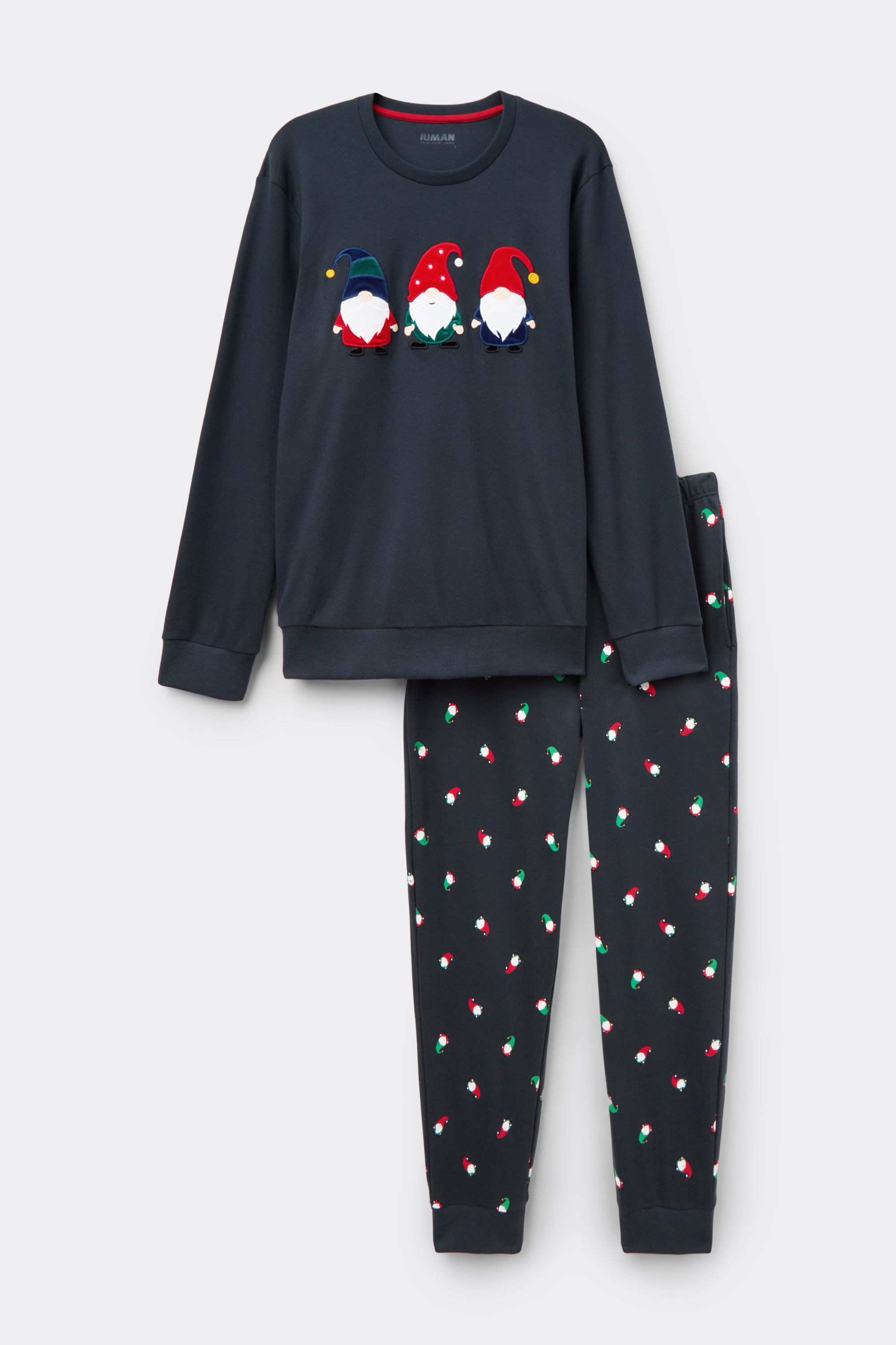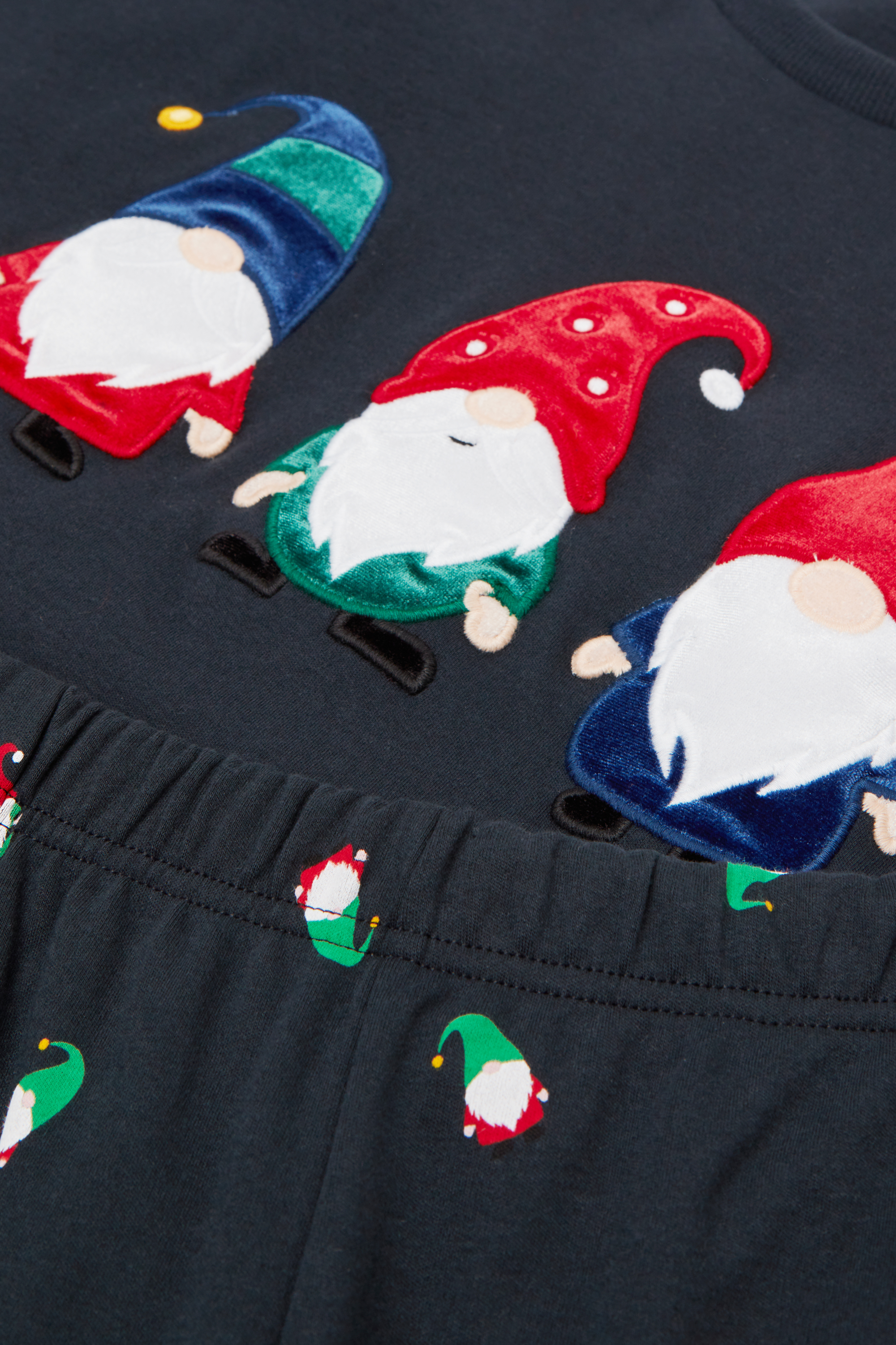 Длинная пижама из хлопкового трикотажа интерлок. Лонгслив с рождественской нашивкой в виде трех забавных гномов. Брюки с принтом гномов по всему изделию.
