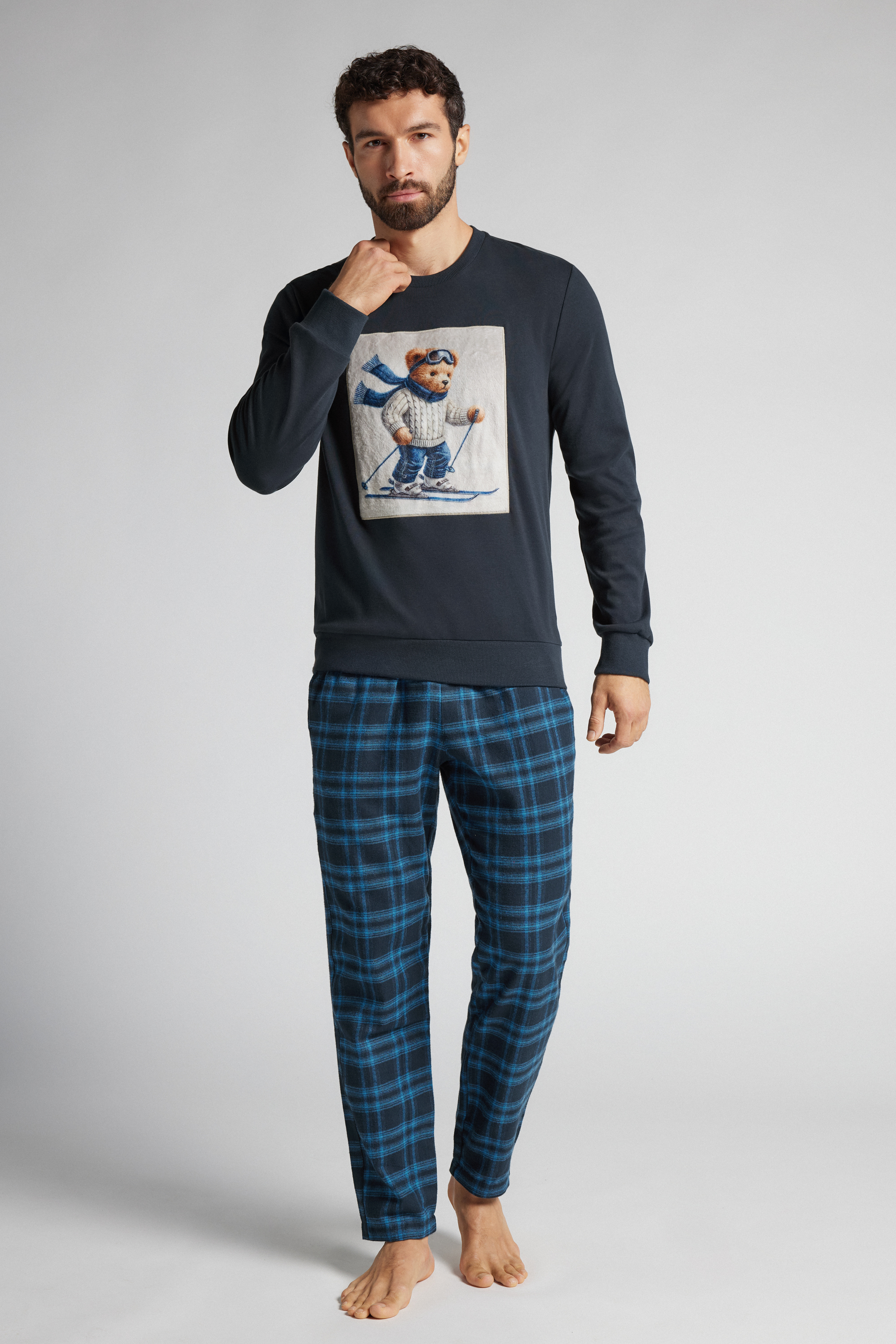 Длинная пижама из хлопка. Лонгслив с мягкой плюшевой нашивкой и принтом в виде медвежонка-лыжника. Брюки в клетку.