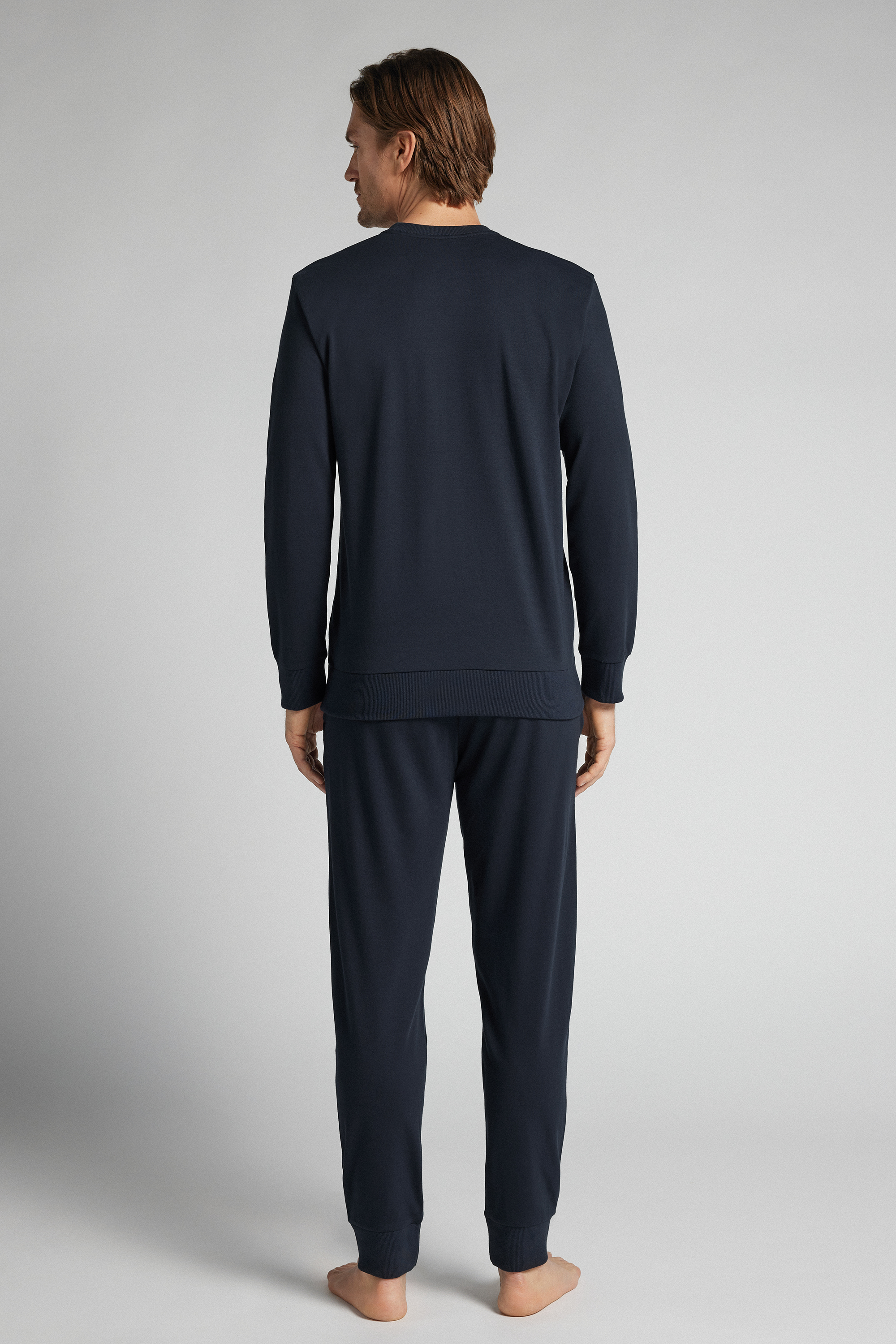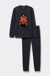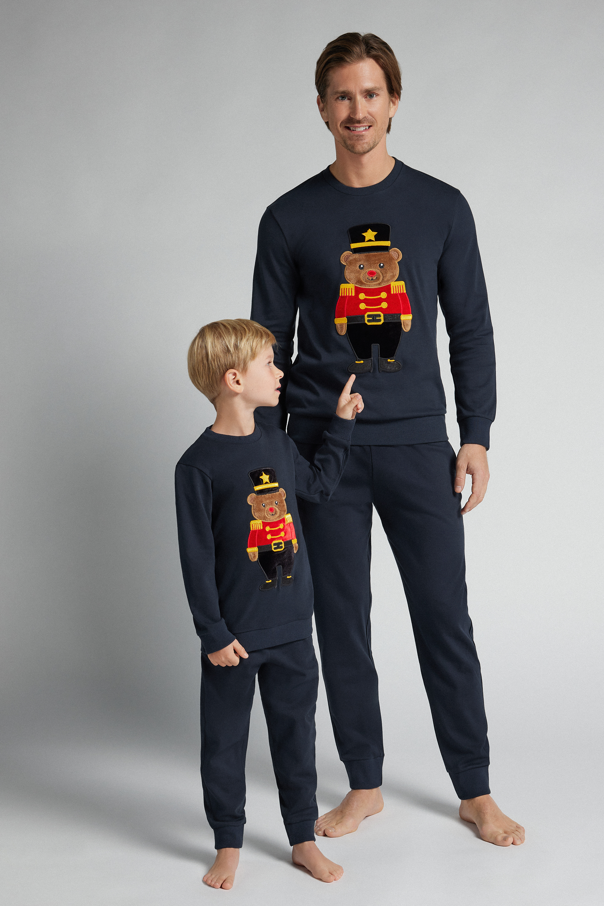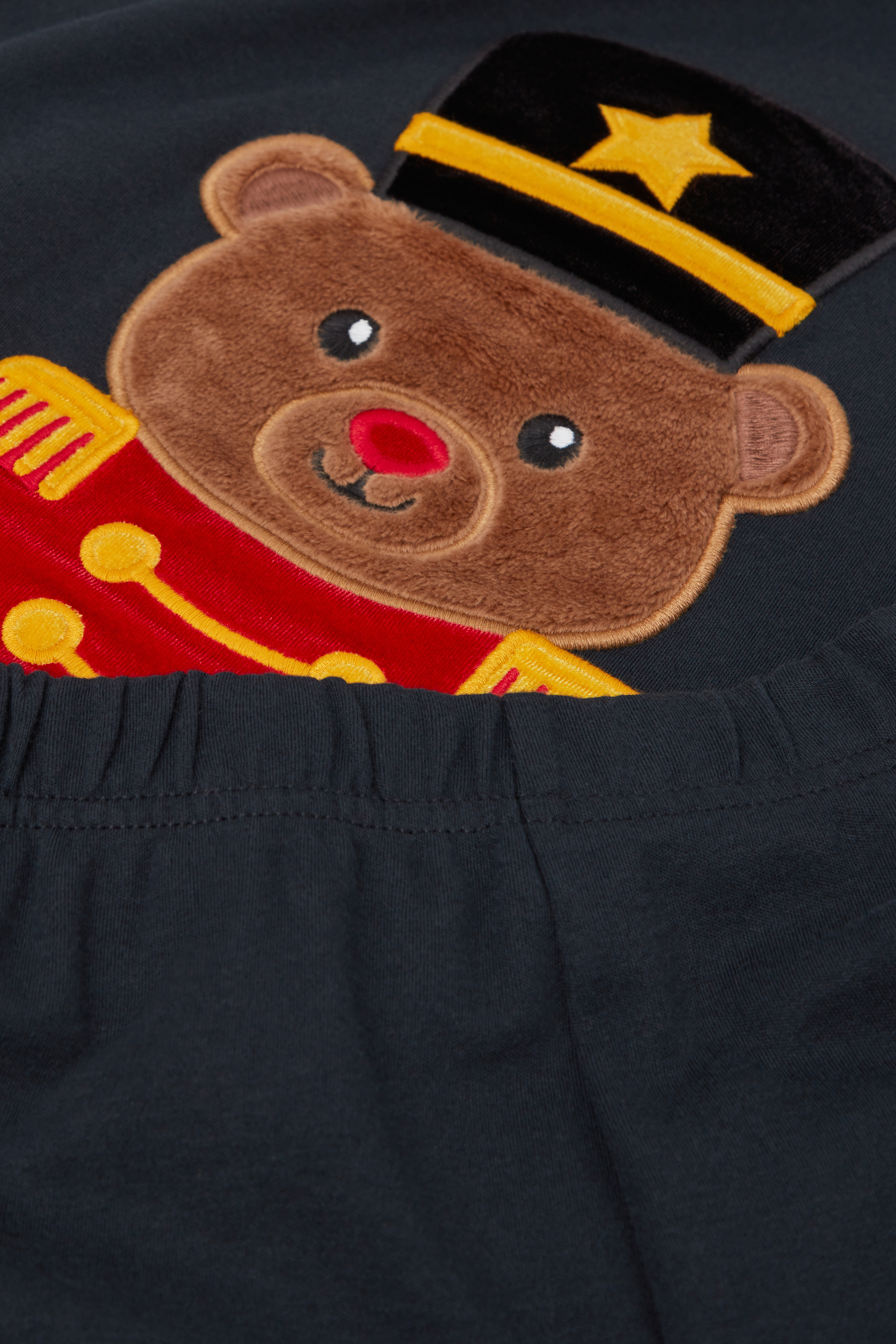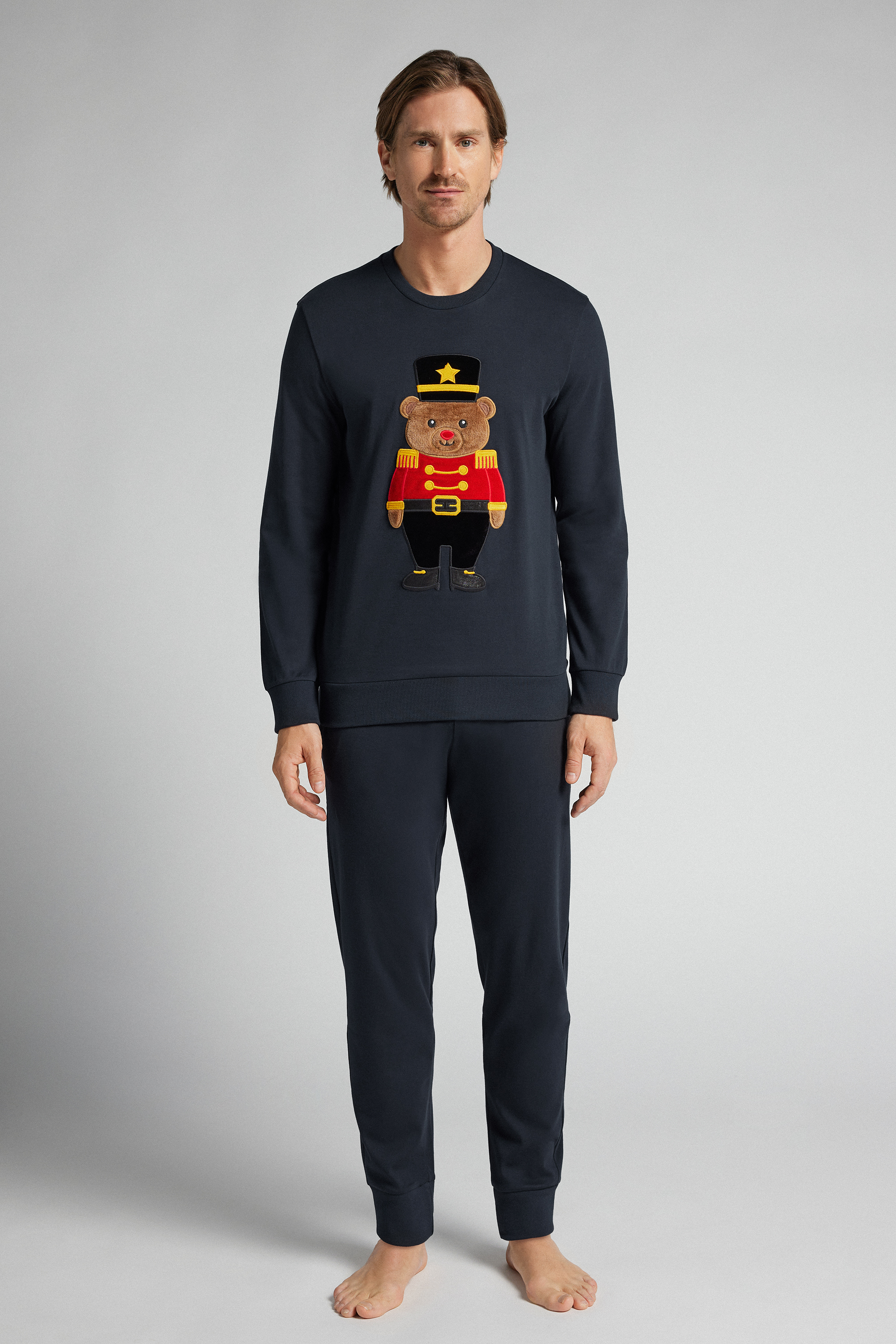 Однотонная длинная пижама из хлопкового трикотажа интерлок синего цвета. Лонгслив с мягкой нашивкой в виде медвежонка «Щелкунчика» из бархата и плюша.