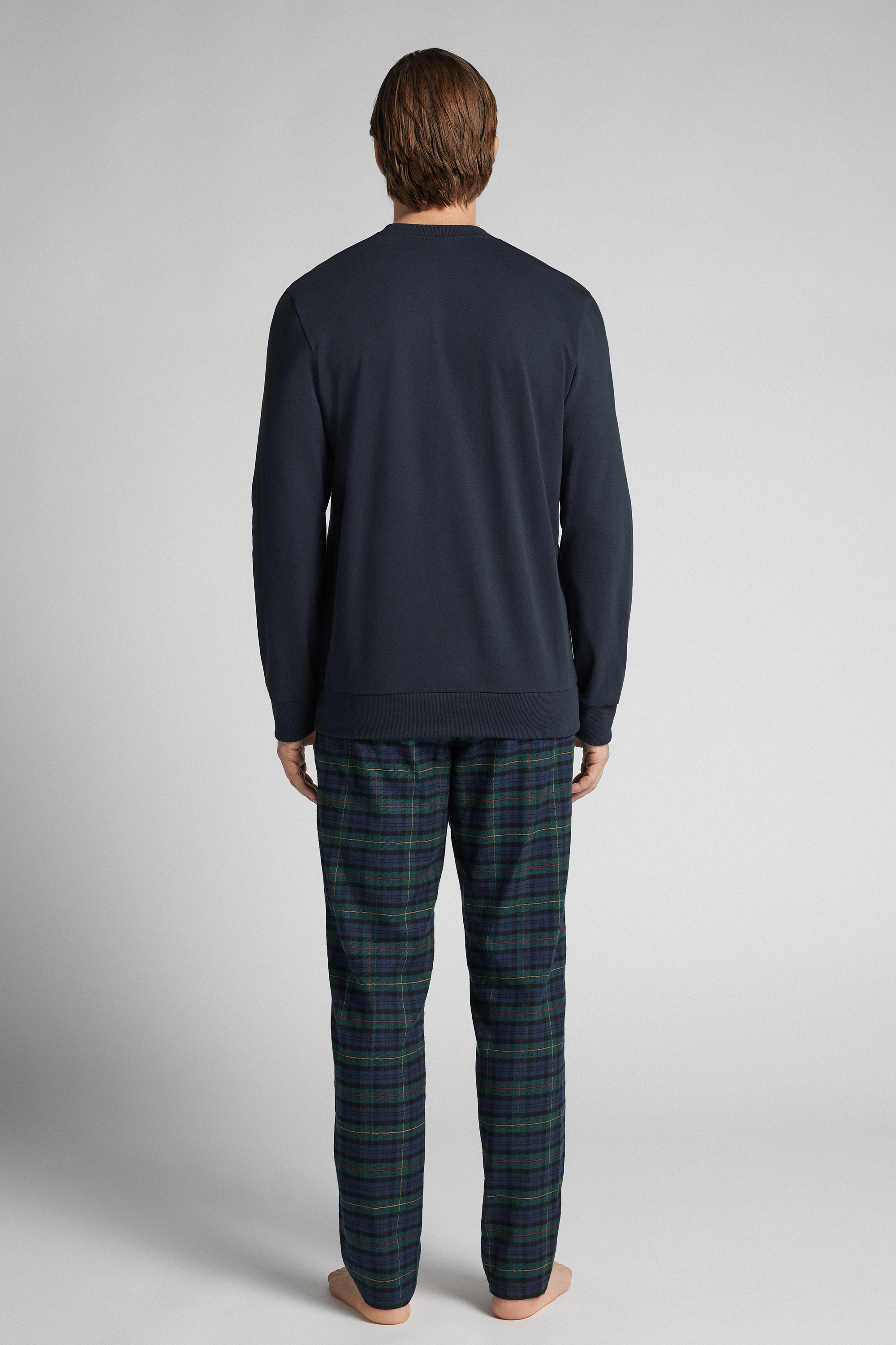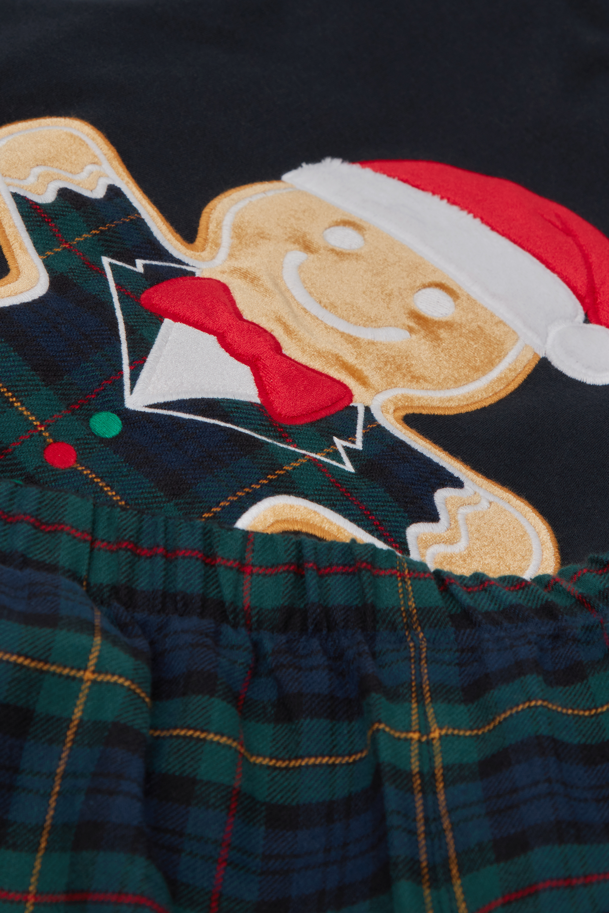 Длинная пижама из хлопкового трикотажа интерлок. Лонгслив украшен мягкой аппликацией «Пряничный человечек» из разных видов ткани. Брюки из ткани с ворсом в клетку тартан.