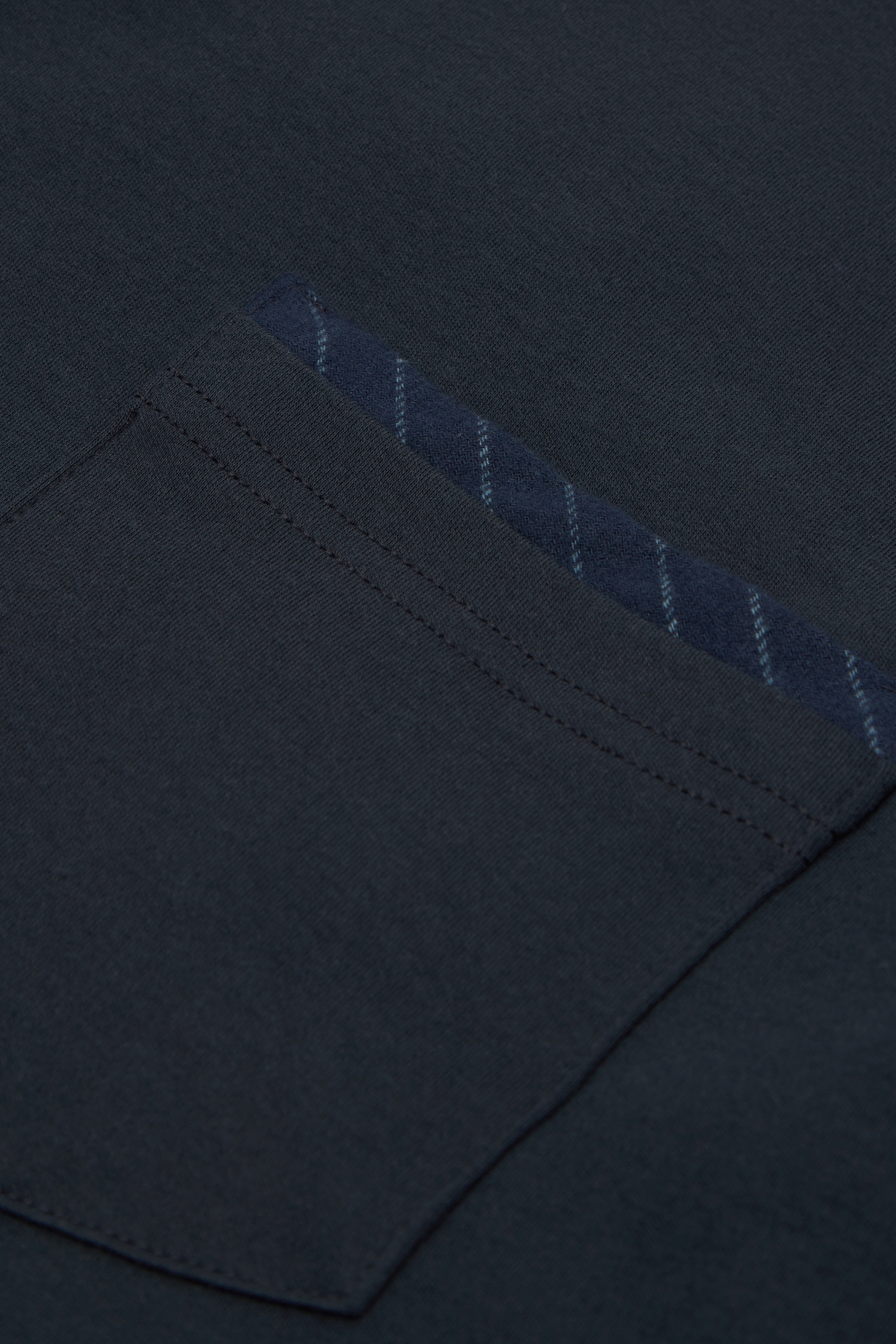 Длинная пижама из хлопкового трикотажа интерлок. Однотонный лонгслив с отделкой в тонкую полоску на нагрудном кармашке. Брюки в тонкую полоску.