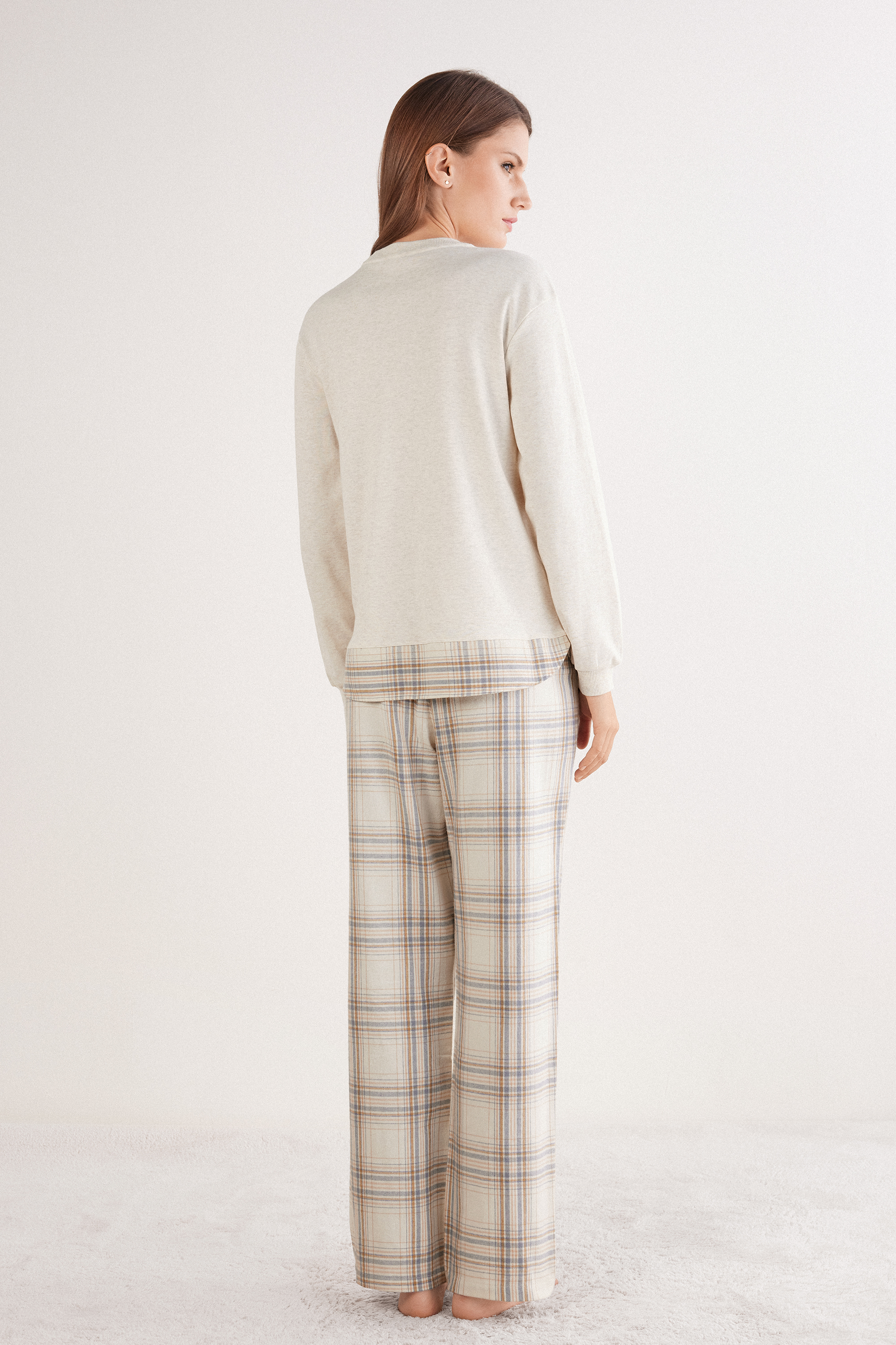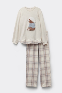 Длинная пижама. Лонгслив из хлопкового трикотажа интерлок. На груди очаровательная нашивка в виде медвежонка из ткани с эффектом меха, украшенная трикотажными деталями. Низ отделан тканью с тем же рисунком, что и на брюках, — словно нижний край рубашки выглядывает из-под лонгслива. Брюки выполнены из хлопковой ткани с ворсом и клетчатым рисунком в натуральных пастельных тонах.
