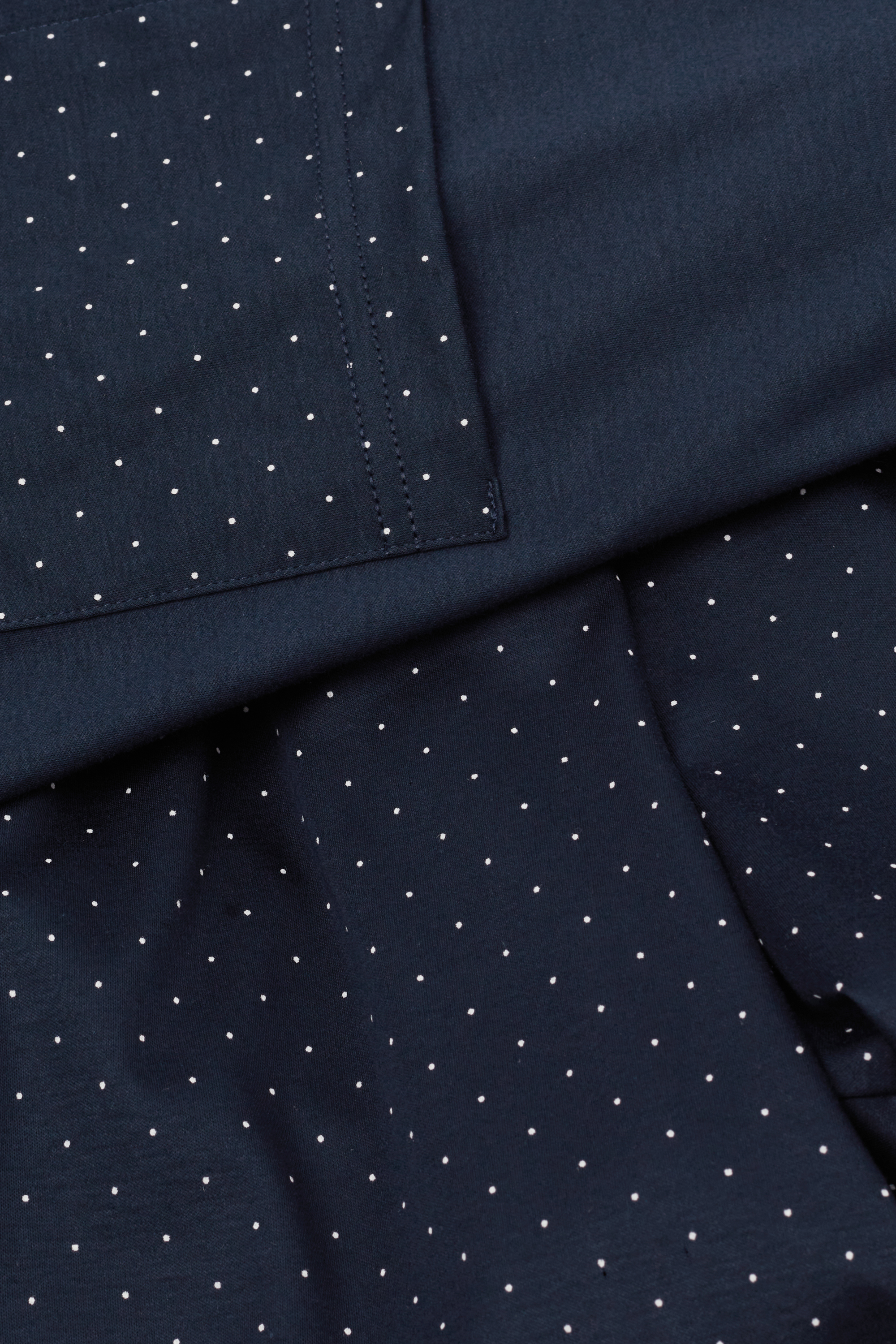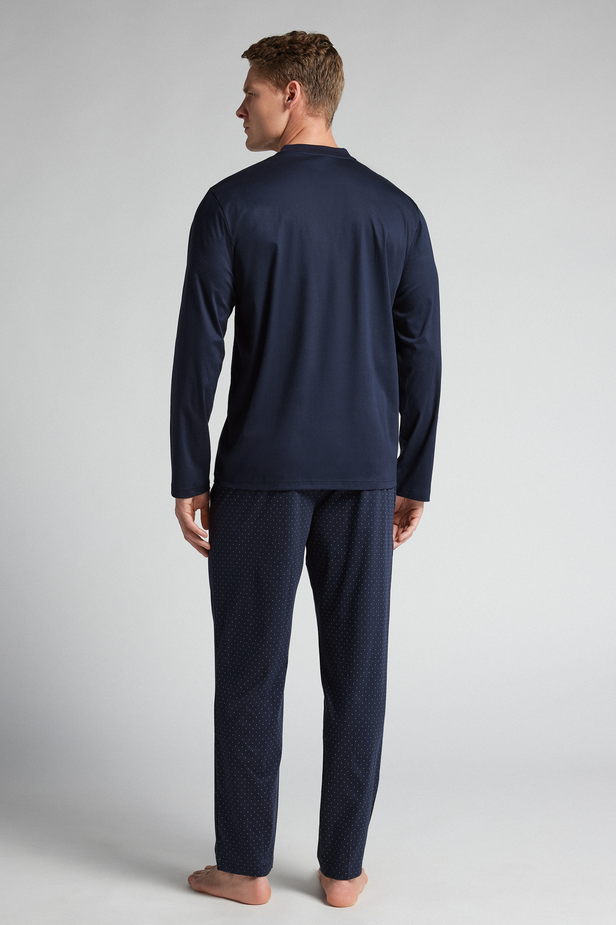 Длинная пижама из мерсеризованного хлопка Premium. На однотонном лонгсливе нагрудный кармашек в горошек. Брюки тоже из ткани в горошек.