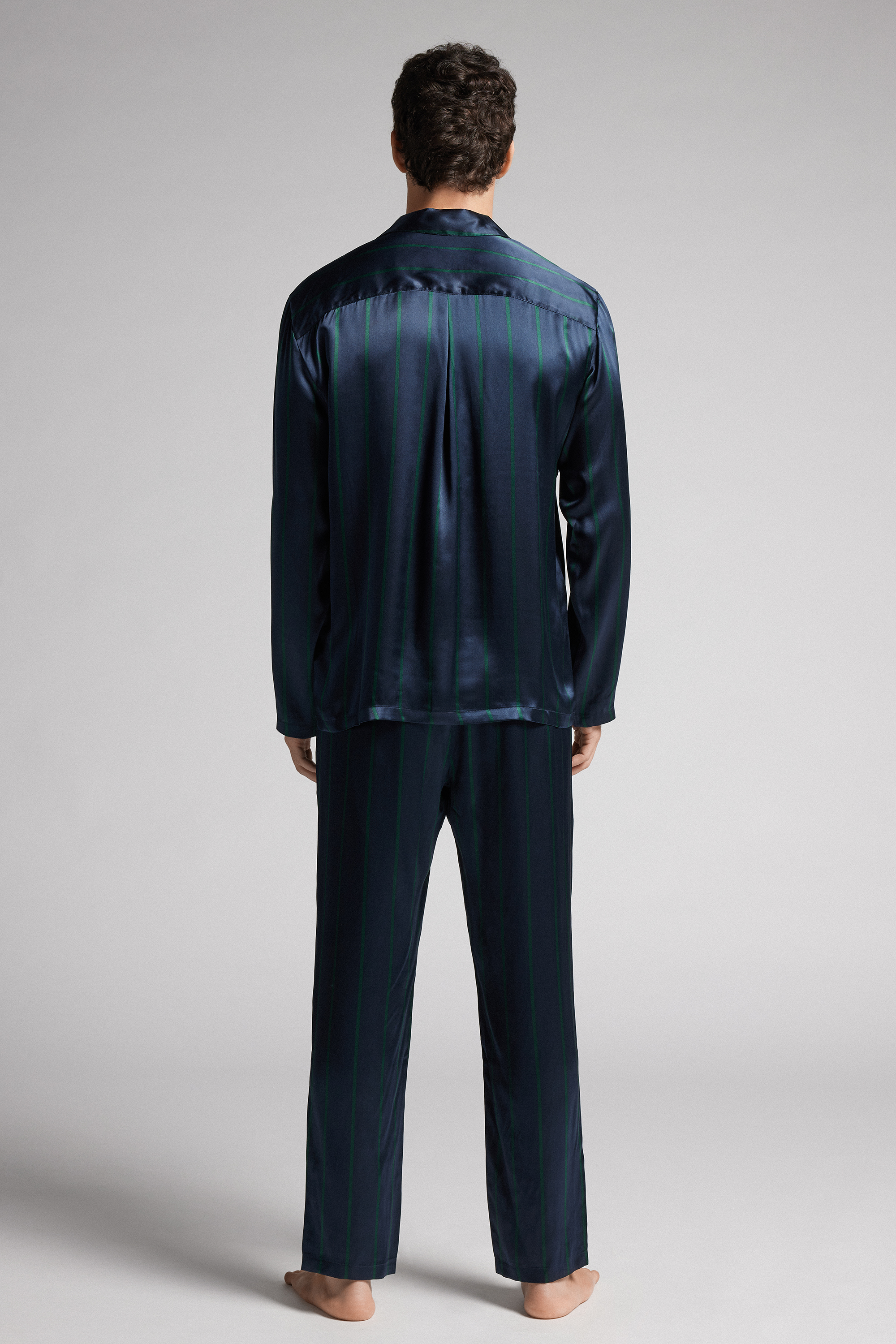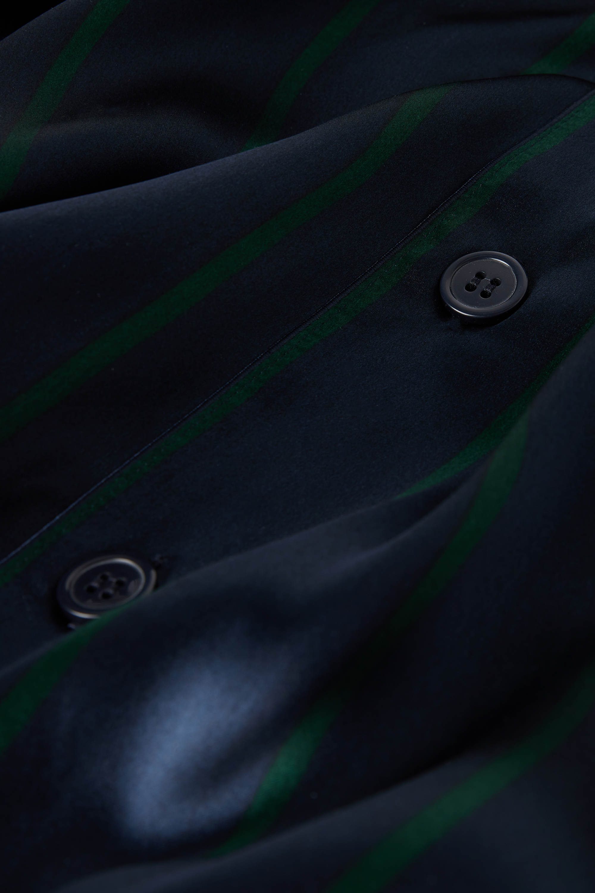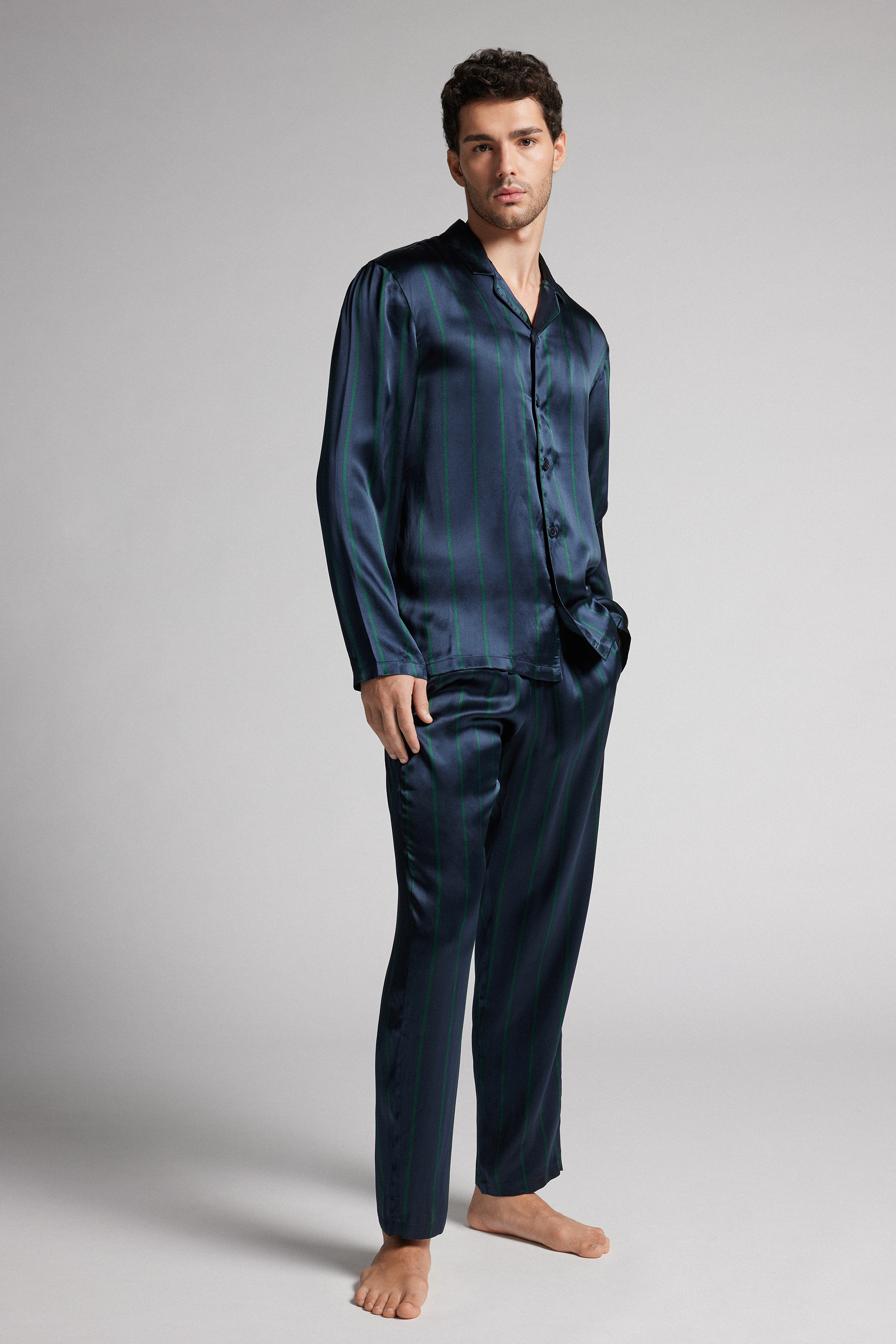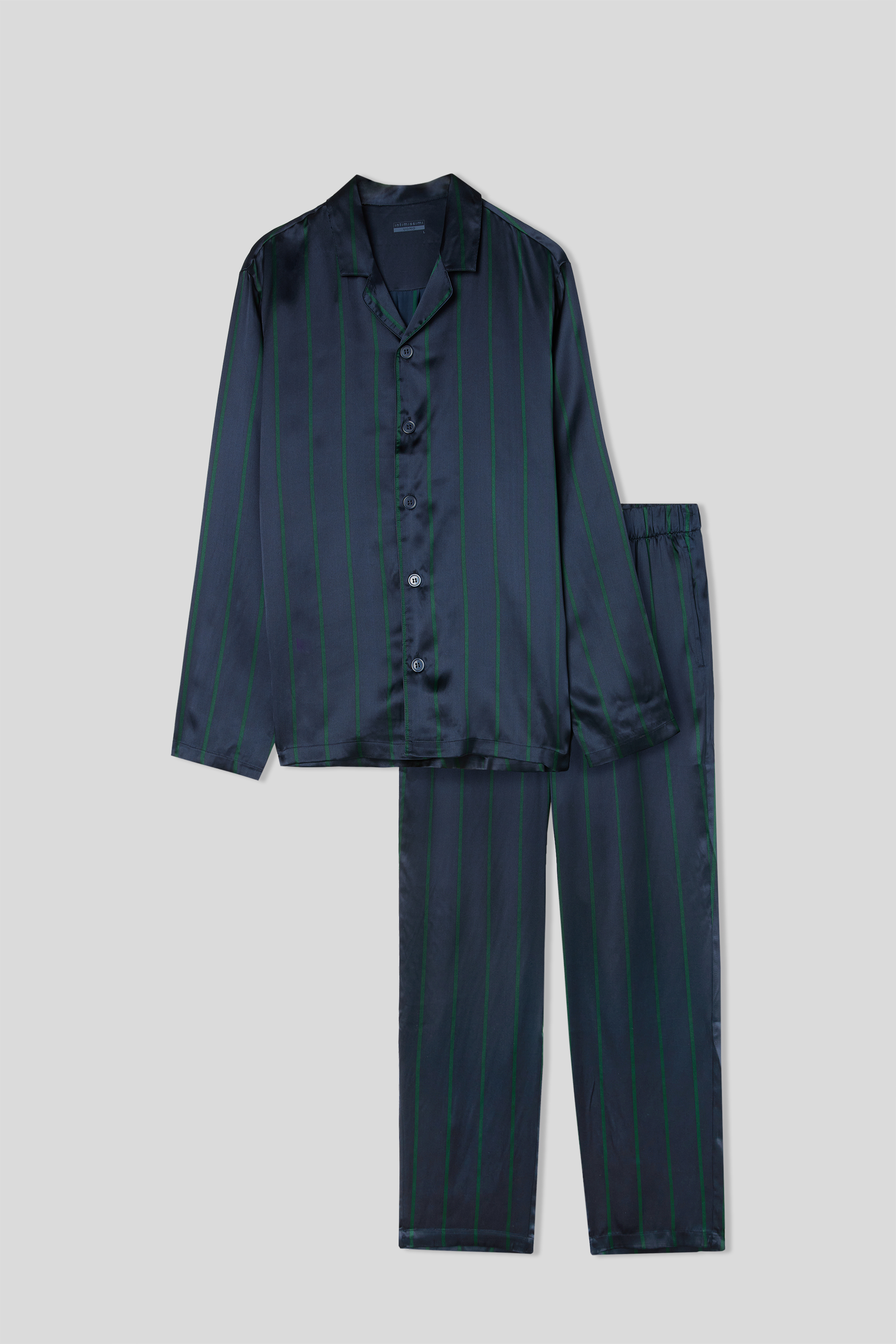 Длинная пижама из шелкового атласа в полоску. Рубашка с лацканами и пуговичной застежкой по центру. Брюки с боковыми карманами. Стандартная посадка.