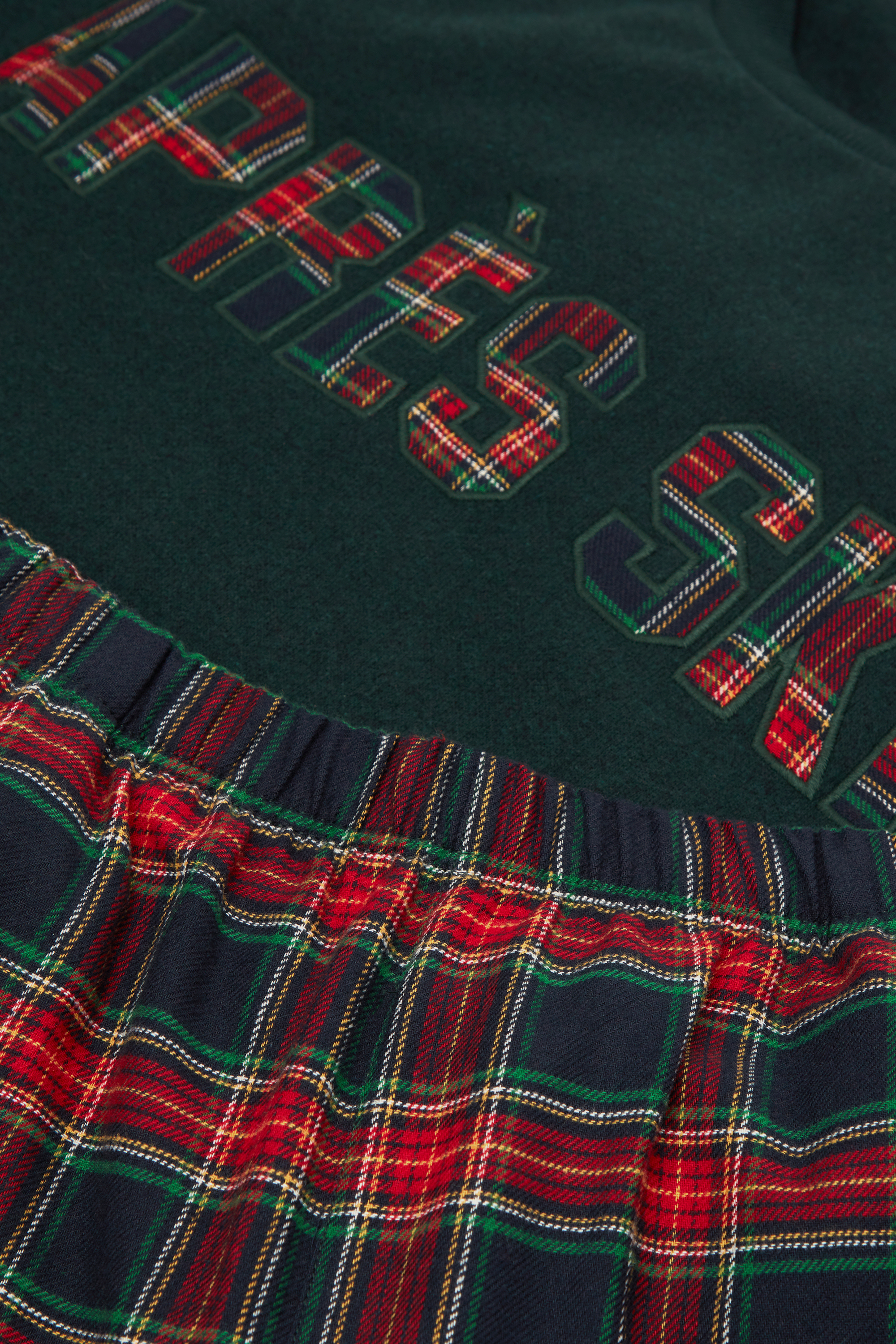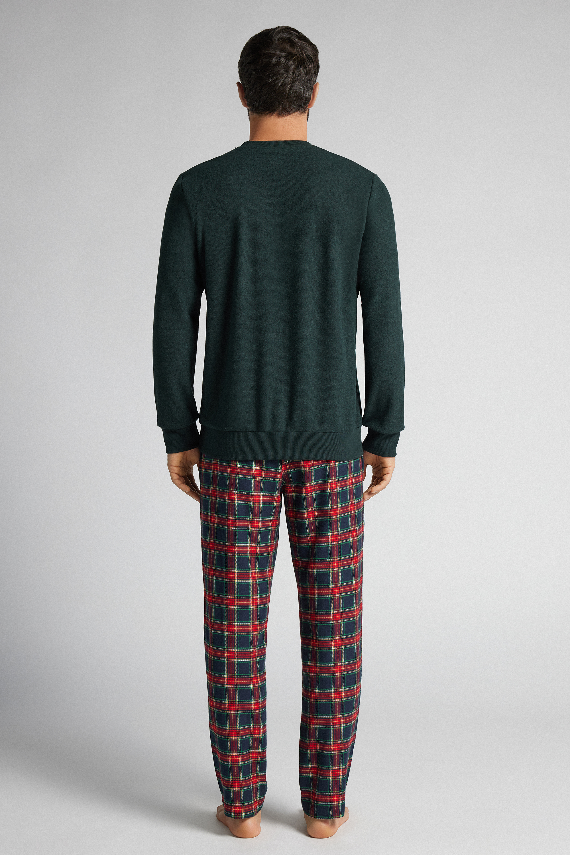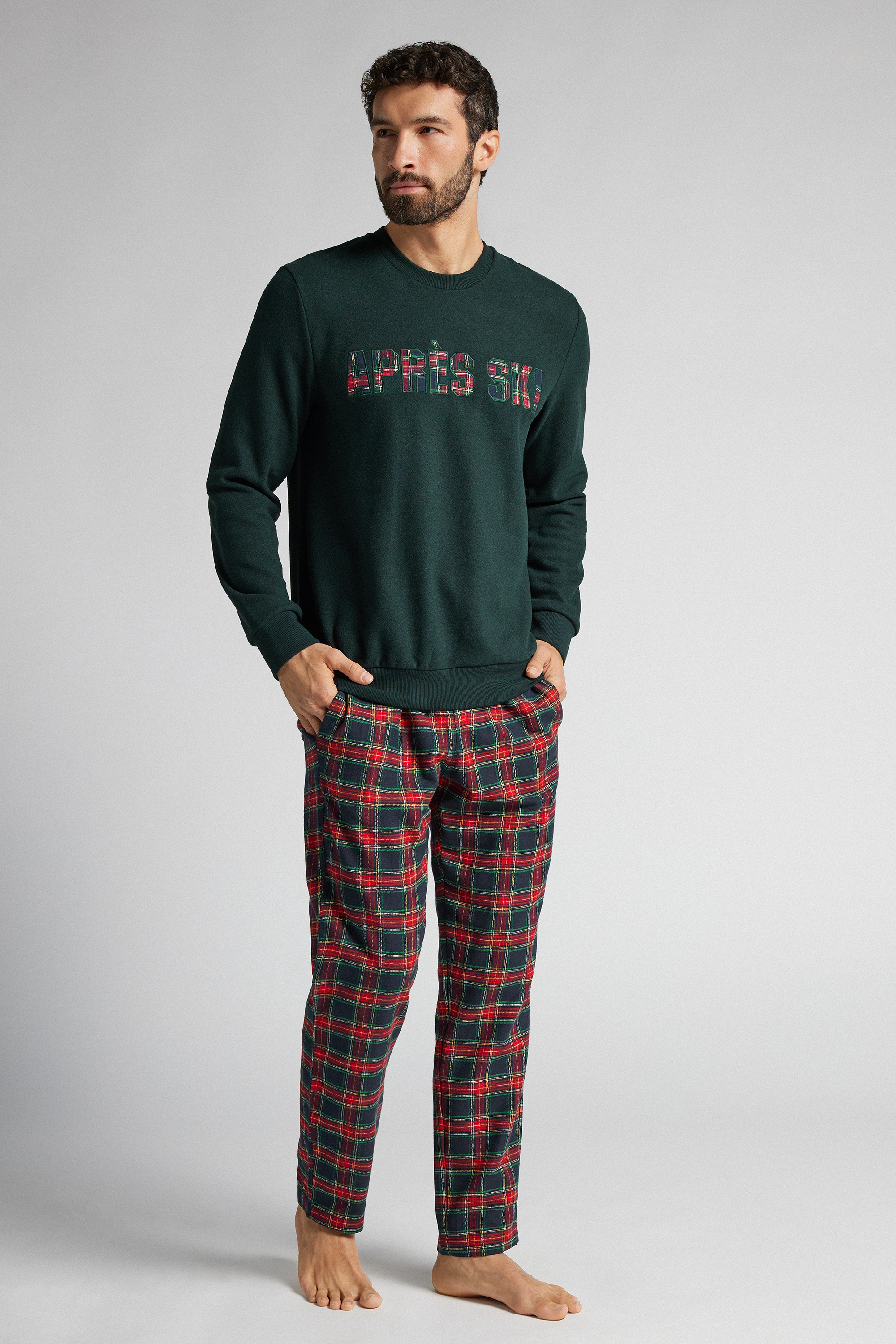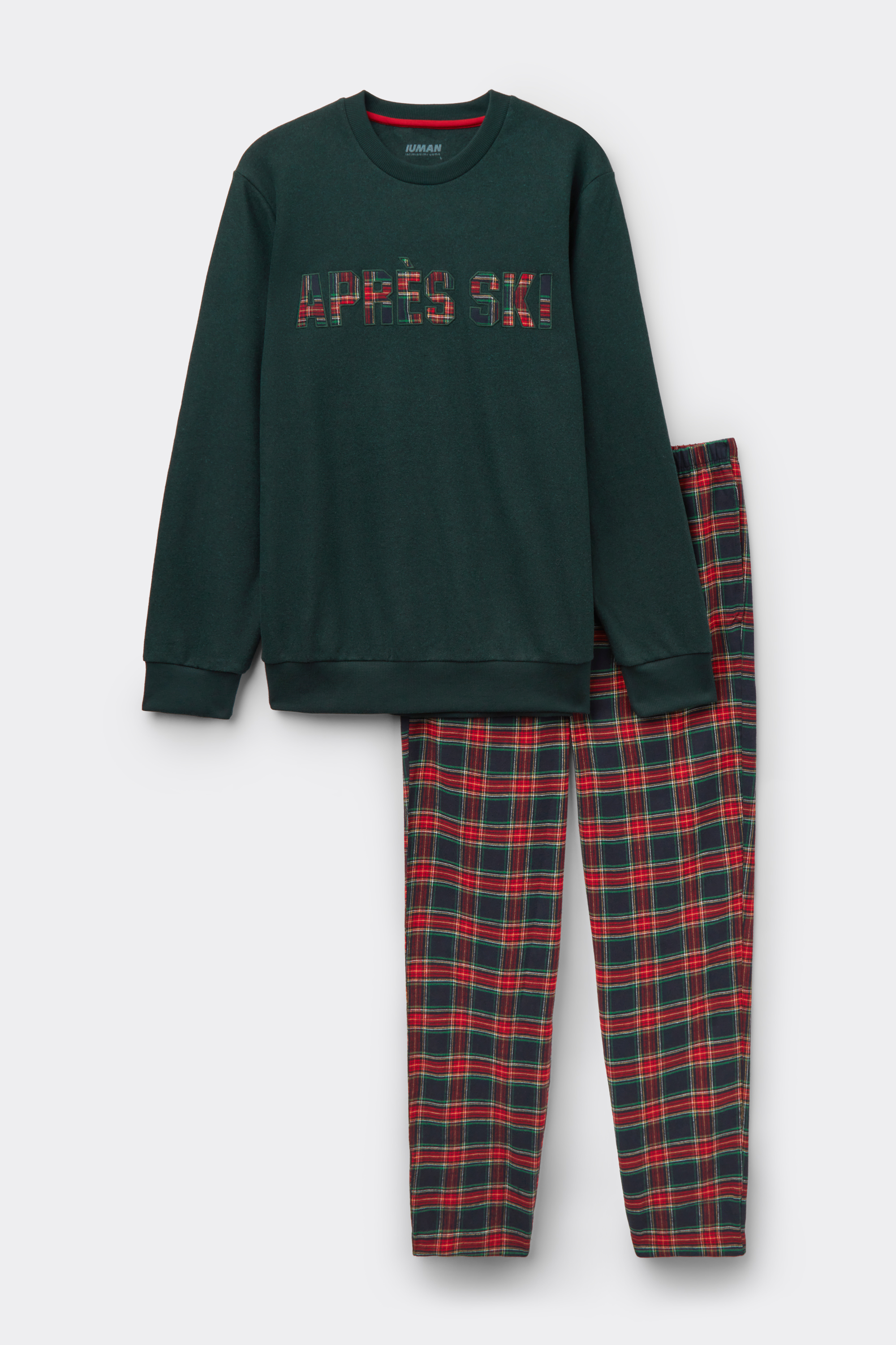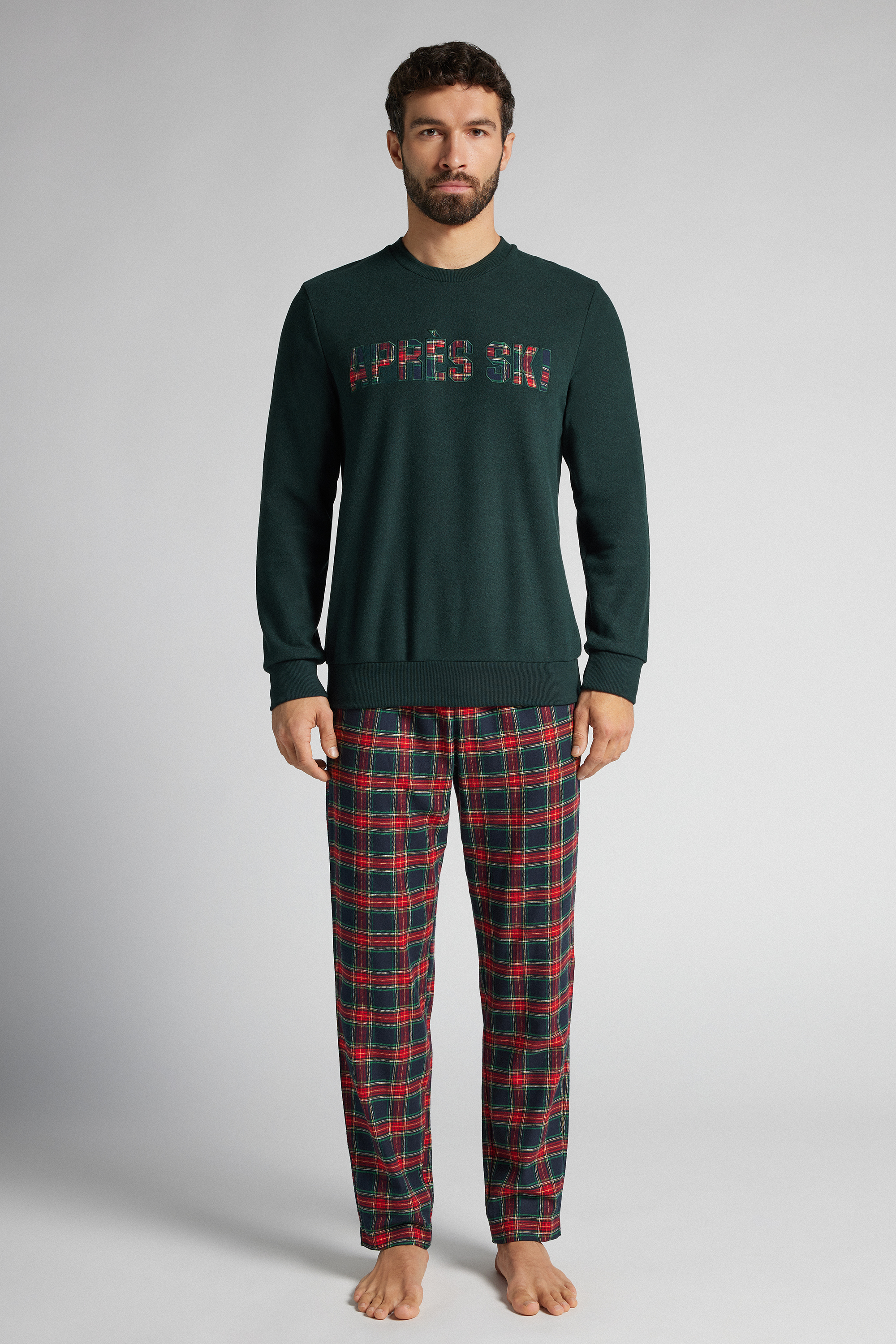 Длинная пижама из трикотажной ткани. Лонгслив с надписью Après-Ski в клетку. Клетчатые брюки из ткани с ворсом.