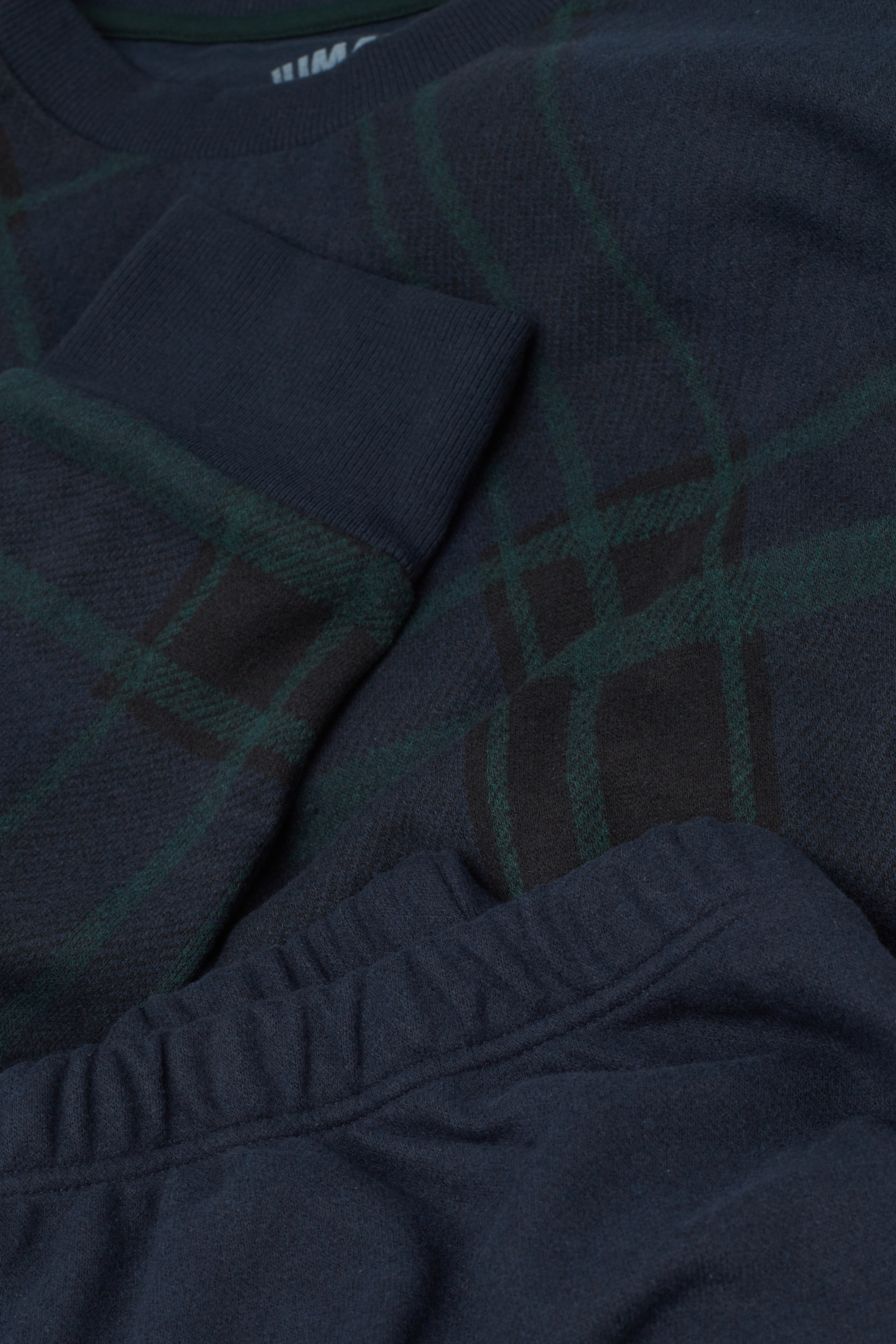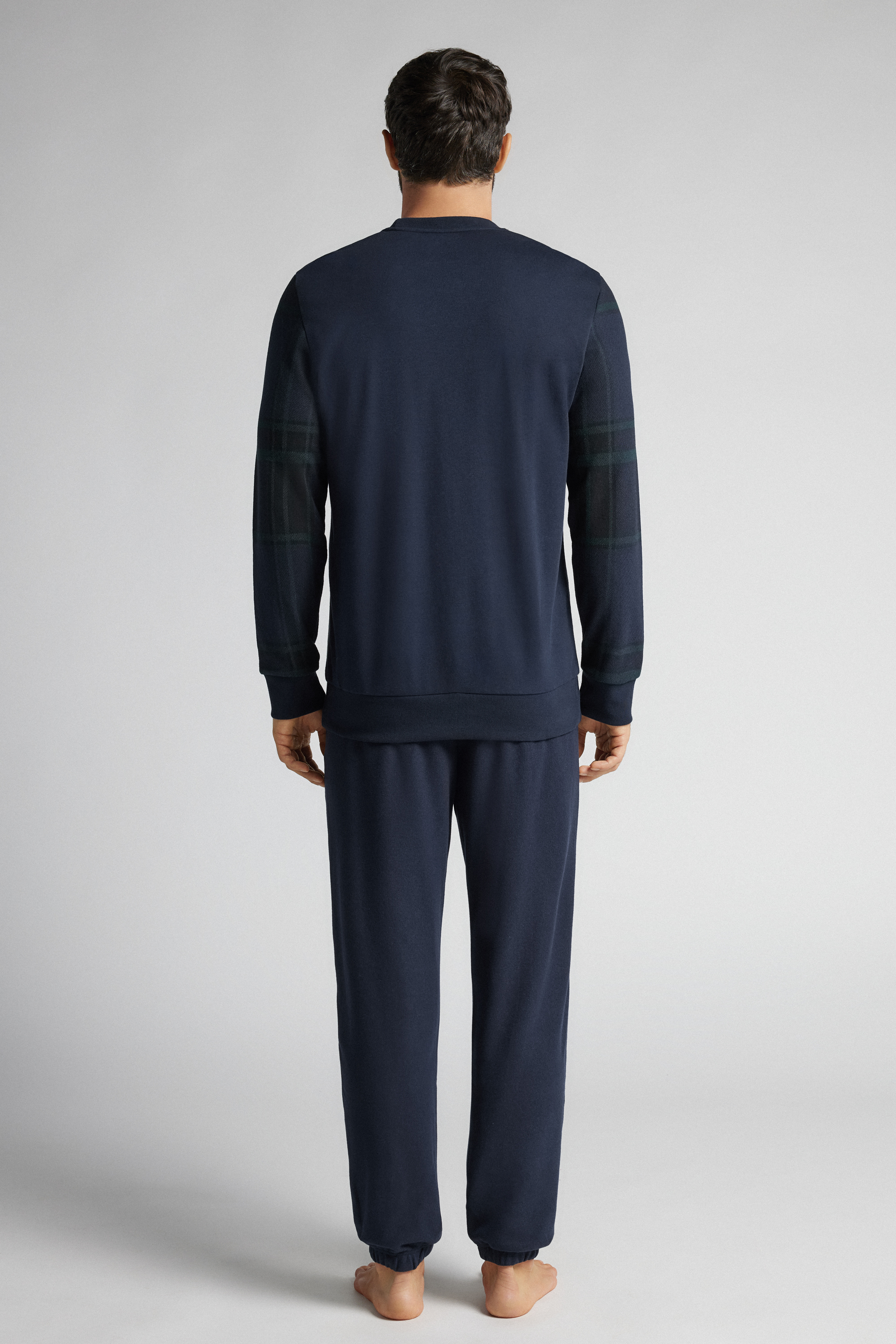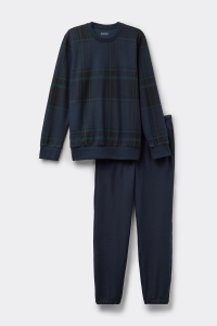 Длинная пижама из трикотажной ткани. Лонгслив в крупную клетку. Однотонные брюки синего цвета.