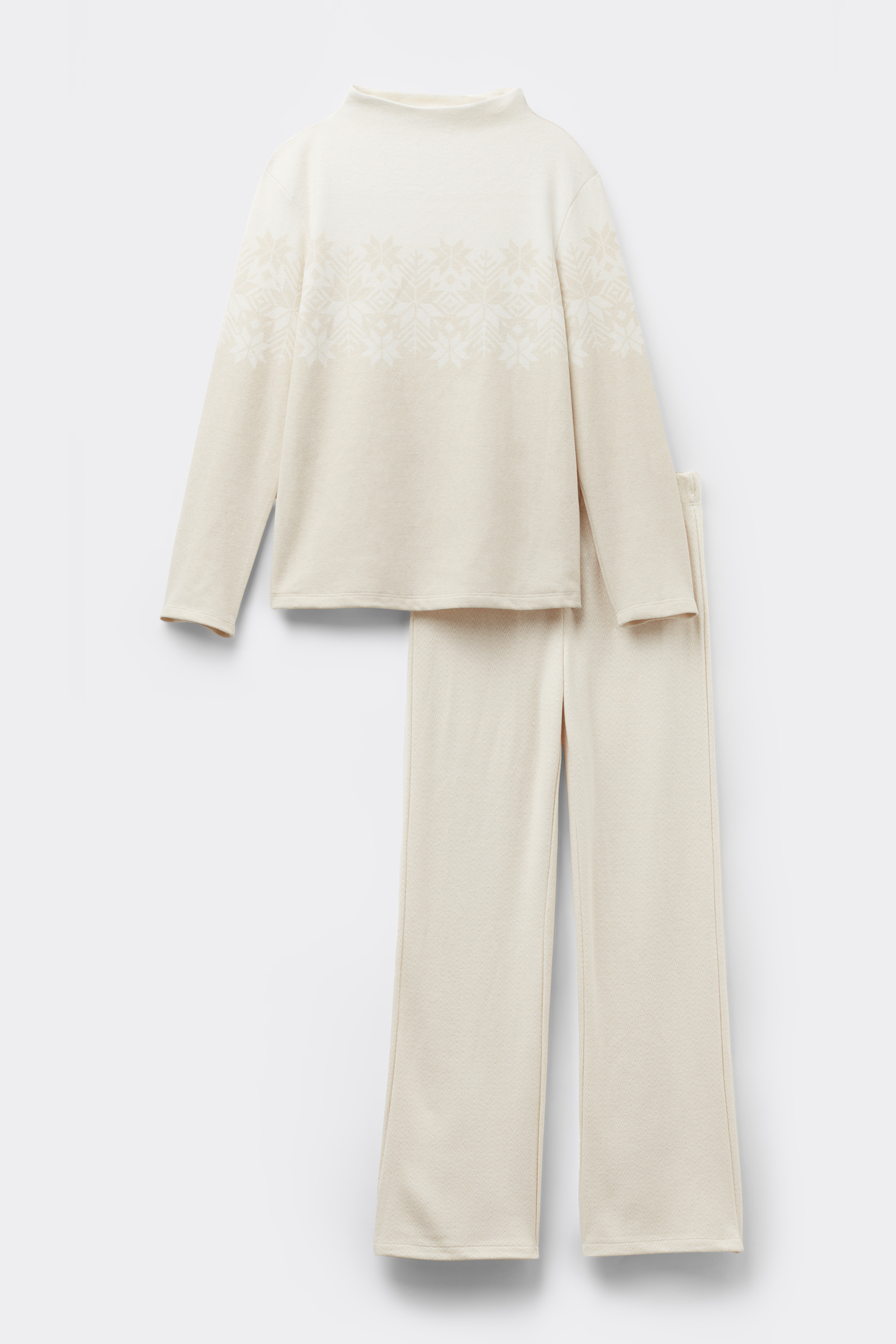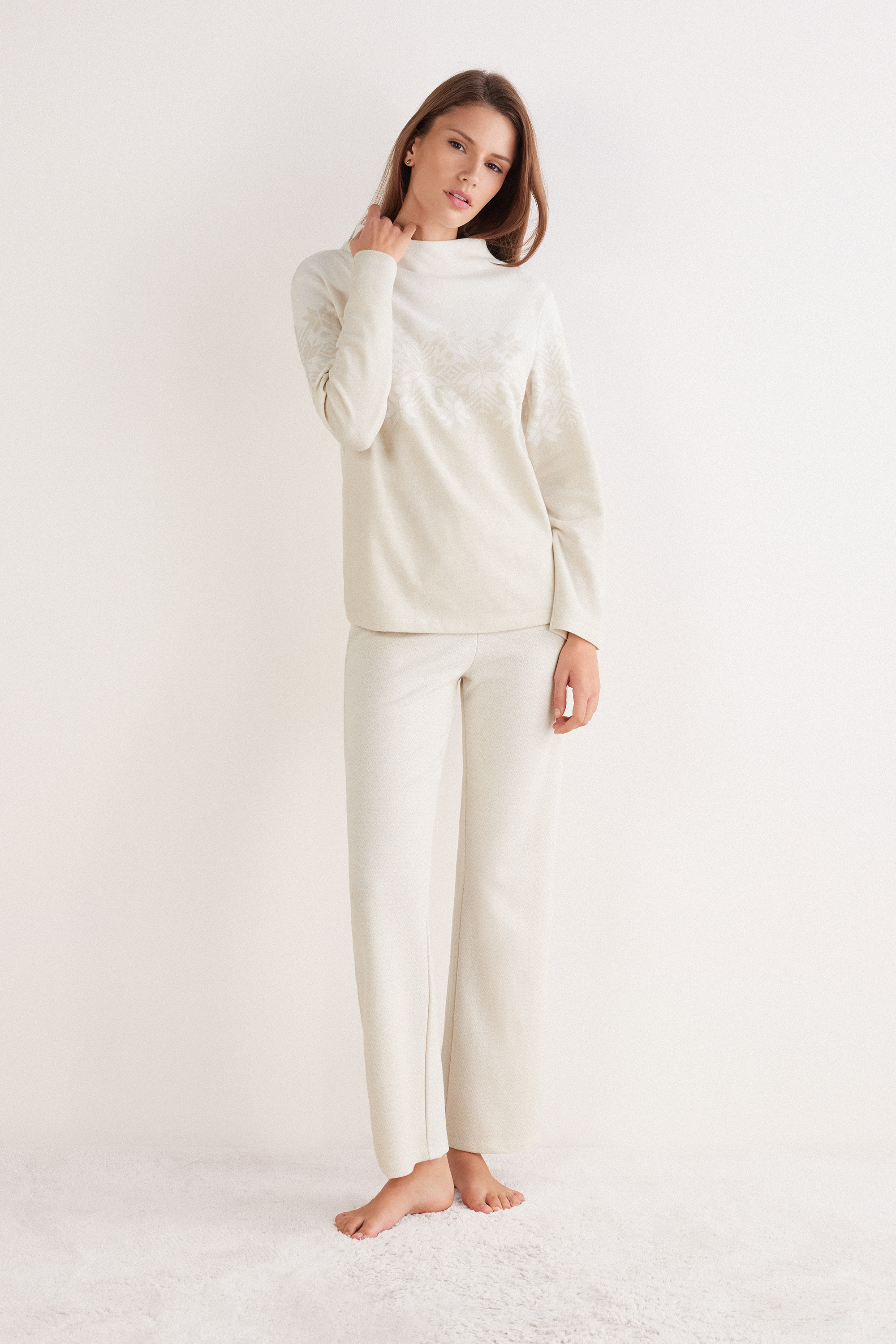 Длинная пижама из мягкого трикотажа с жаккардовым узором на брюках и лонгсливе. Мягкая и теплая пижама, напоминающая уютный зимний свитер.