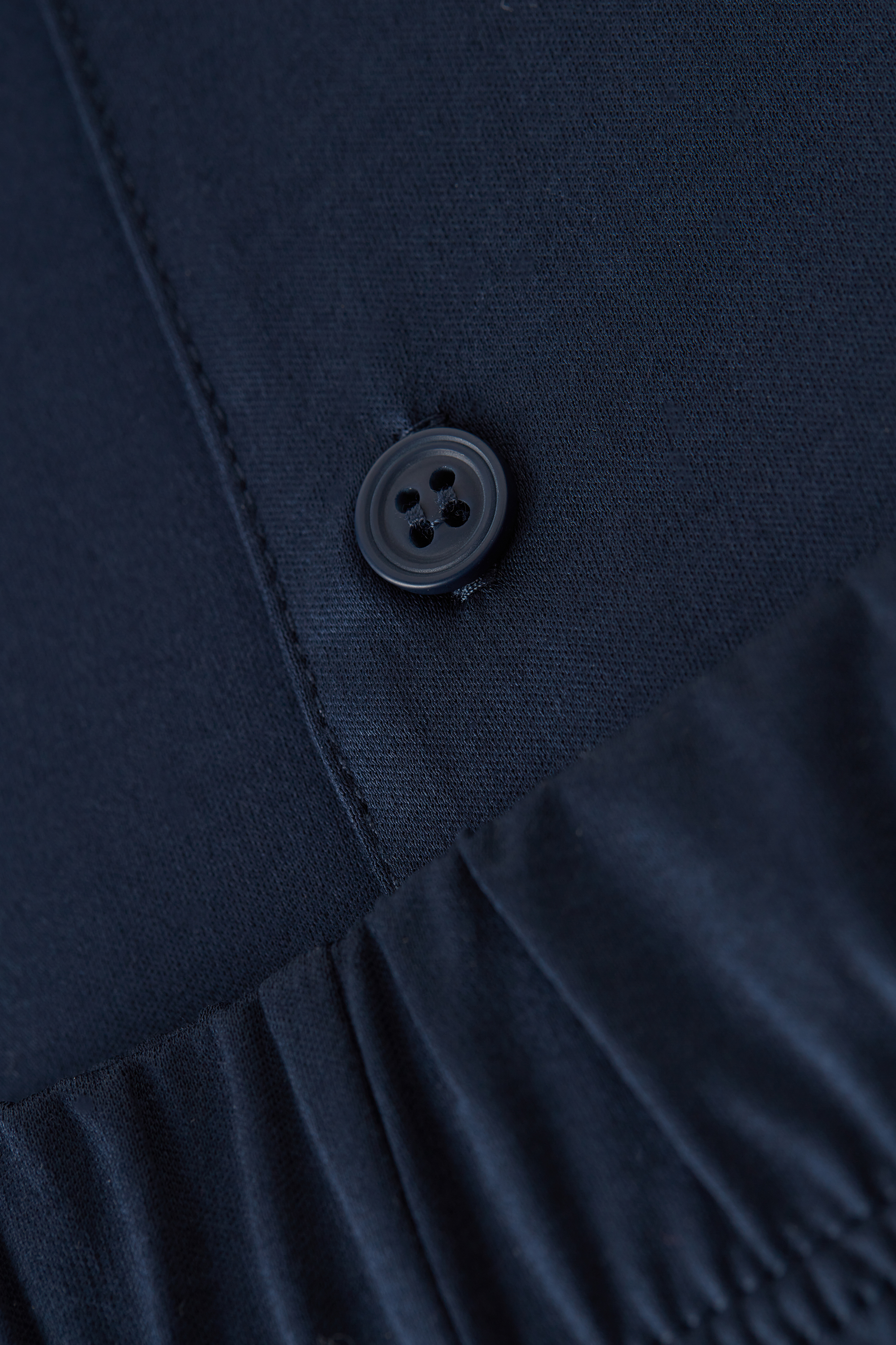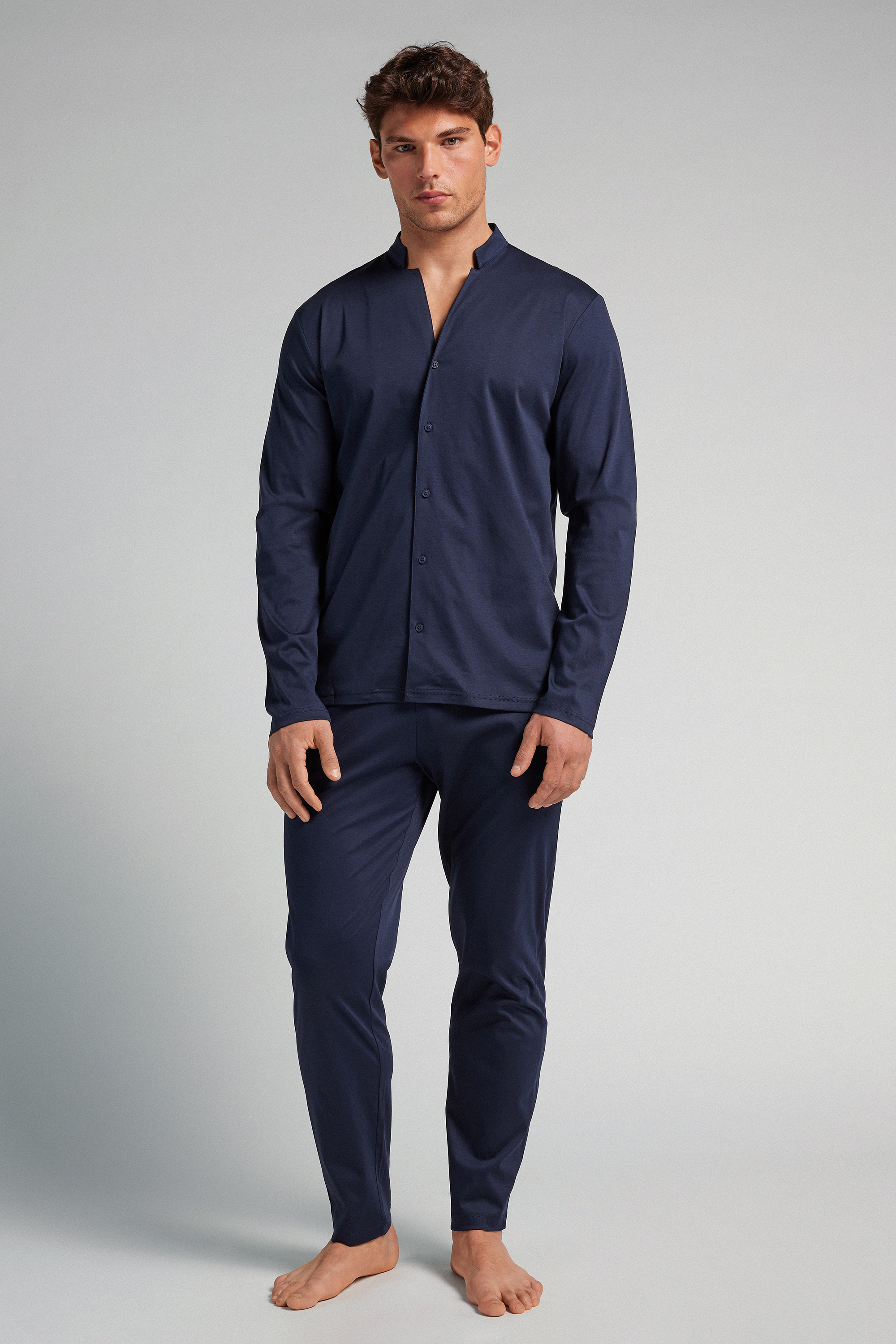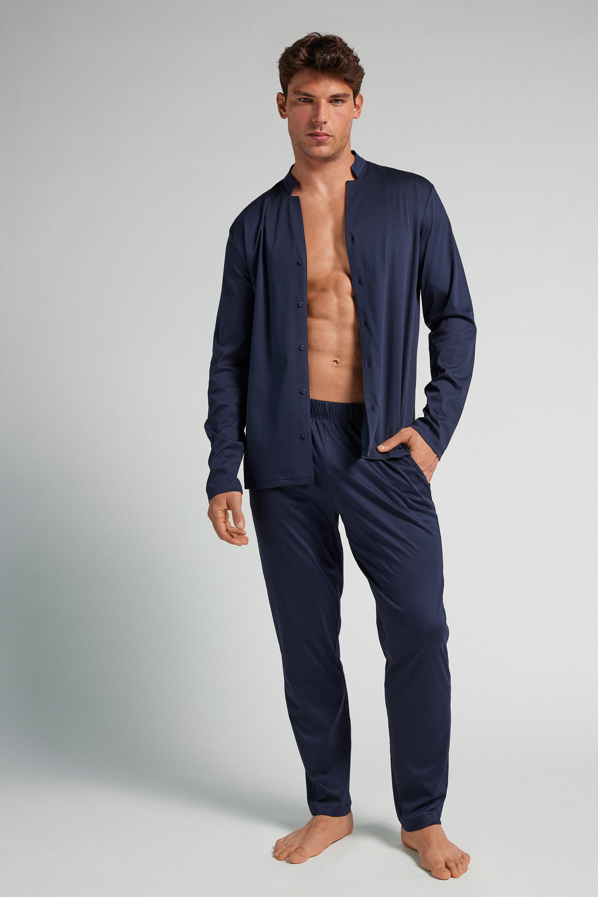 Длинная пижама из хлопкового трикотажа интерлок. Элегантная модель однотонной расцветки. Рубашка с лацканами и пуговичной застежкой по центру. Длинные брюки.