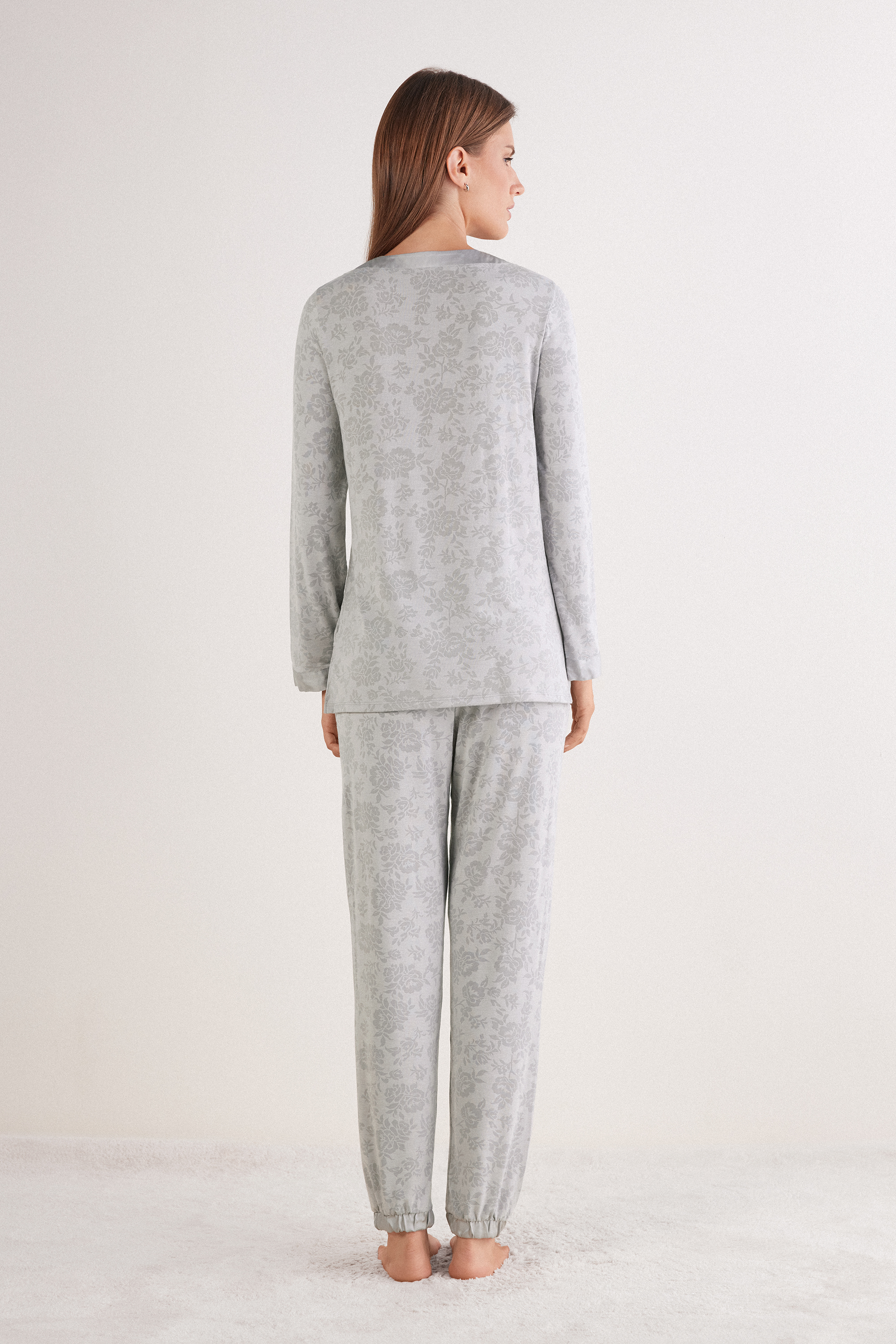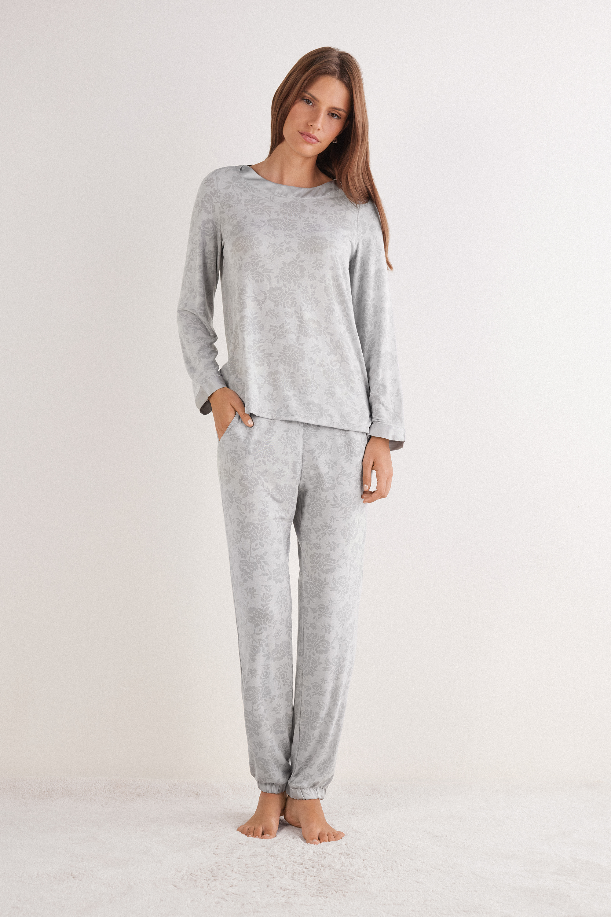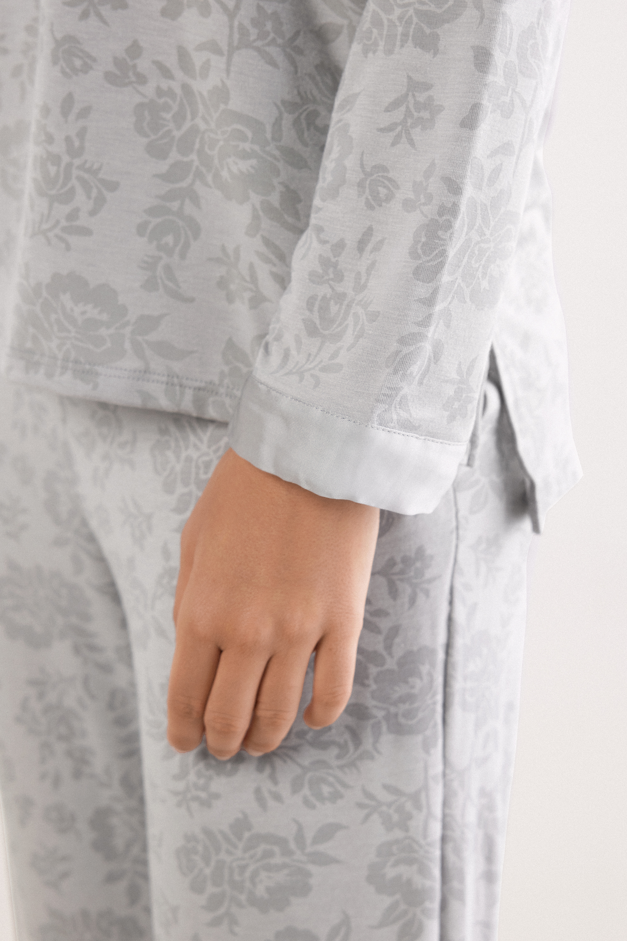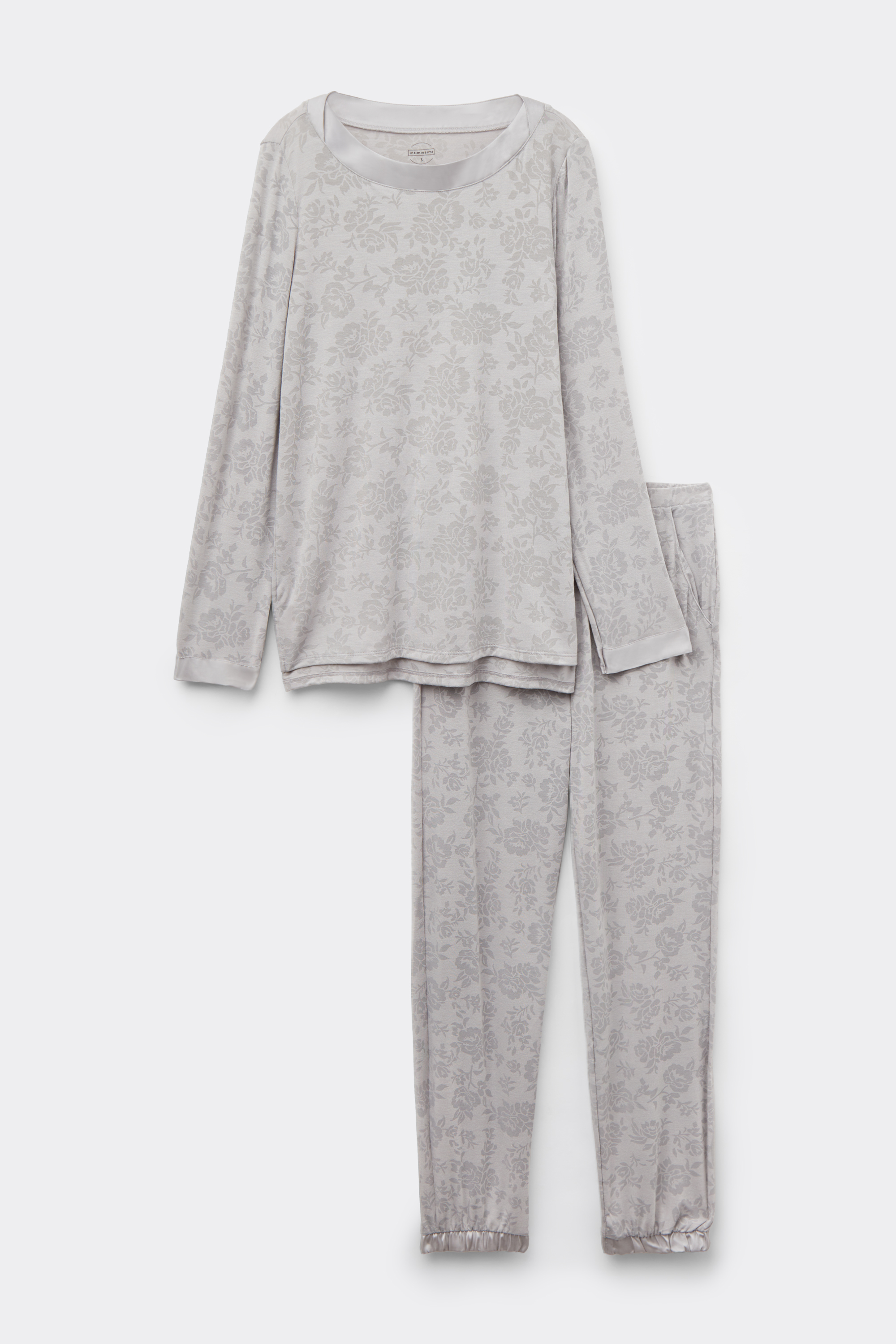 Длинная пижама из мягкого джерси на основе модала. Цветочный узор в технике деворе придает образу романтические нотки. Элегантная атласная отделка в тон изделию.