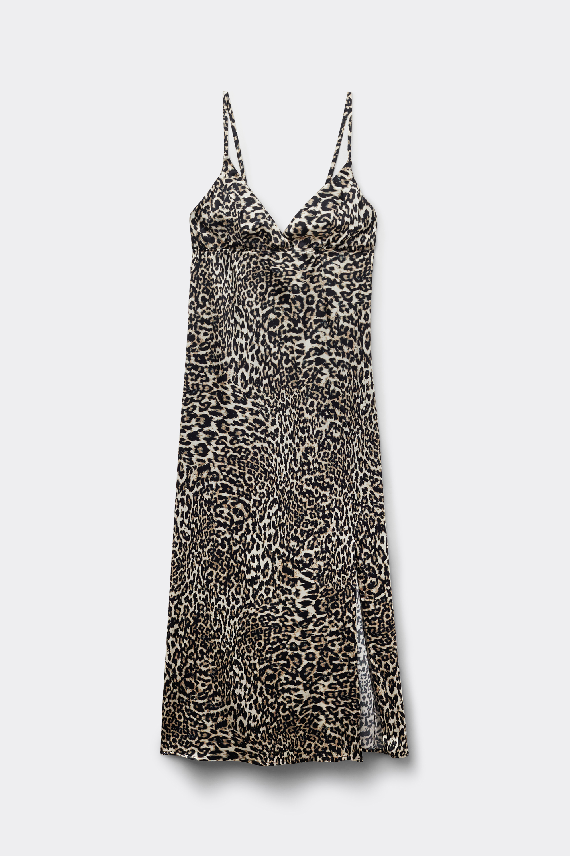 Длинная комбинация из слегка эластичного шелкового атласа с анималистичным принтом. Чувственная деталь: разрез с левой стороны. Идеальный выбор для тех, кто ищет гламурное нижнее белье, которое можно носить и как платье.