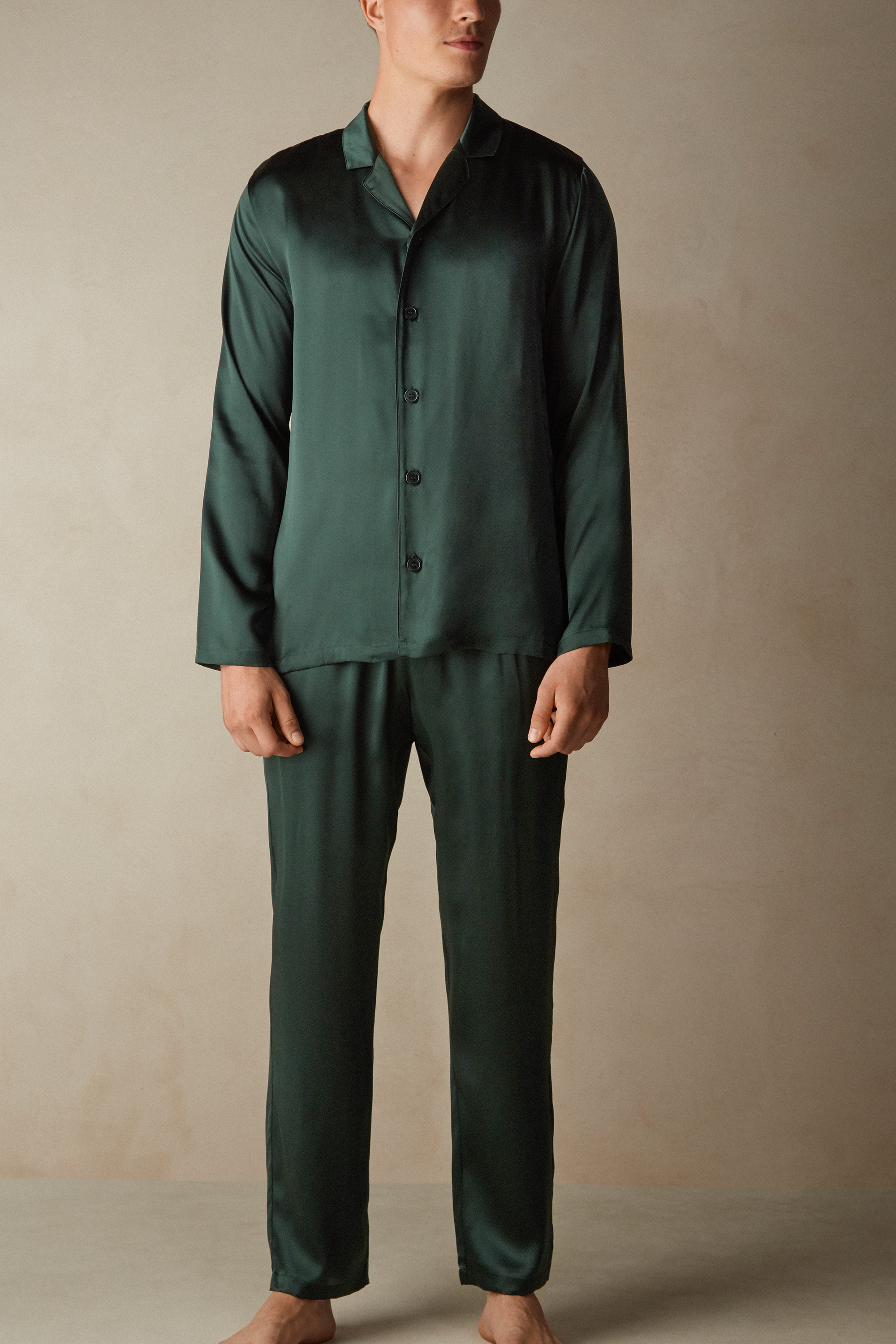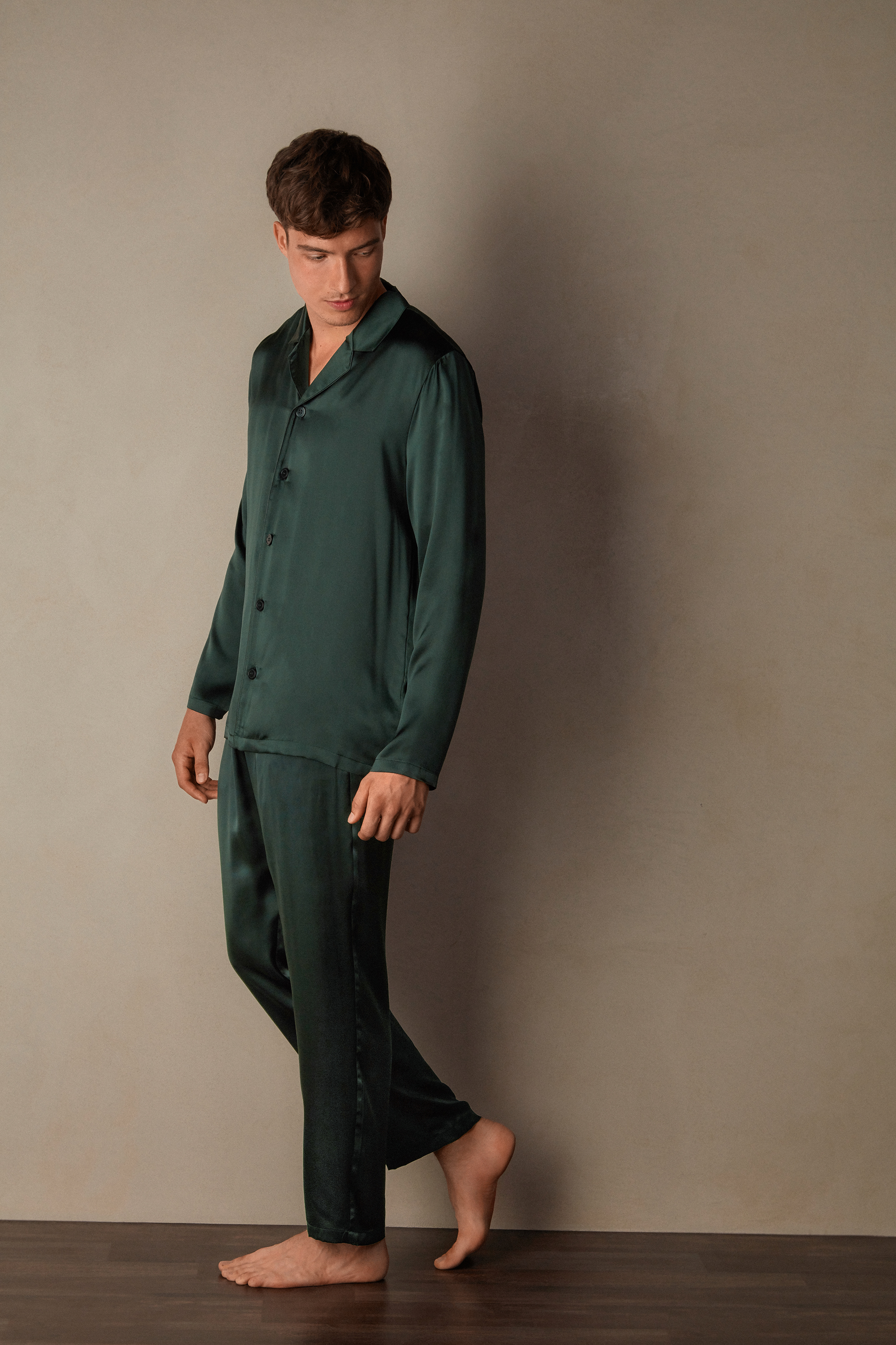 Мужская пижама с топом и брюками из тонкого шелка. Топ на пуговицах. Эластичный пояс.