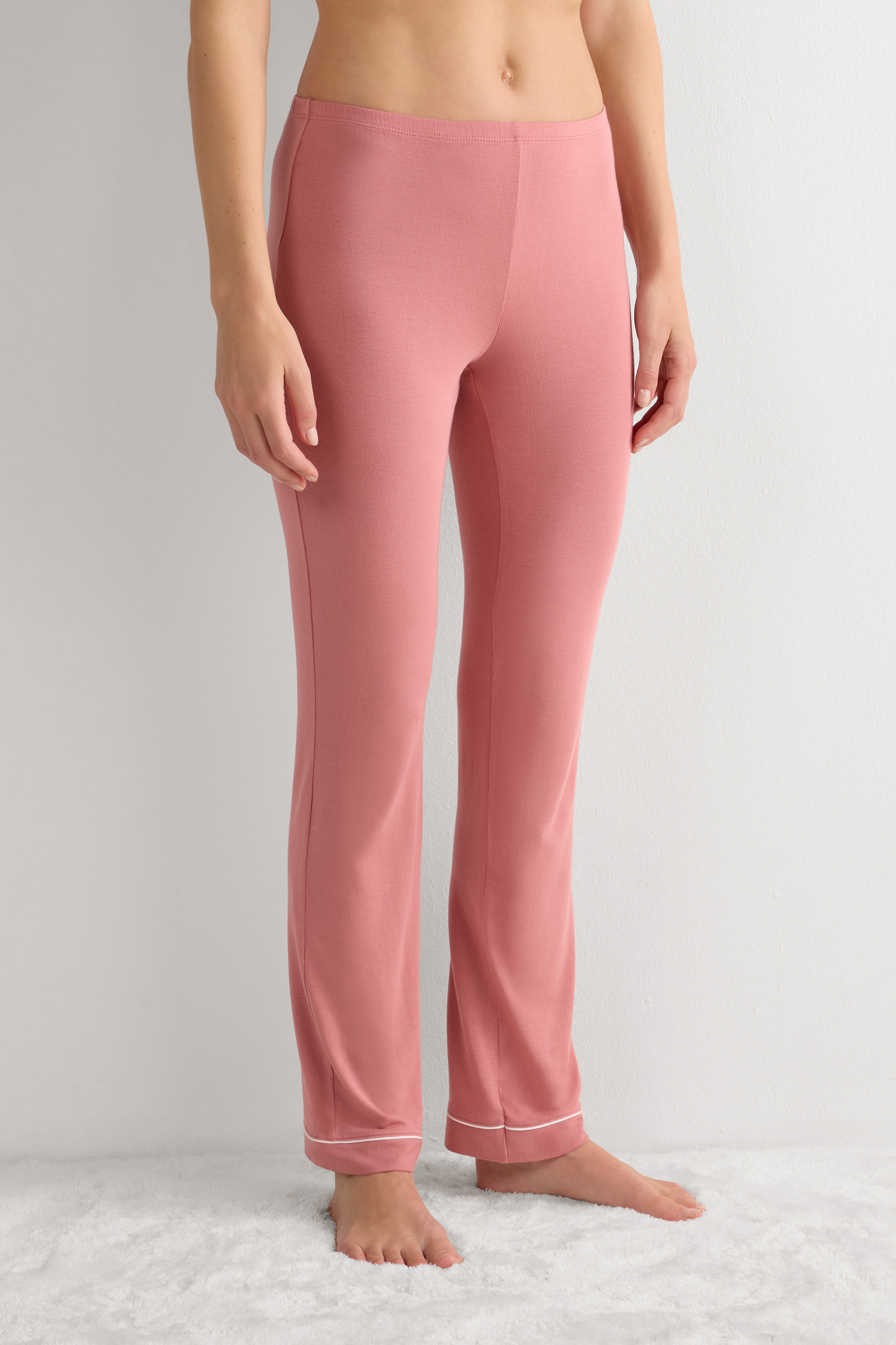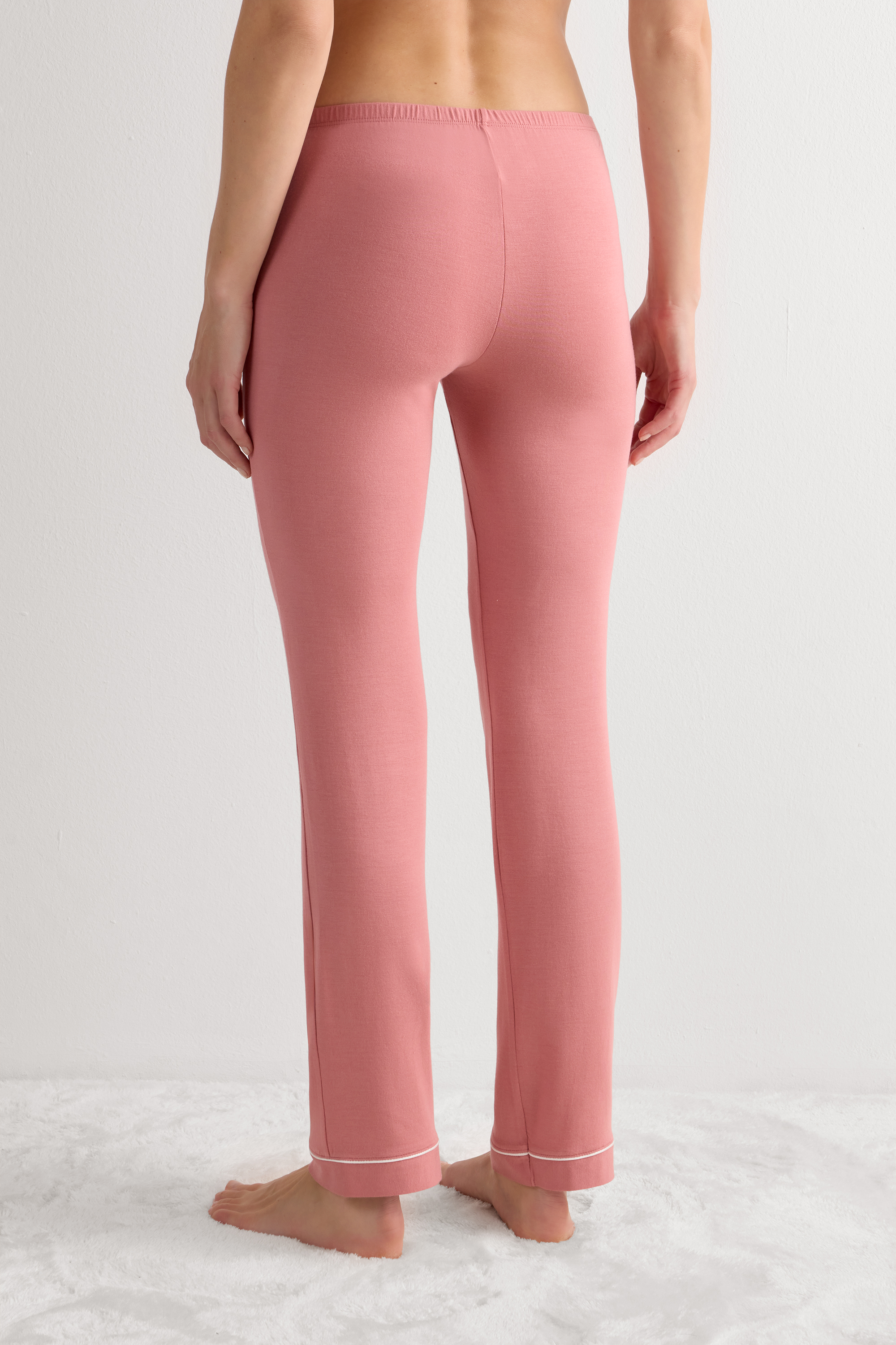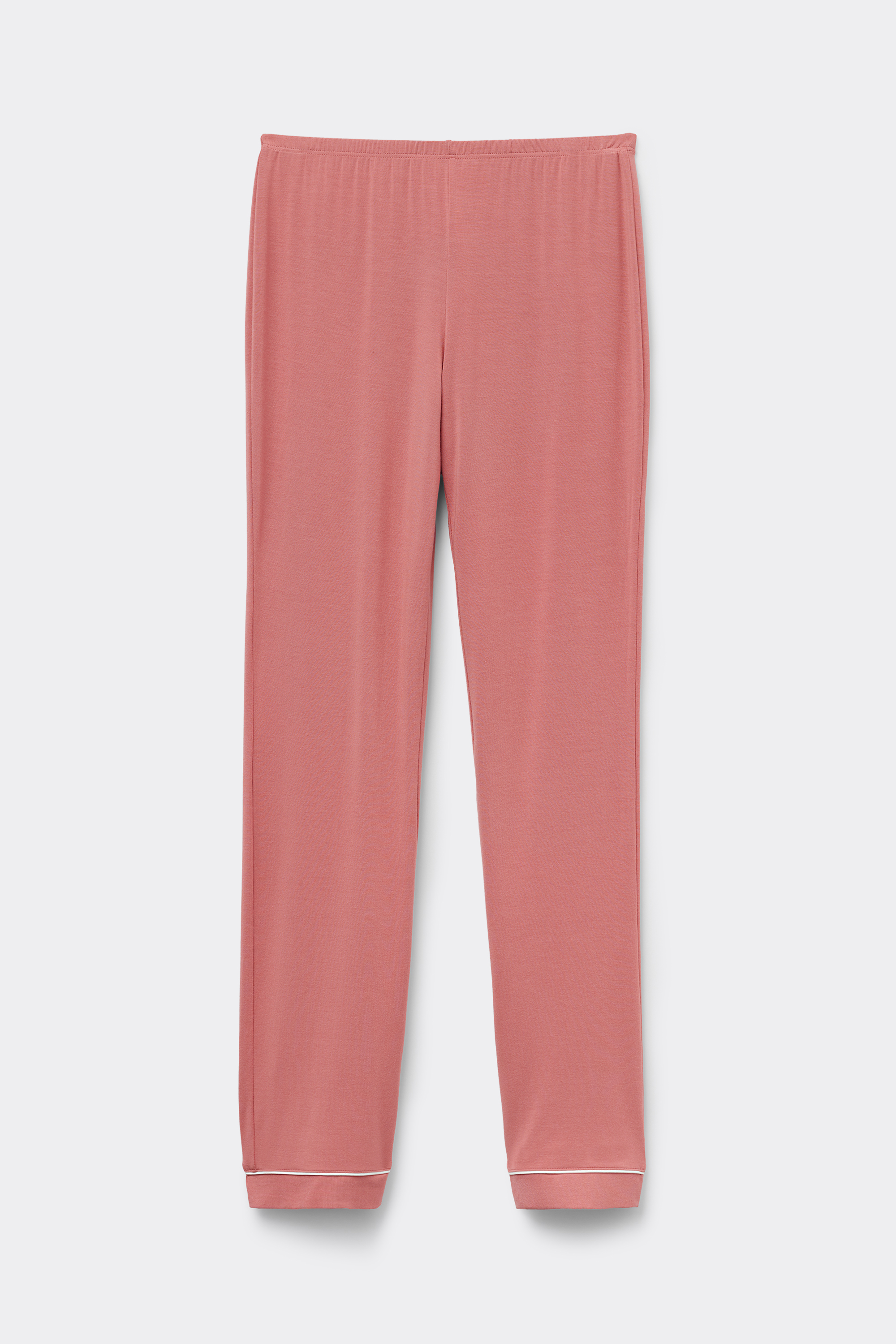 Длинные брюки из микромодала. Украшены контрастной атласной окантовкой.
