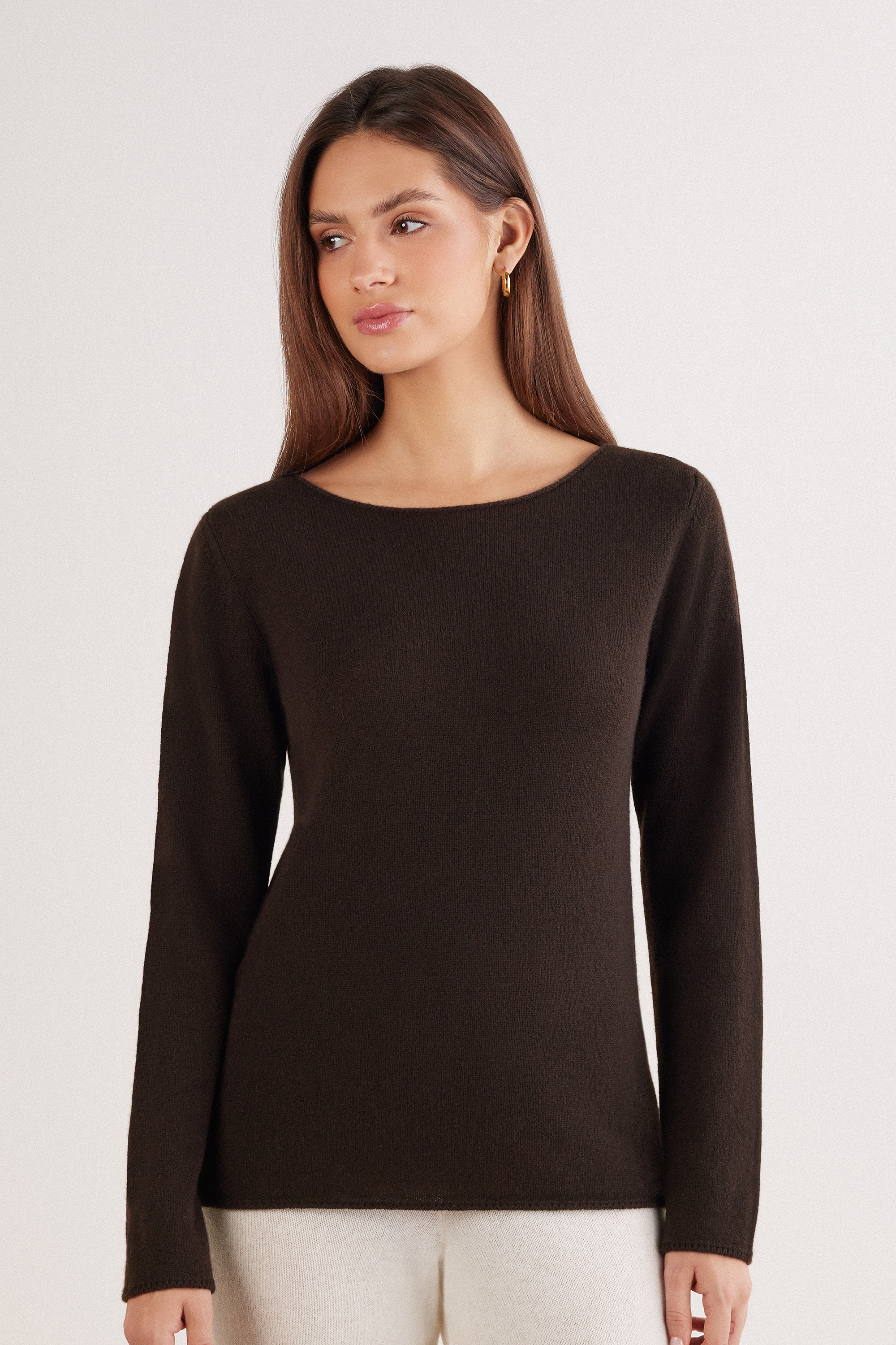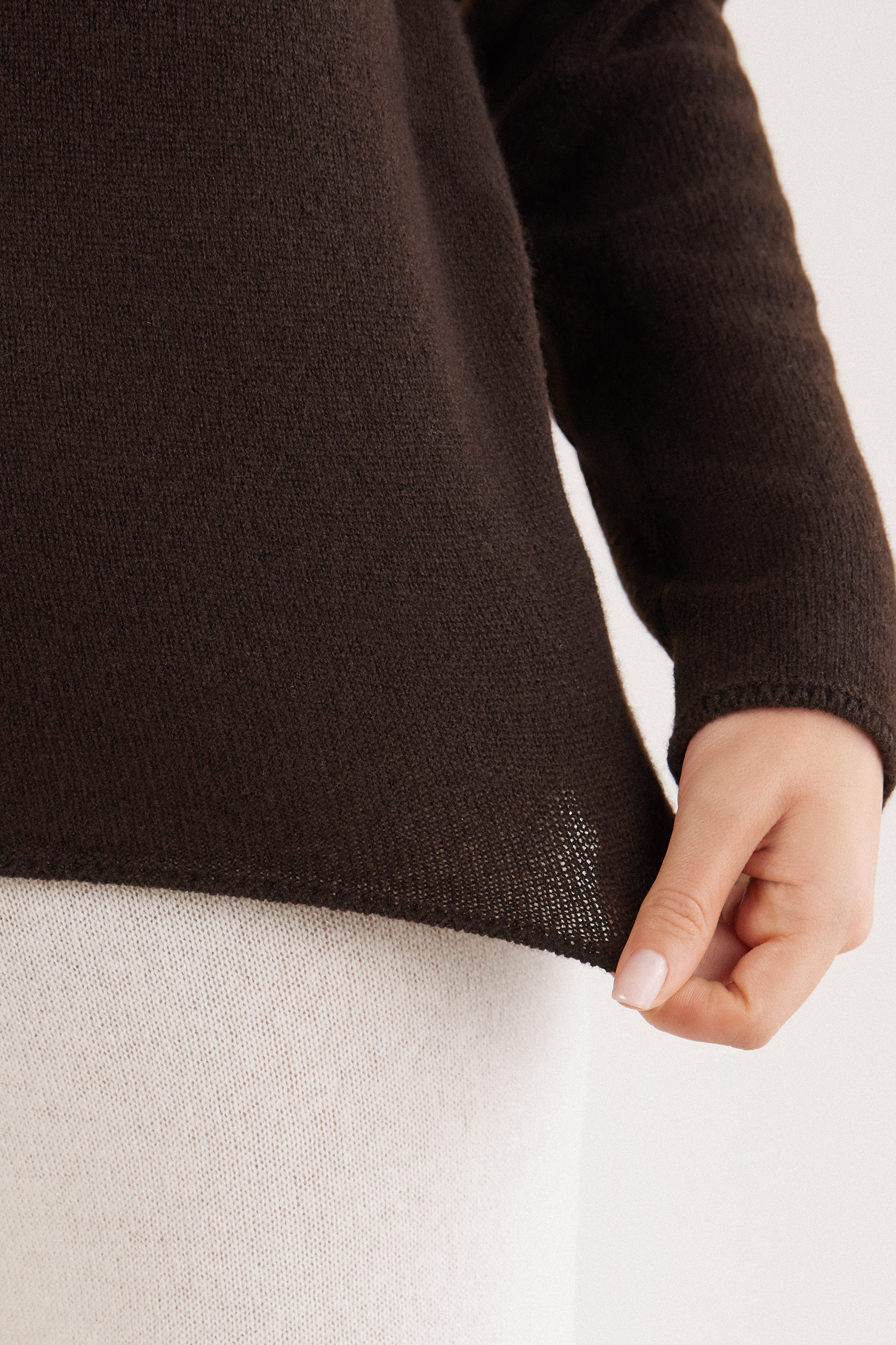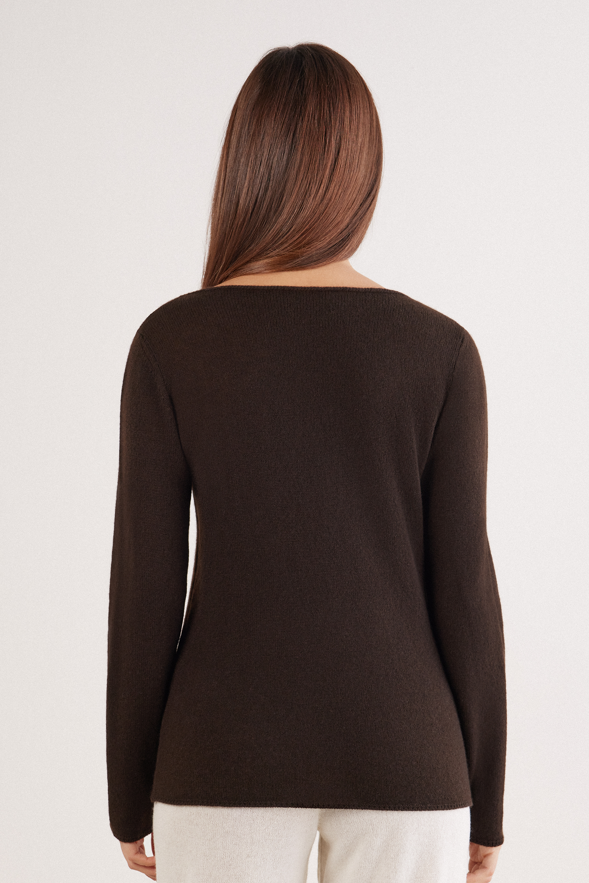 Джемпер чулочной вязки из 100% кашемира. Мягкая облегающая модель подчеркивает естественный силуэт. Отделка тамбурным швом. Идеально сочетается с топом из модала Ultralight с кашемиром: этот уютный комплект окутает вас словно мягкими теплыми объятиями.