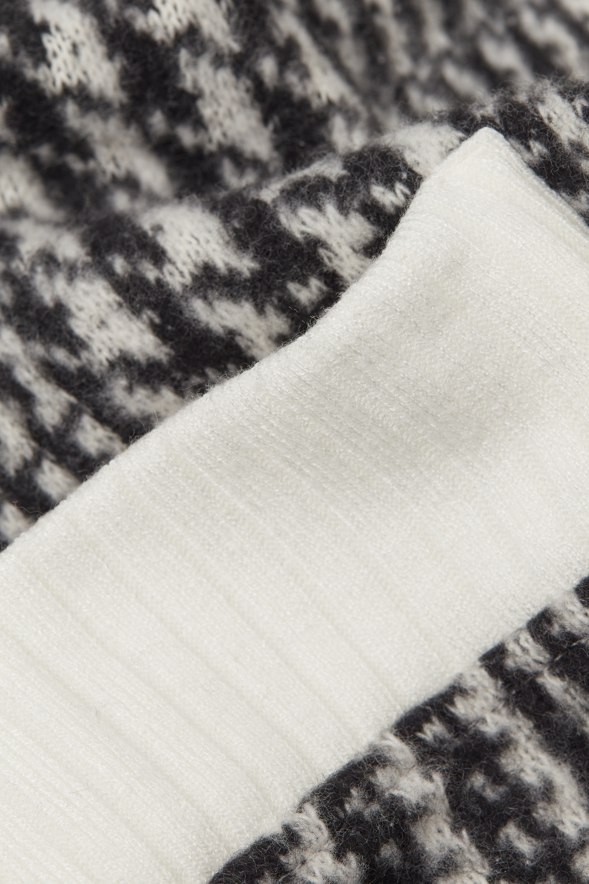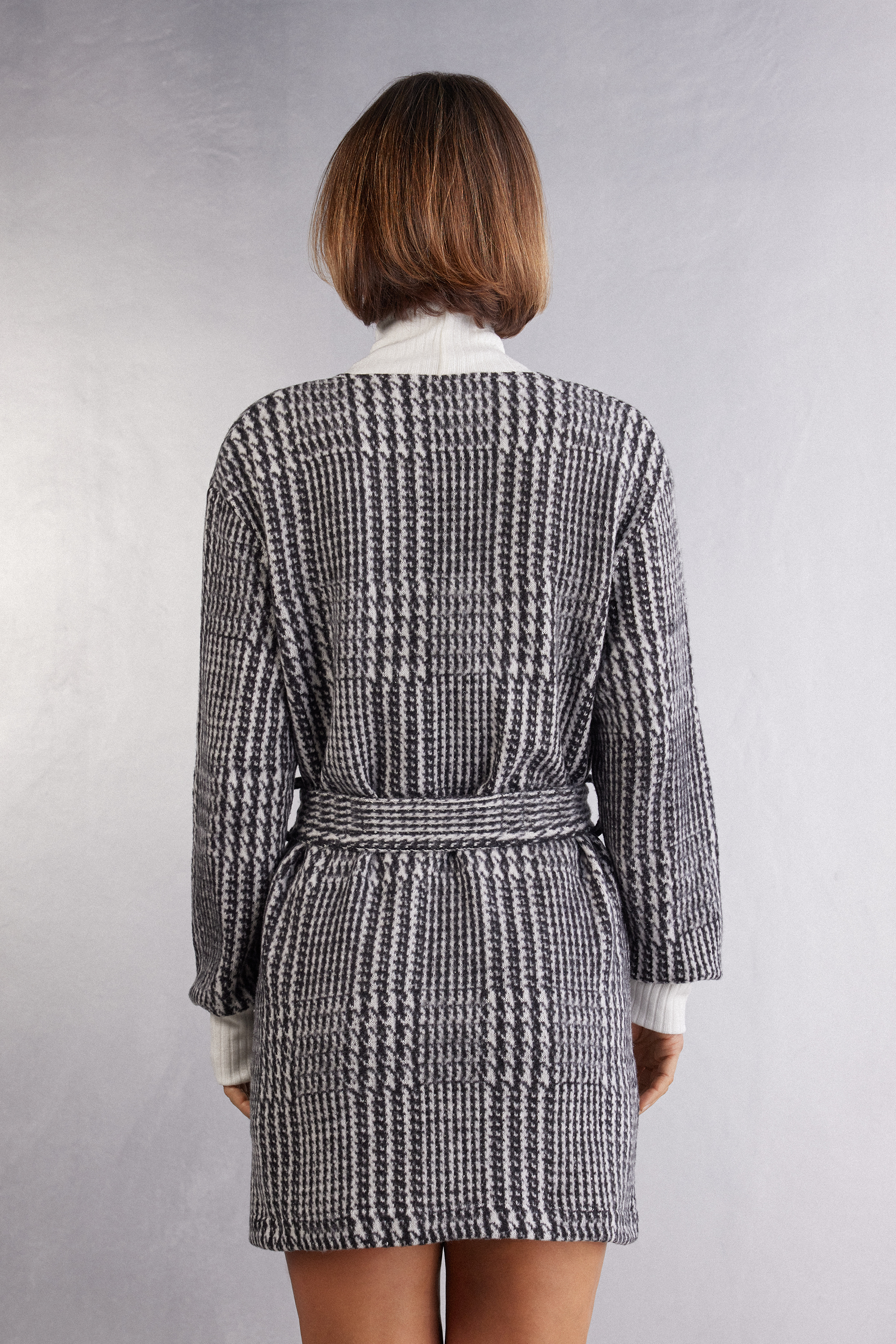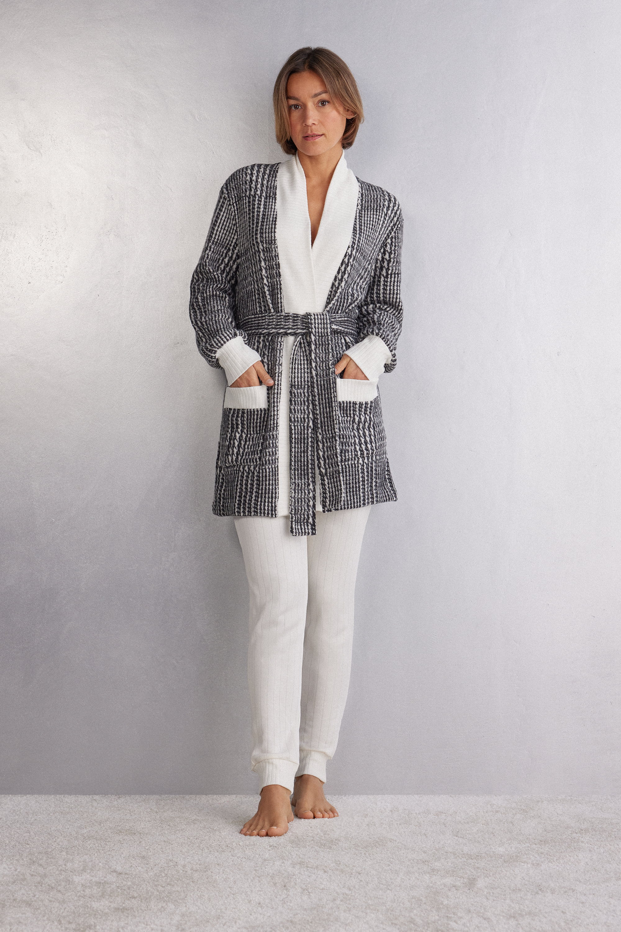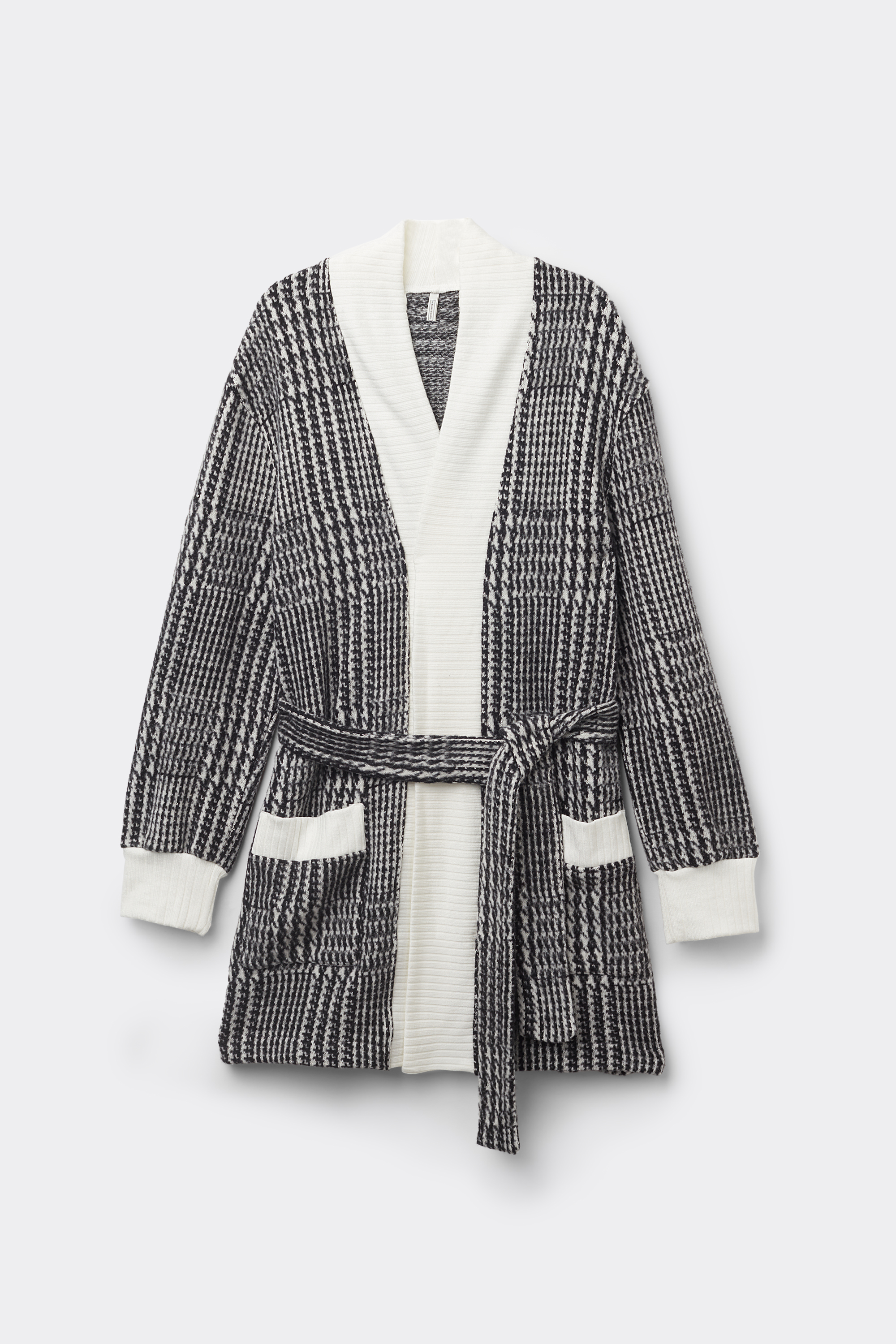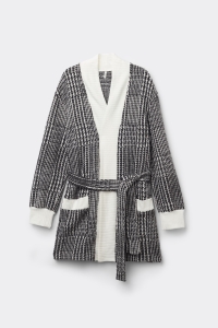 Мягкий халат из трикотажной ткани с узором «гленчек». Контрастная отделка в рубчик. Пояс на талии.