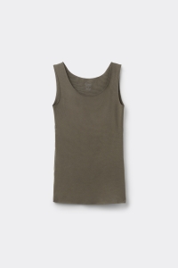 Майка с широкими бретелями и низким круглым вырезом. Модель из эластичного хлопка с открытыми срезами. Рост модели: 179 см. Размер изделия на фотографии: S.